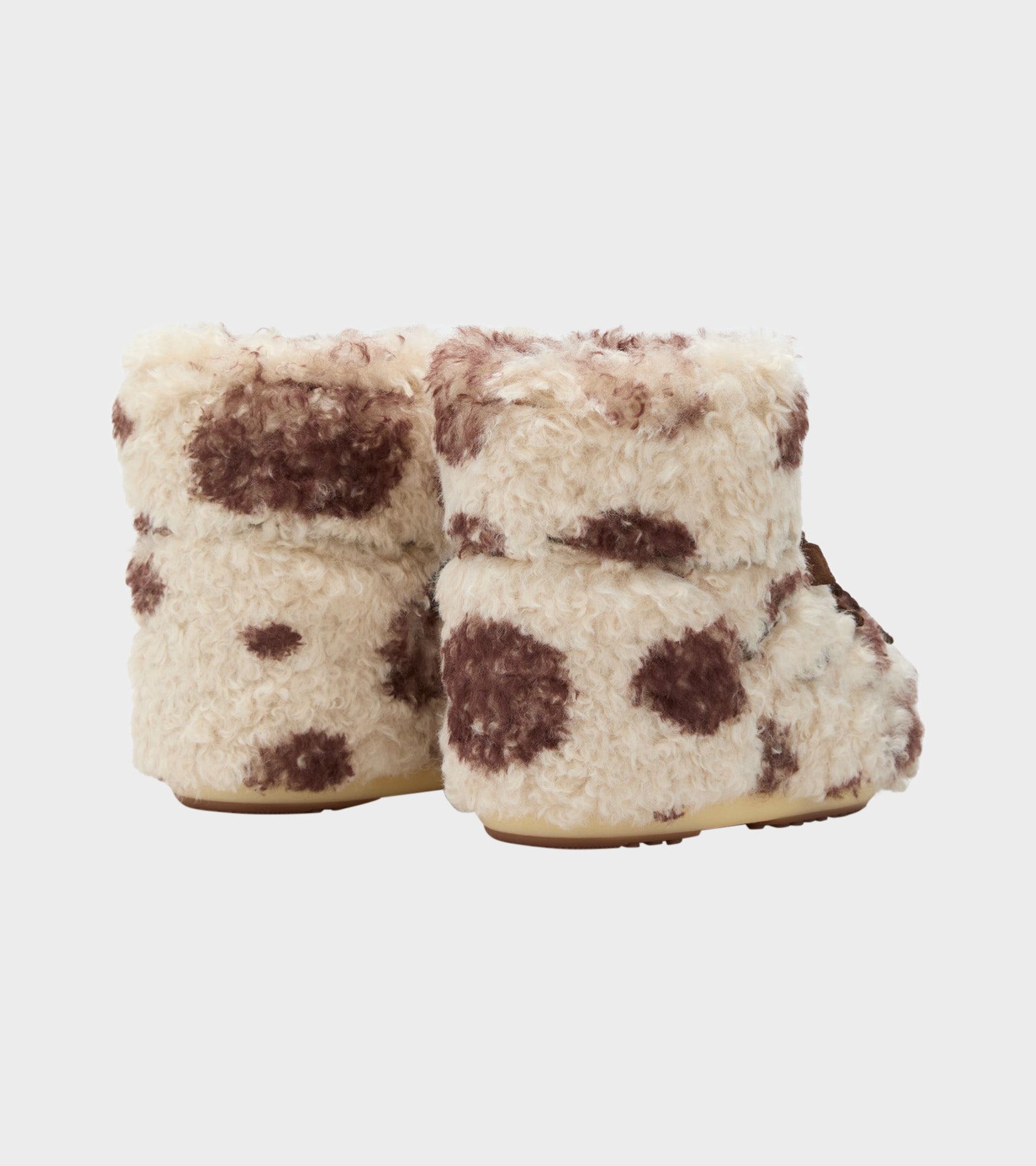 The iconic Moon Boots - this version has an upper in cow-spotted imitation curly shearling. This boot is regular in size, but can appear oversized due to the structure of the boot. Moon Boots have a round toe and is lined with foam. The thick foam makes the boot very comfortable, which makes this boot the perfect choice of winter boot.