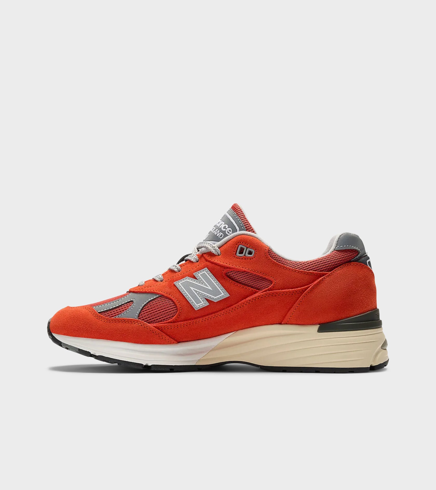 The iconic 991 from New Balance in an orange version. These sneakers feature a suede upper, leather overlays, and mesh details. The iconic 'N' is on the side. The shoe has a 'FuelCell' midsole and logo embroideries on the side, tongue, and heel. U991VO2 is produced in England.