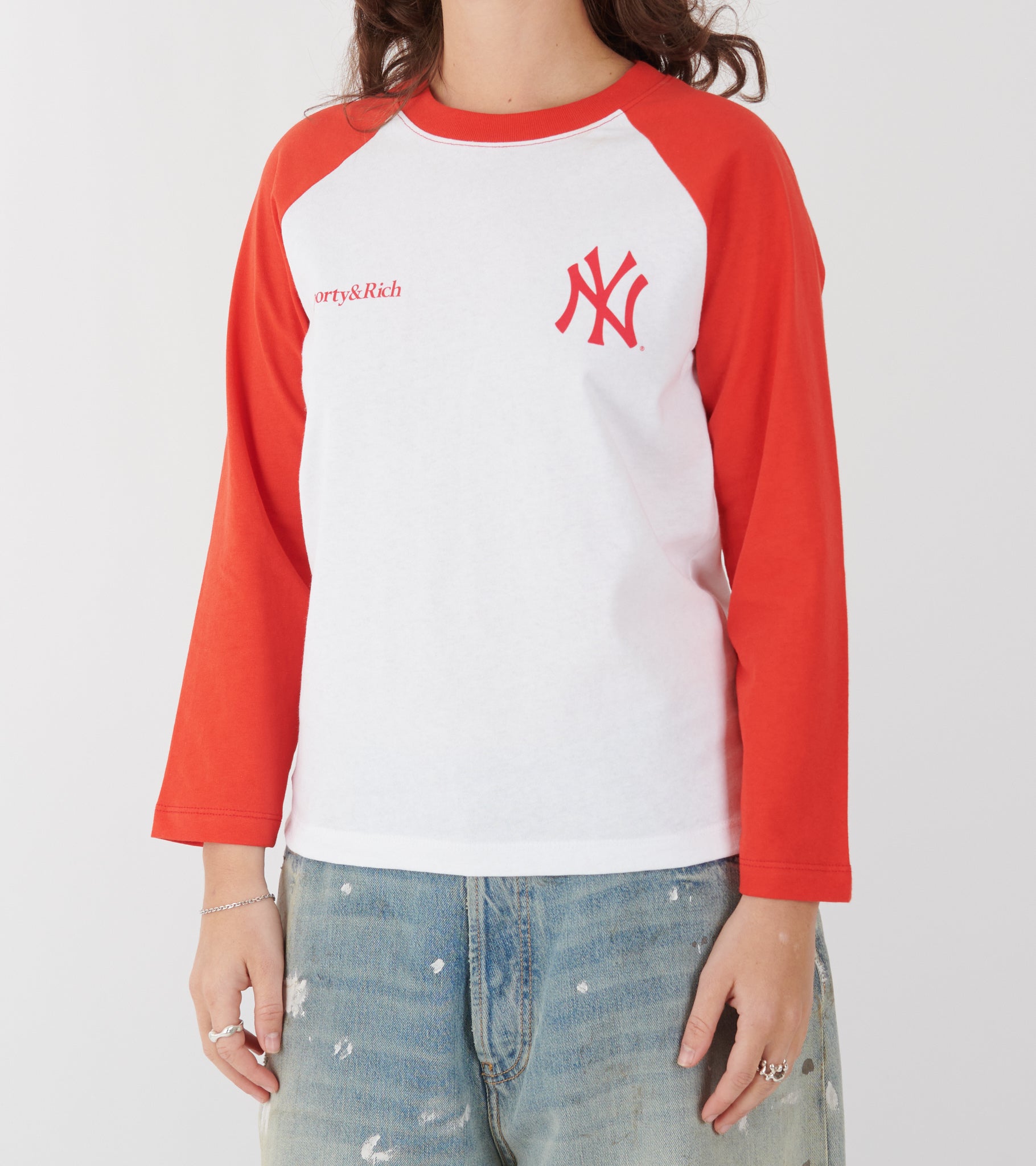 Red and white t-shirt from Sporty & Rich in collaboration with New York Yankees.