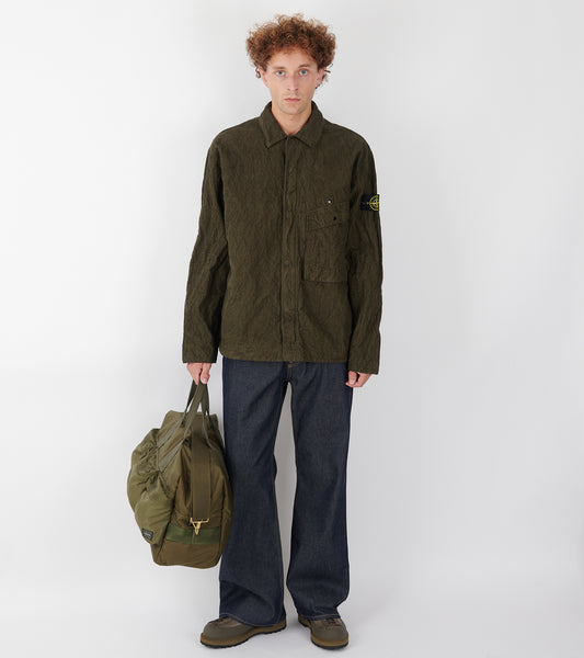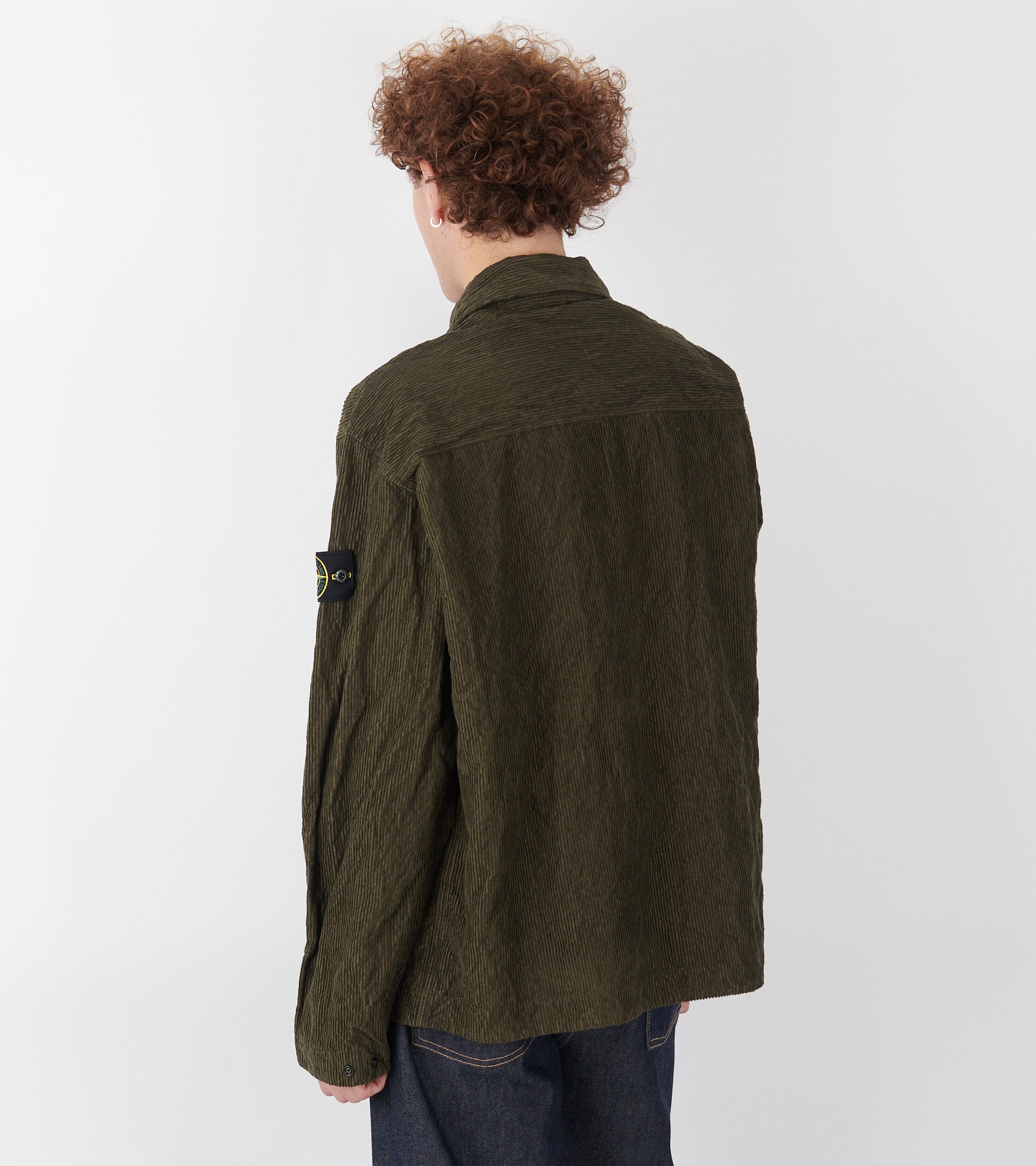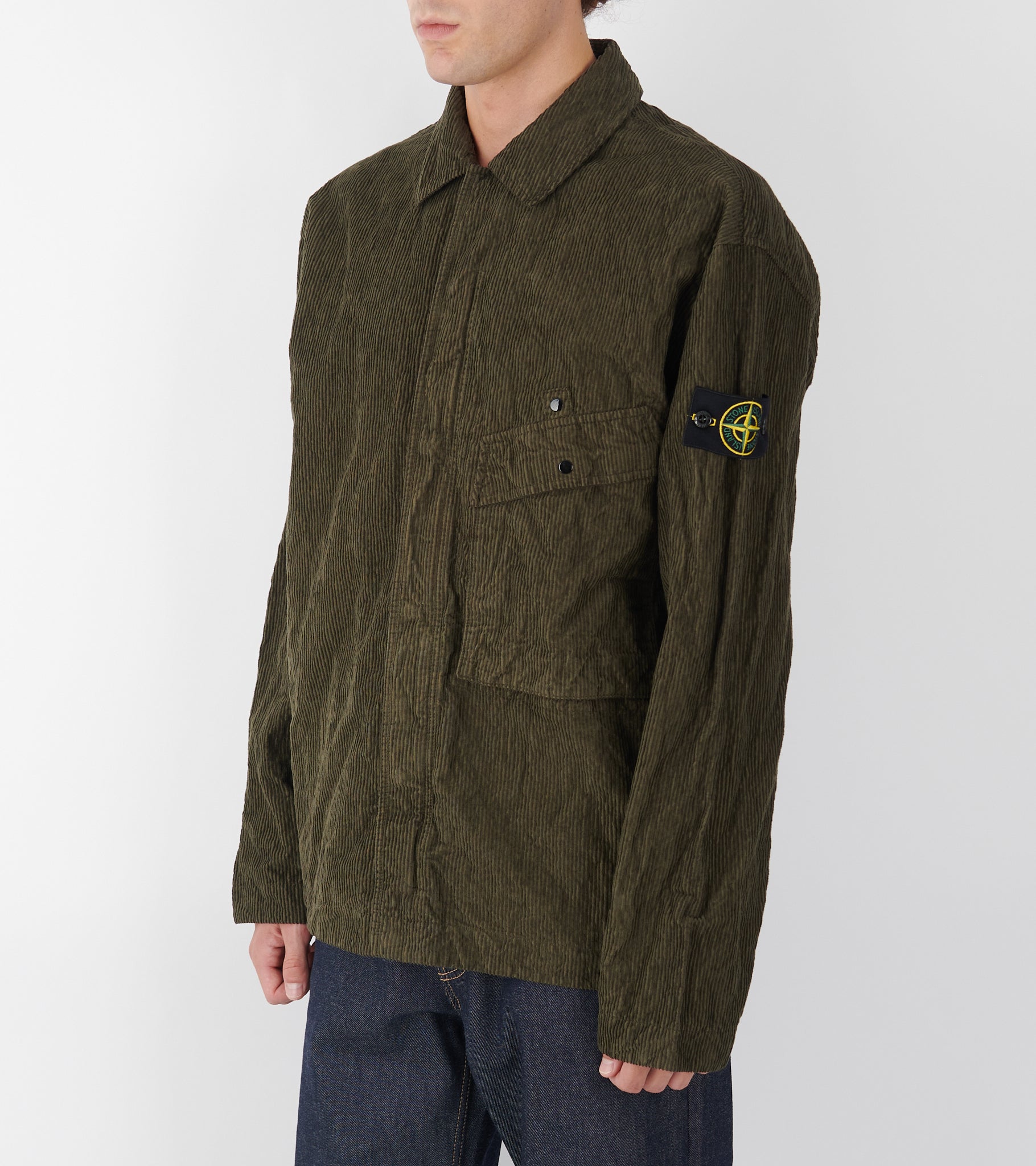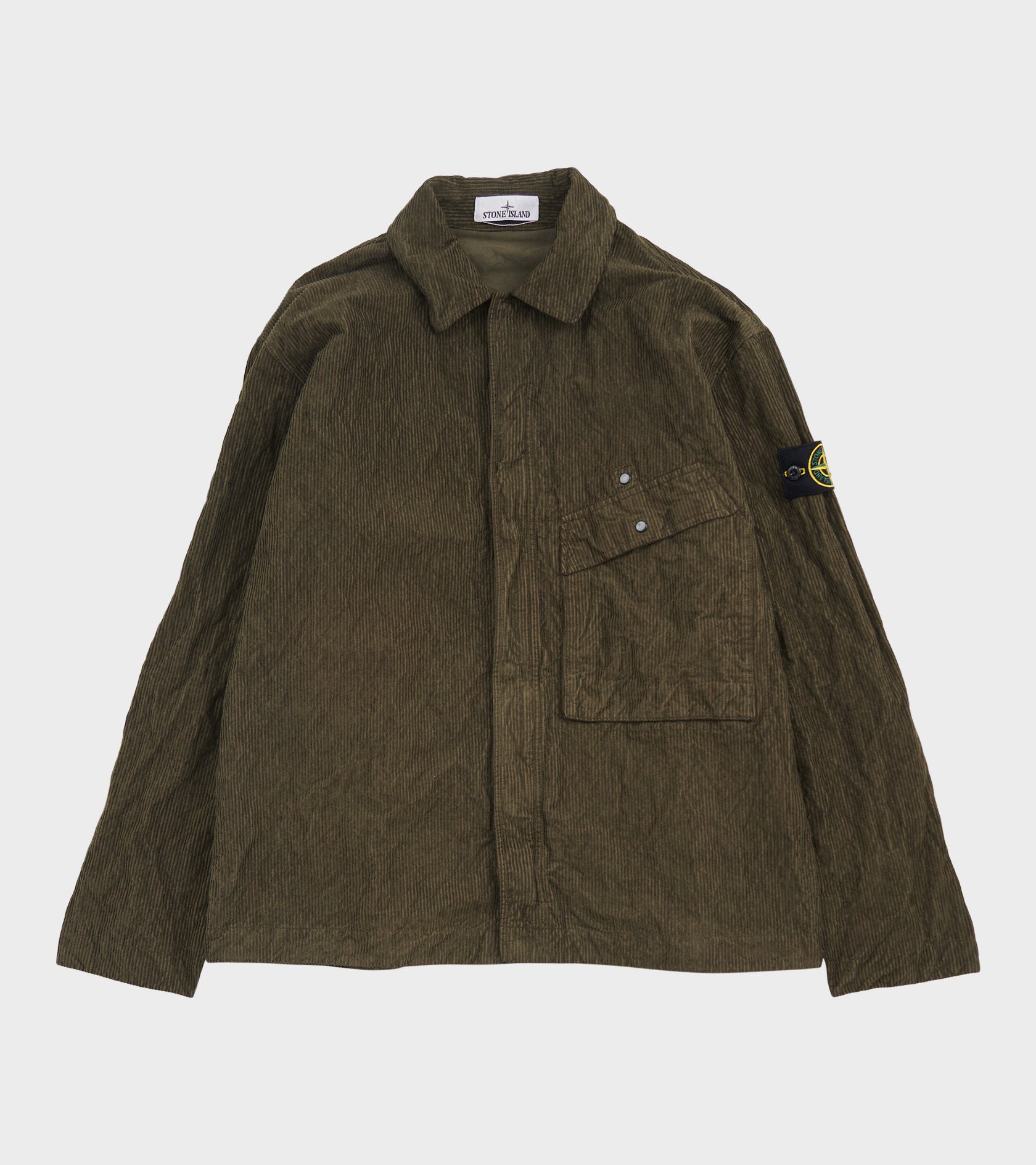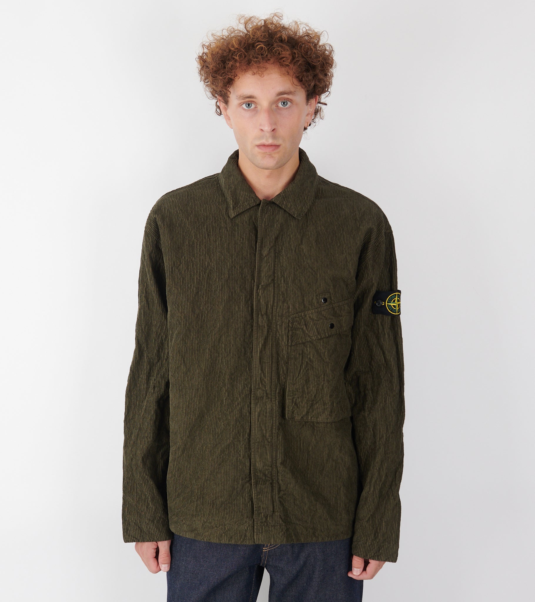 Olive green cotton corduroy overshirt from Stone Island. This overshirt has a concealed two-way zip closure and a concealed snap button closure. It has a classic collar, a large pocket on the front and the iconic Stone Patch on the left sleeve.