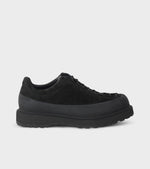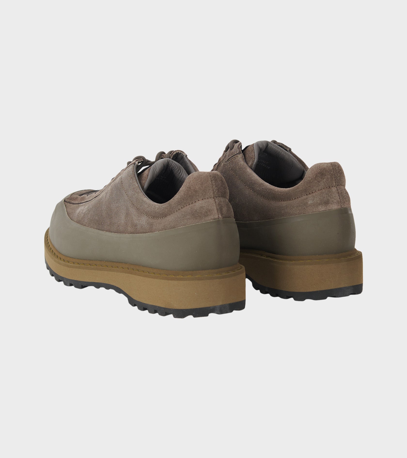 Olive green sneakers from Stone Island in collaboration with Diemme. These sneakers have a suede upper, leather details and a chunky toe and rubber sole. The shoe has a classic lace-up closure that goes all the way to the toe. The iconic Stone Island logo is embroidered on the tongue.