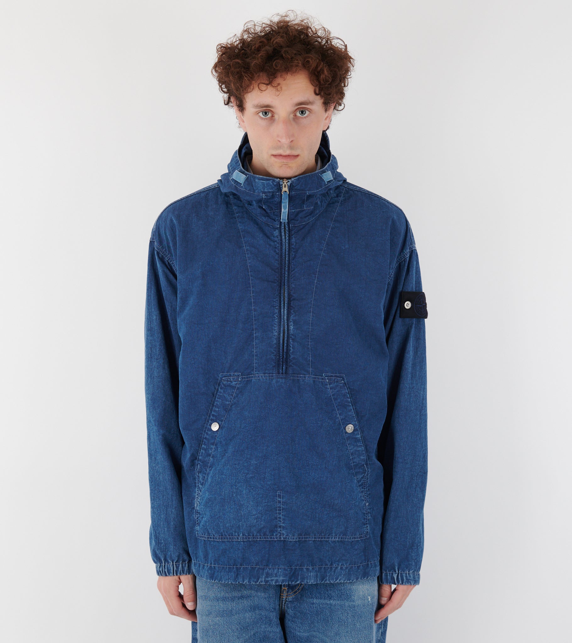 Blue jacket in garment dyed nylon from Stone Island's 'Denim Research' collection. The jacket's color is made with a special garment dyed 'indigo marmo' technique. It has a classic hood, a zip closure and a kangaroo pocket on the front. On the left sleeve is the iconic Stone Patch.