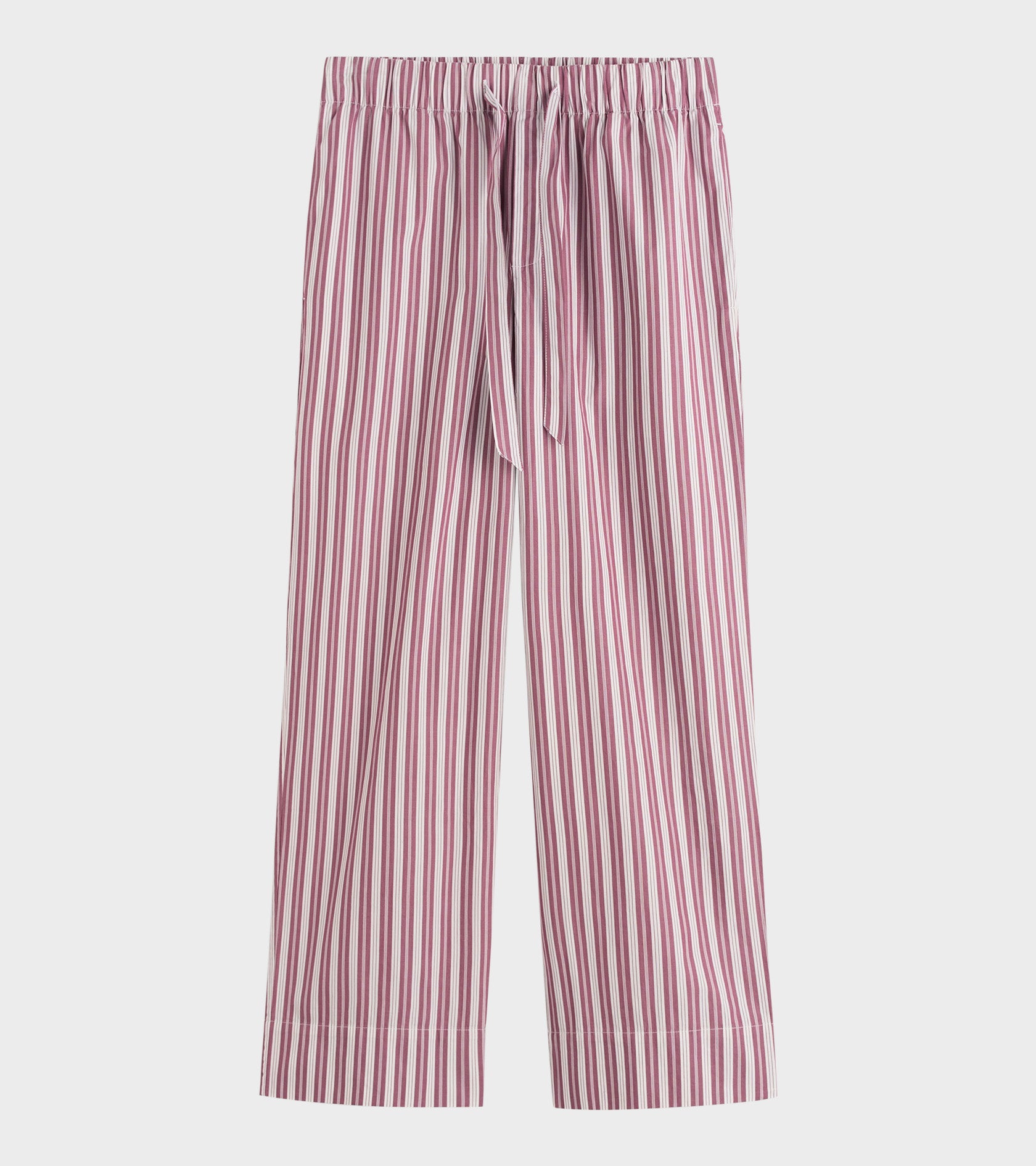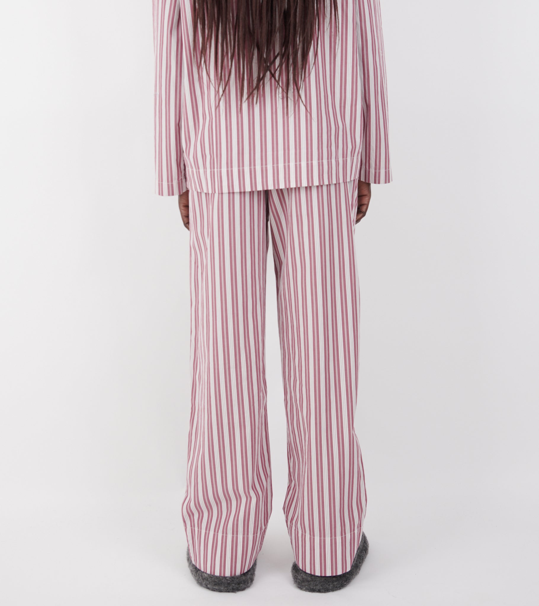 Unisex sleepwear from Tekla in the color 'Rhubarb Stripes'. All sleepwear is made of organic cotton and has been produced in Portugal. The pants have an elastic waist with a drawstring and pockets on the sides and back. On the back pocket is a logo tag.