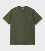 Black t-shirt from Carhartt WIP. The S/S American Script T-shirt has an embroidered Carhartt WIP logo on the left chest. This t-shirt is made from organic cotton and has a relaxed fit.