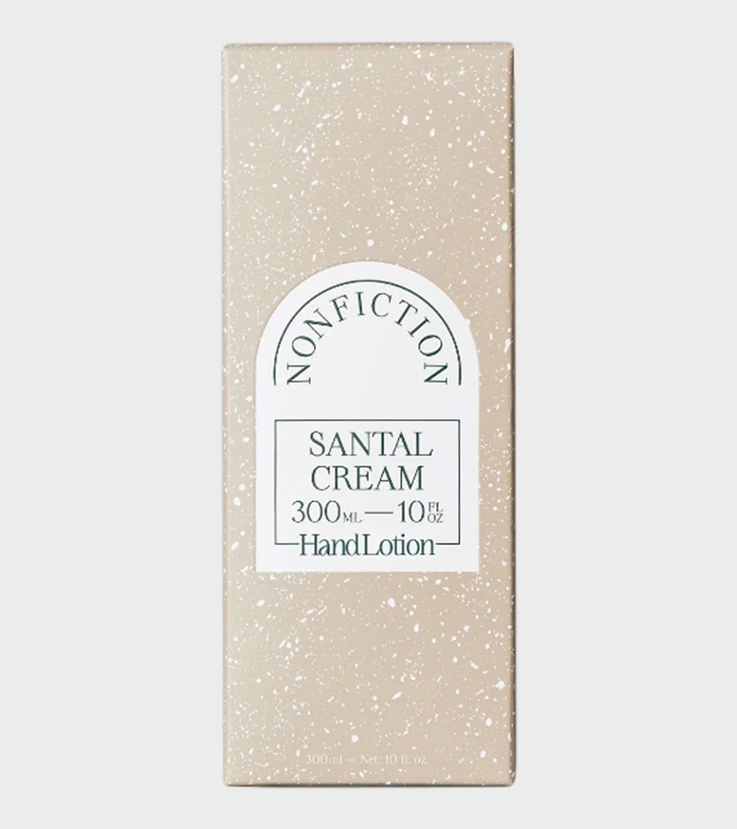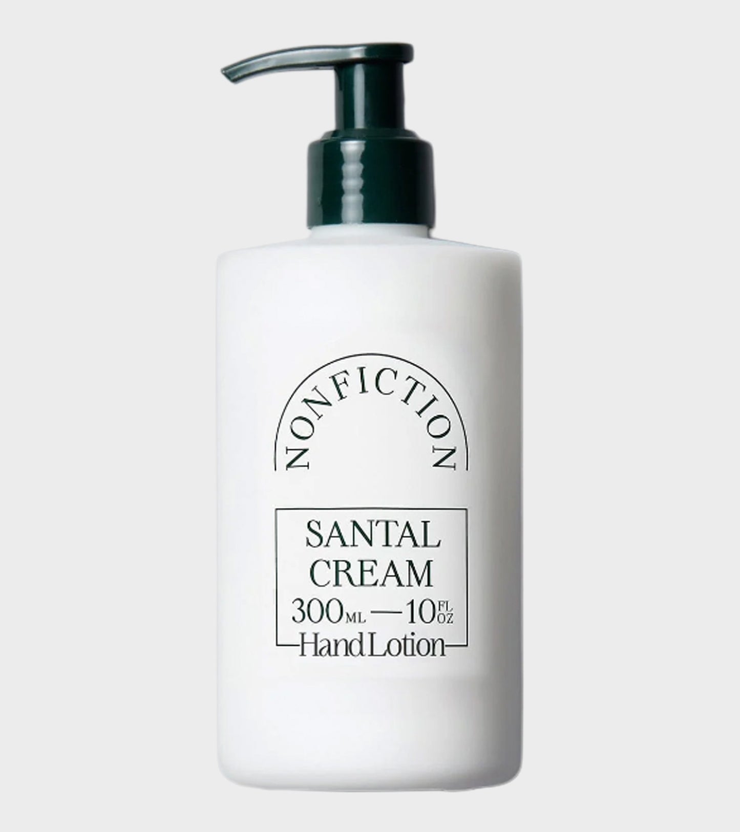 Santal Cream hand lotion from Nonfiction. This hand lotion is enriched with hyaluronic acid and shea butter to instantly moisturize the skin . It contains 300 ml and has fragrance notes of sandalwood, vetiver, figs, cardamom, ginger and bergamot.