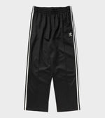 Black track pants from Adidas. These track pants have elastic and an inner tie at the waist, a slant pocket on each side and the iconic white stripes down the side. On the left side is an embroidered logo. The fit is slightly relaxed.
