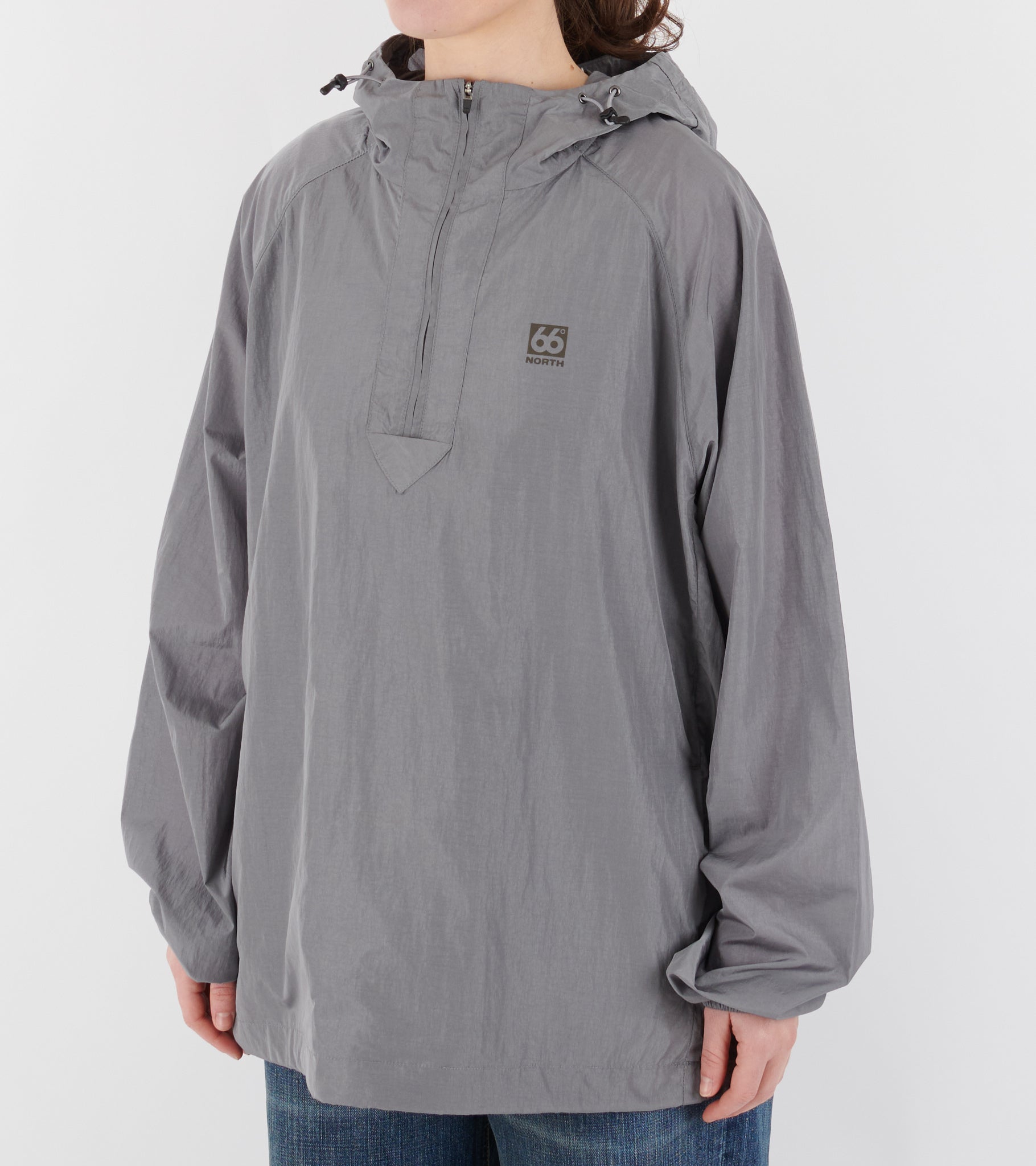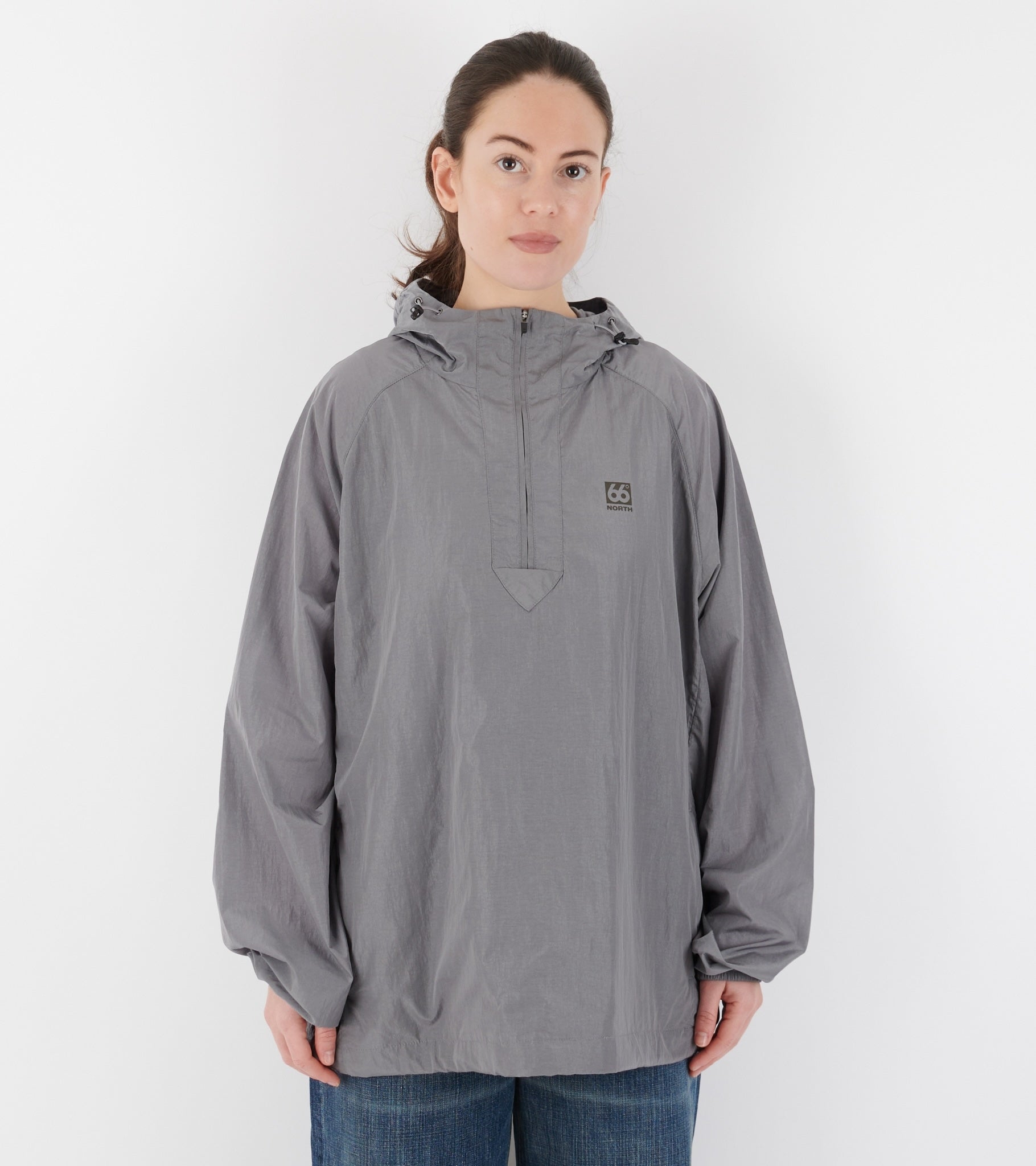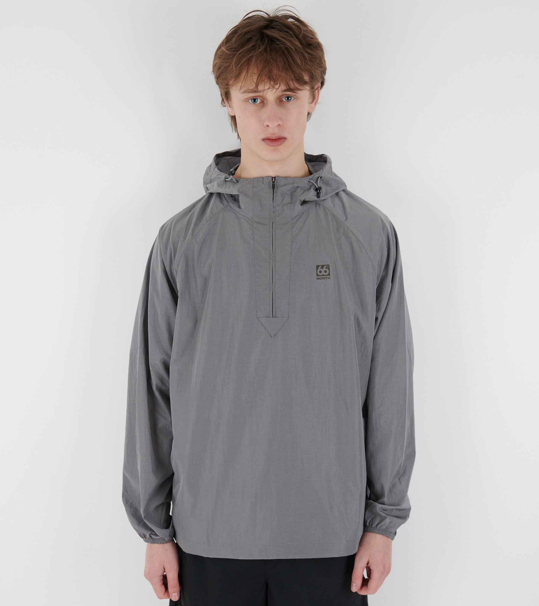 Grey anorak from 66 North. Hofdi Anorak is made of windproof nylon and has an adjustable hood, a half-zip closure and a slanted pocket on each side. On the left chest is an embroidered logo.