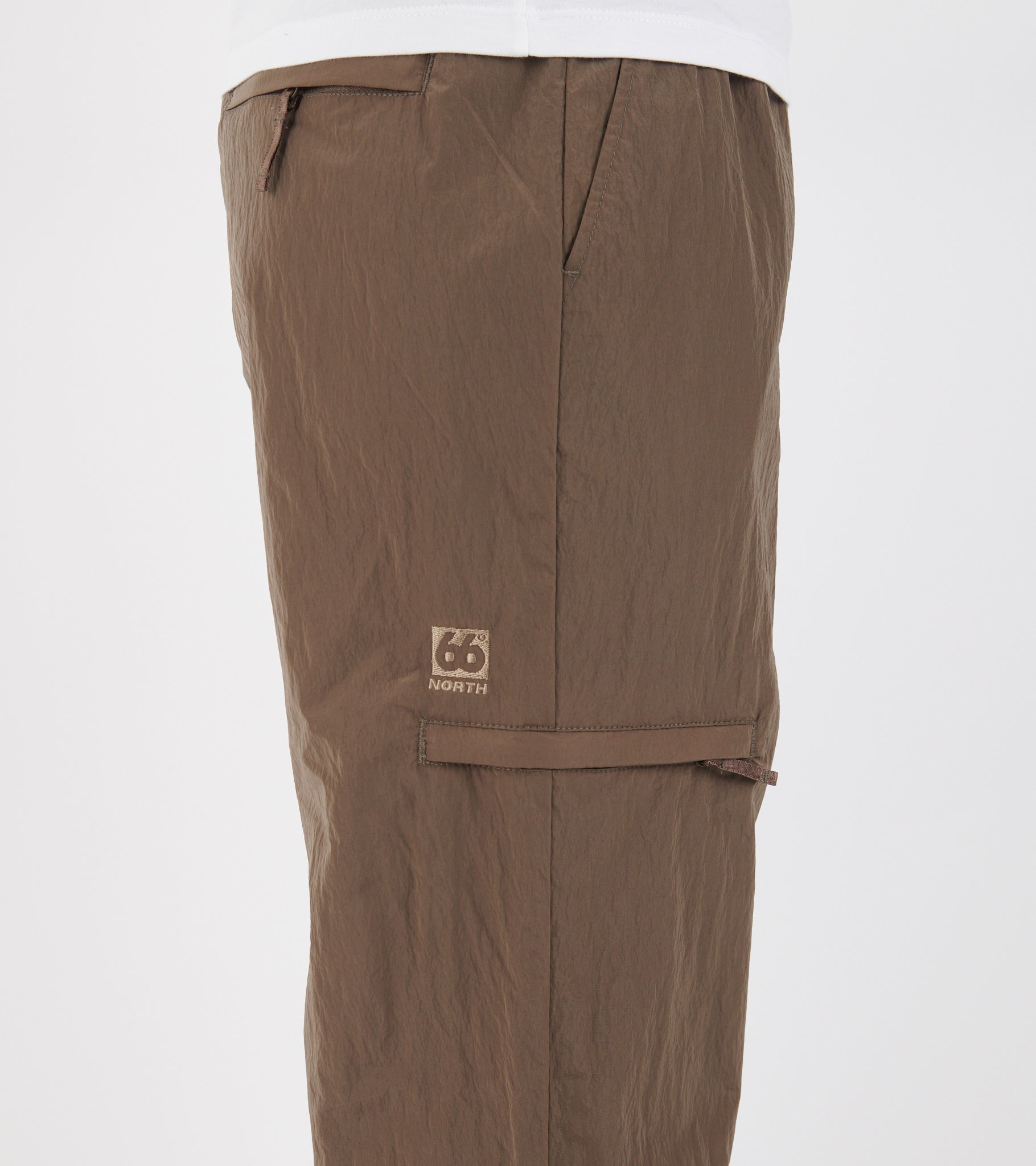 Brown lightweight windbreaker pants from 66 North. Kjalarnes Windbreaker Pants are made of wind-resistant nylon and have full mesh lining for increased breathability. The pants have an elastic waistband, a slanted pocket on each side, a zipper pocket on the thigh and a zipper pocket on the back. On the side of the leg is a small reflective logo.
