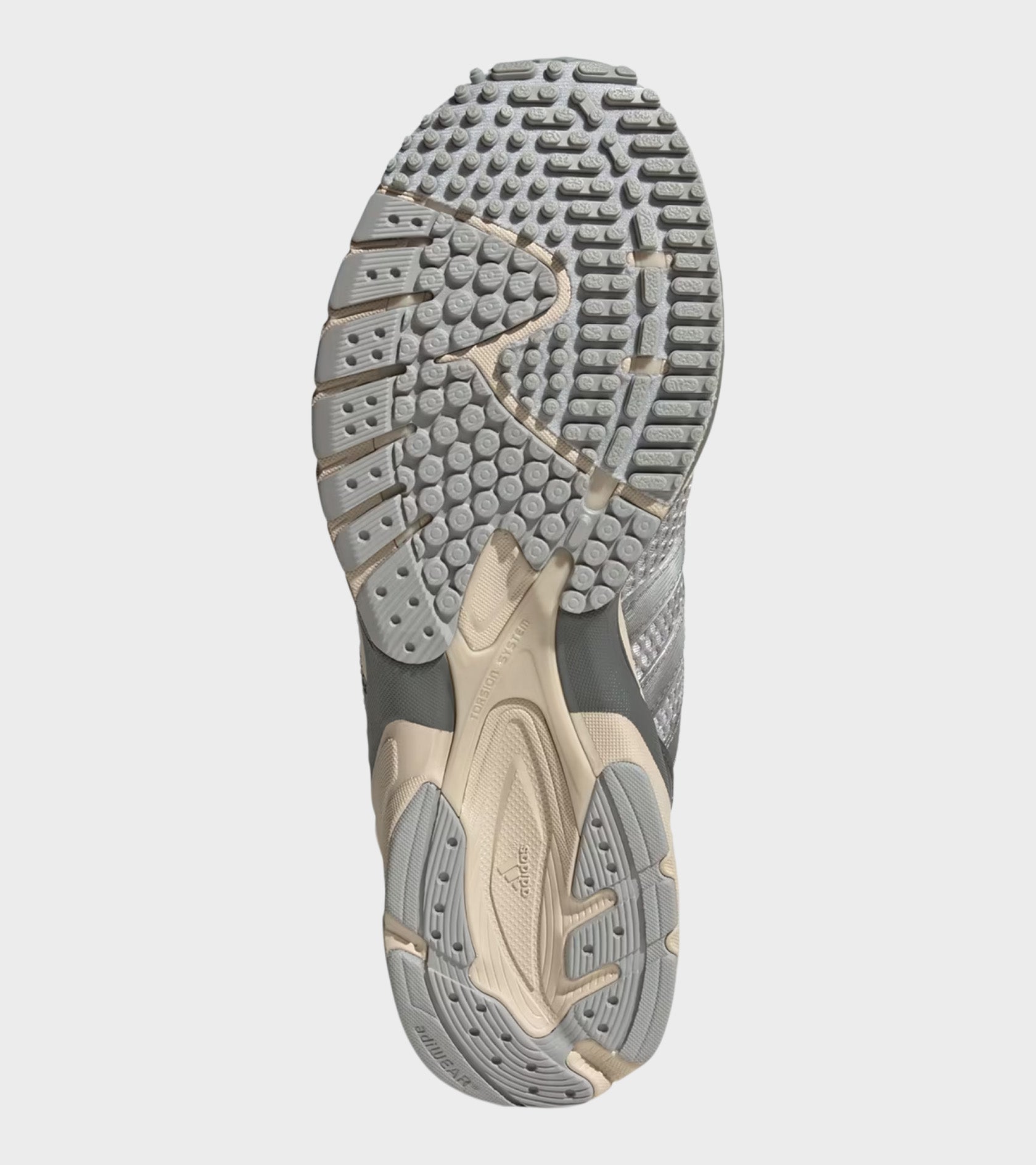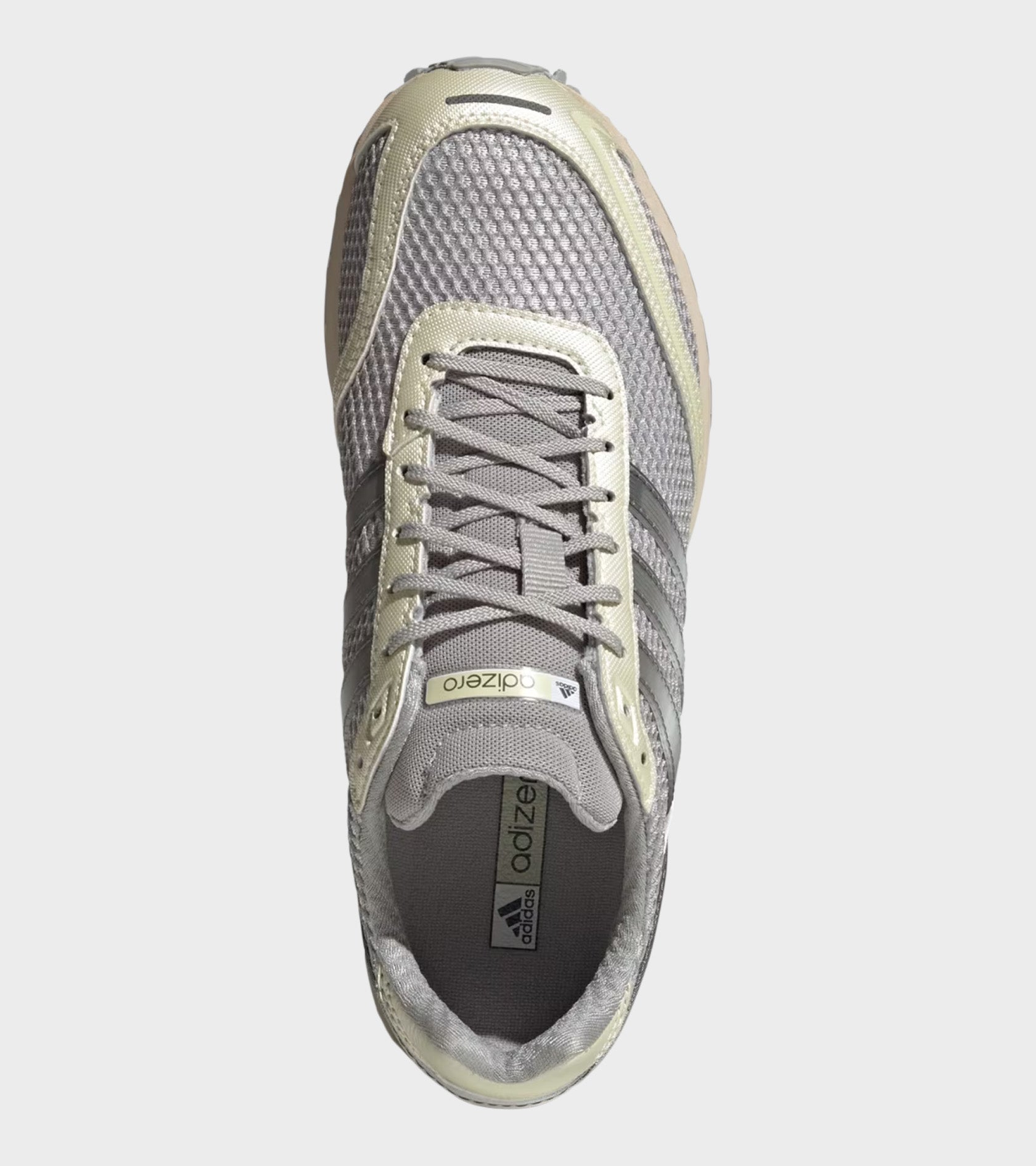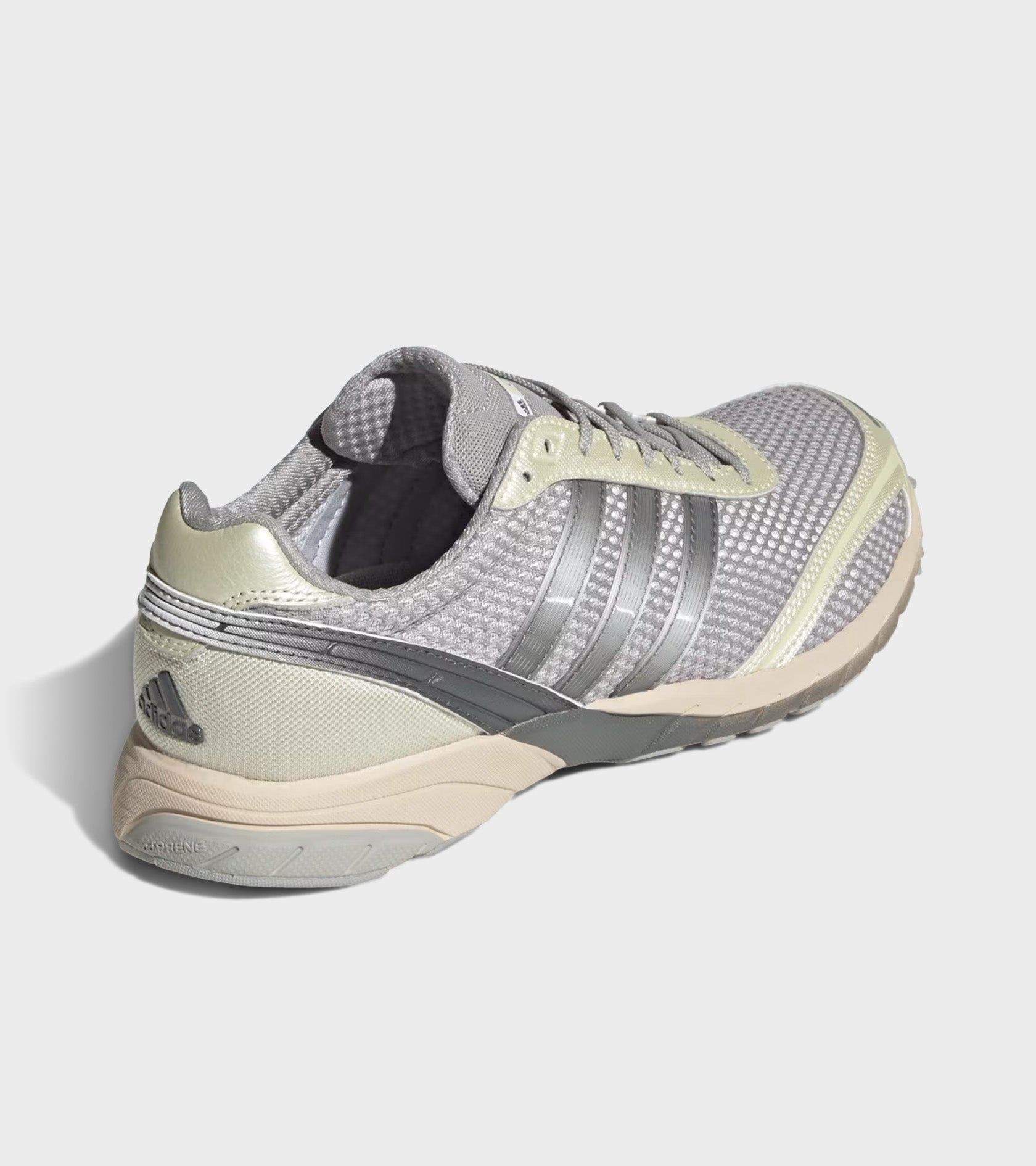 Adizero Adios OG from Adidas. These sneakers have a grey mesh upper and details in metallic shades. On the side are the iconic stripes.
