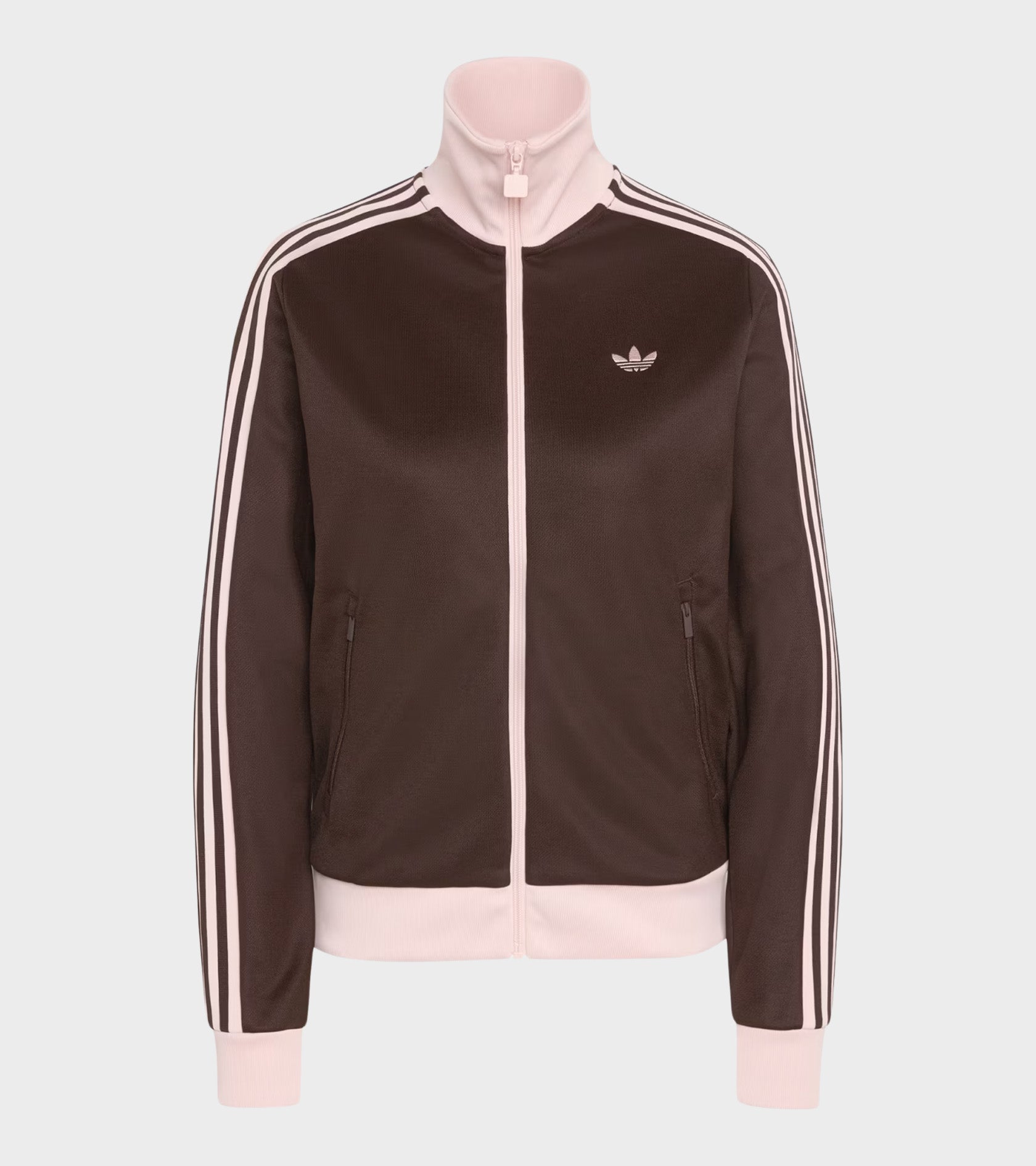 Brown track jacket with light pink details from Adidas. Classic Track Top has a high neck, a zip closure, a slanted pocket on each side and the iconic stripes down the sleeves. At the left chest is an embroidered logo.