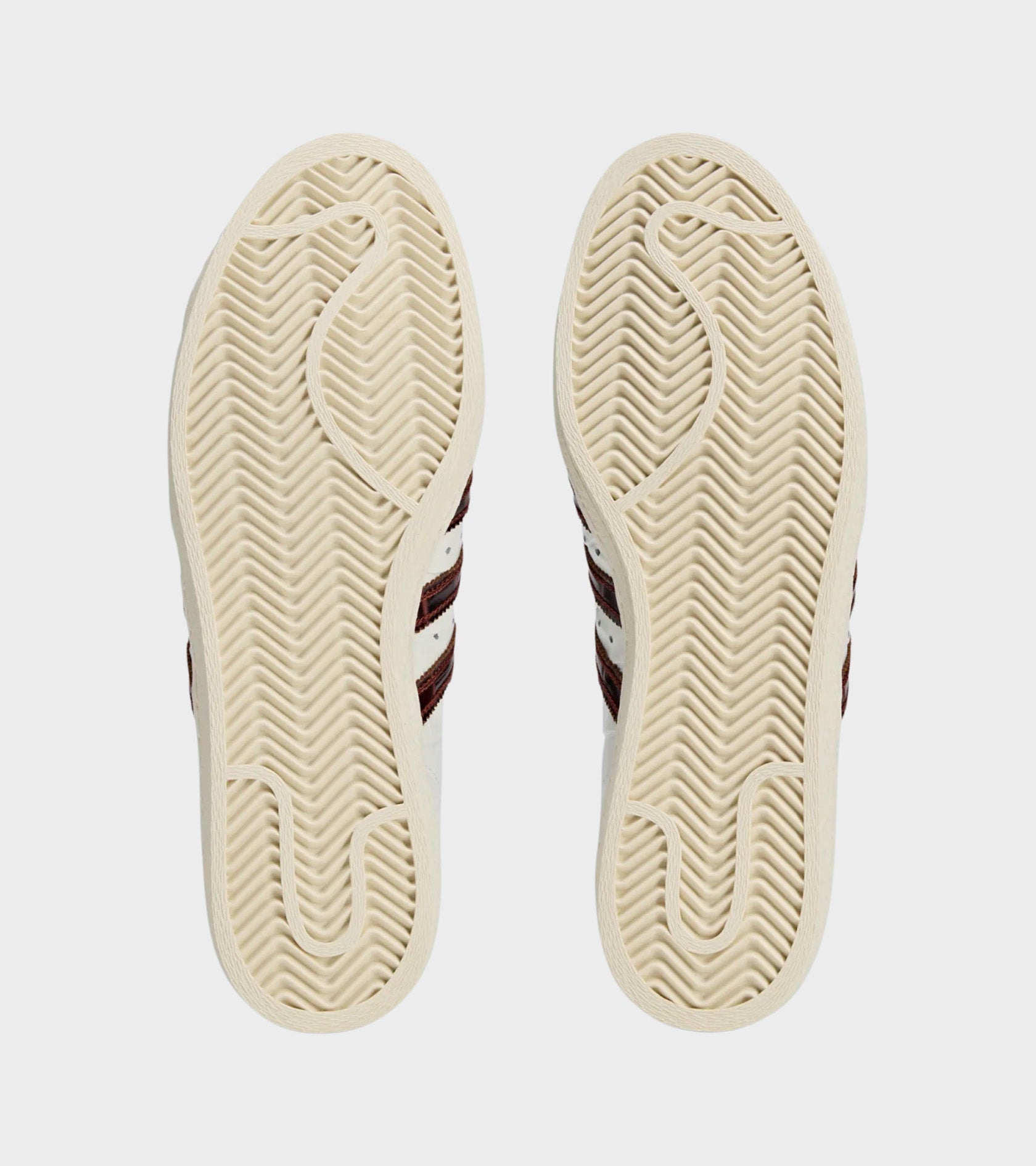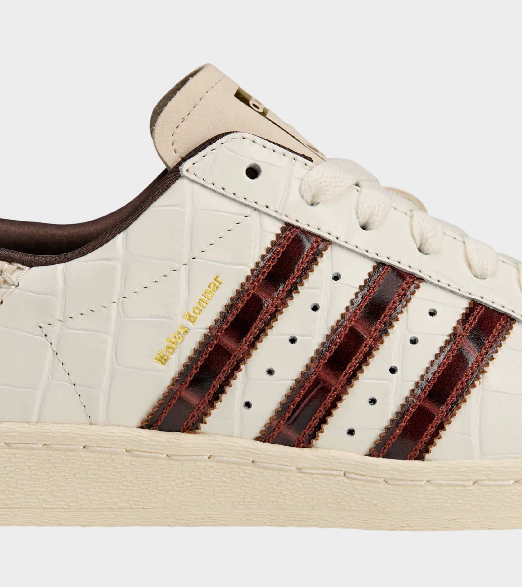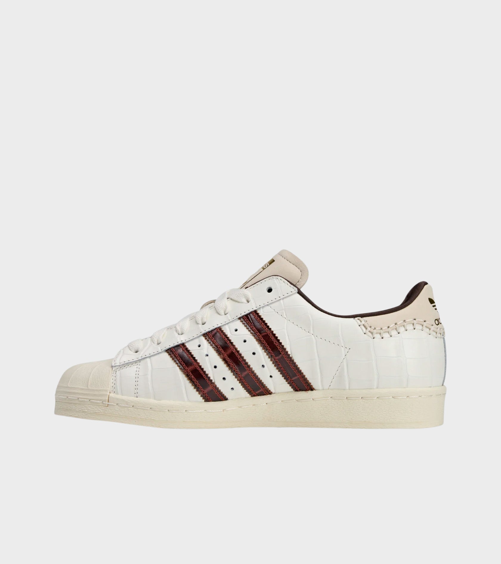 The iconic Superstar from Adidas, now in collaboration with Wales Bonner. These sneakers have an upper in croco-style leather. On the side are the iconic stripes in a reddish brown shade. On the heel are visible white stitchings. On the side, tongue and heel is a logo in gold.