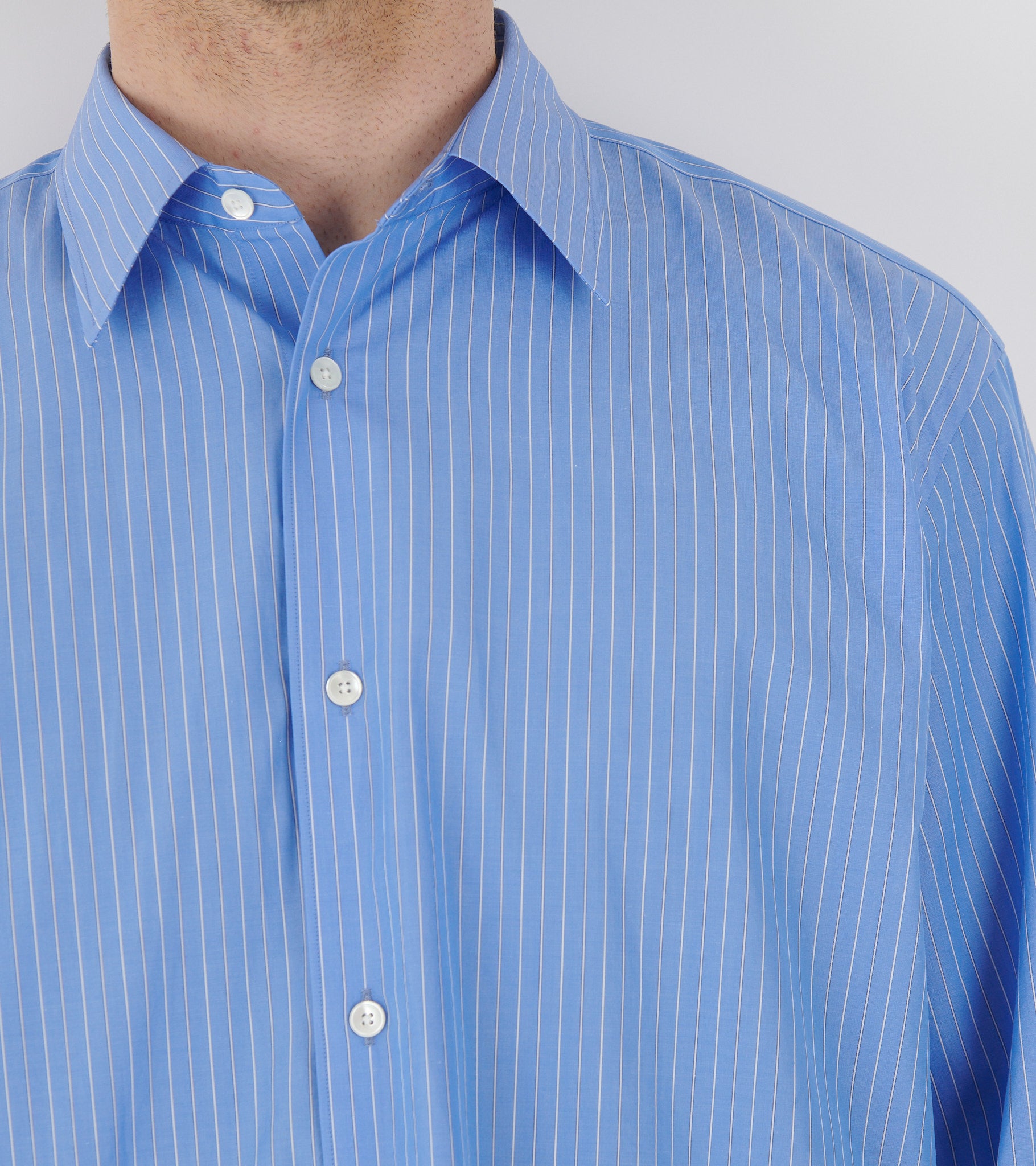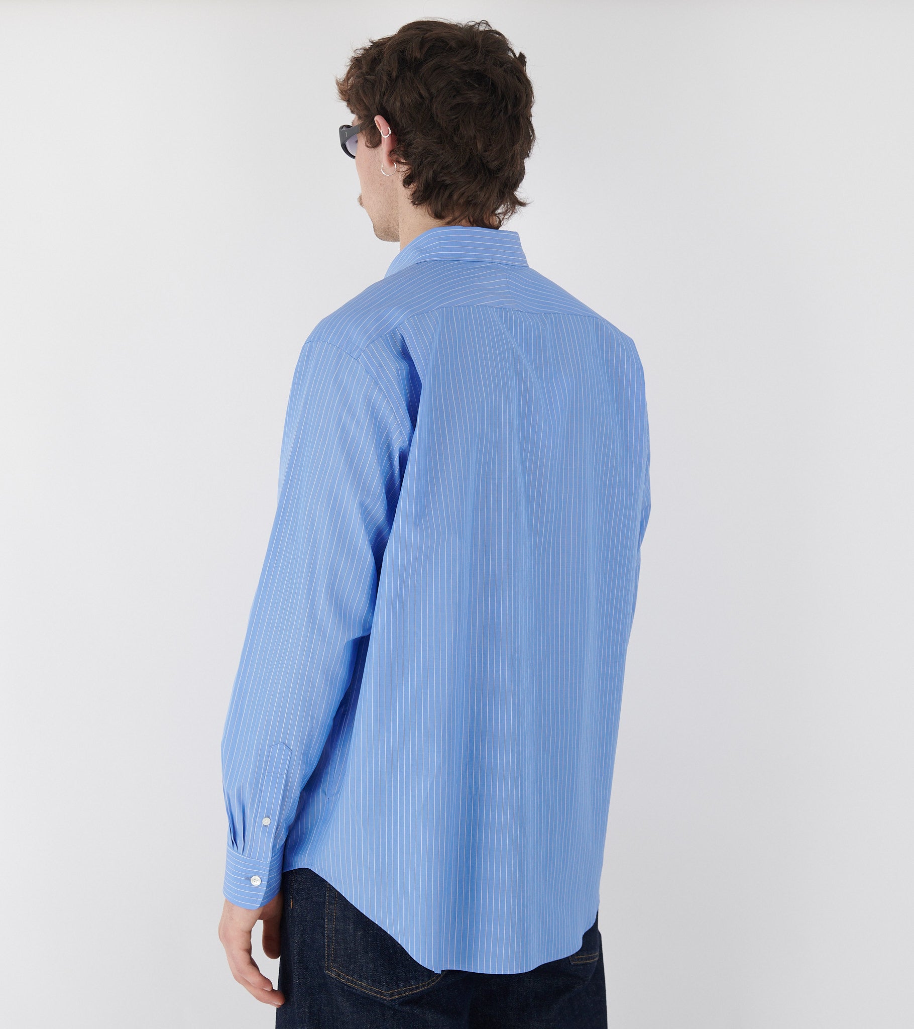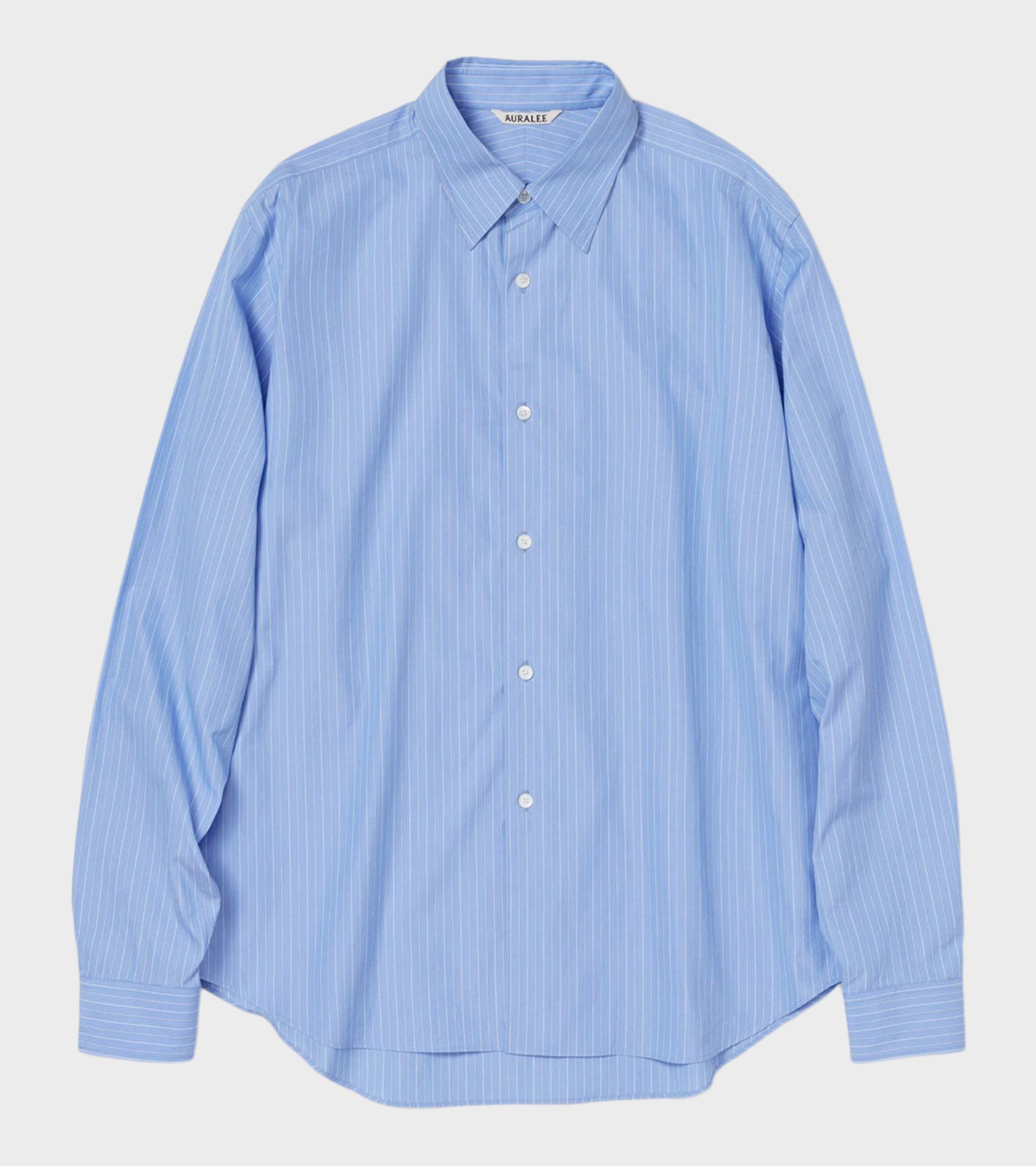Blue shirt with thin white stripes from Auralee. The shirt is made of extra fine 'Suvin' cotton.