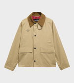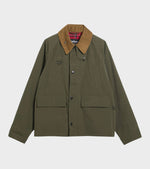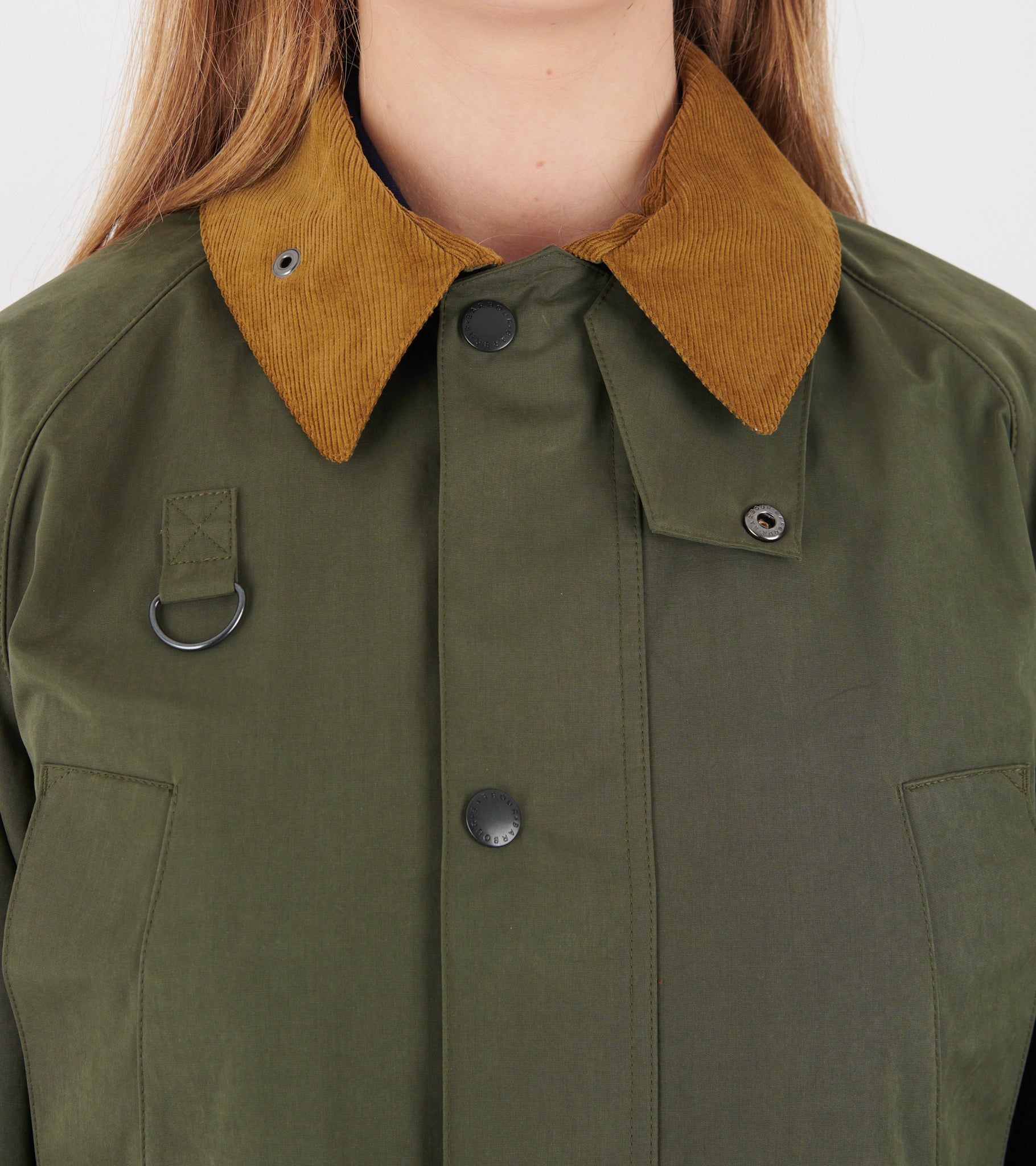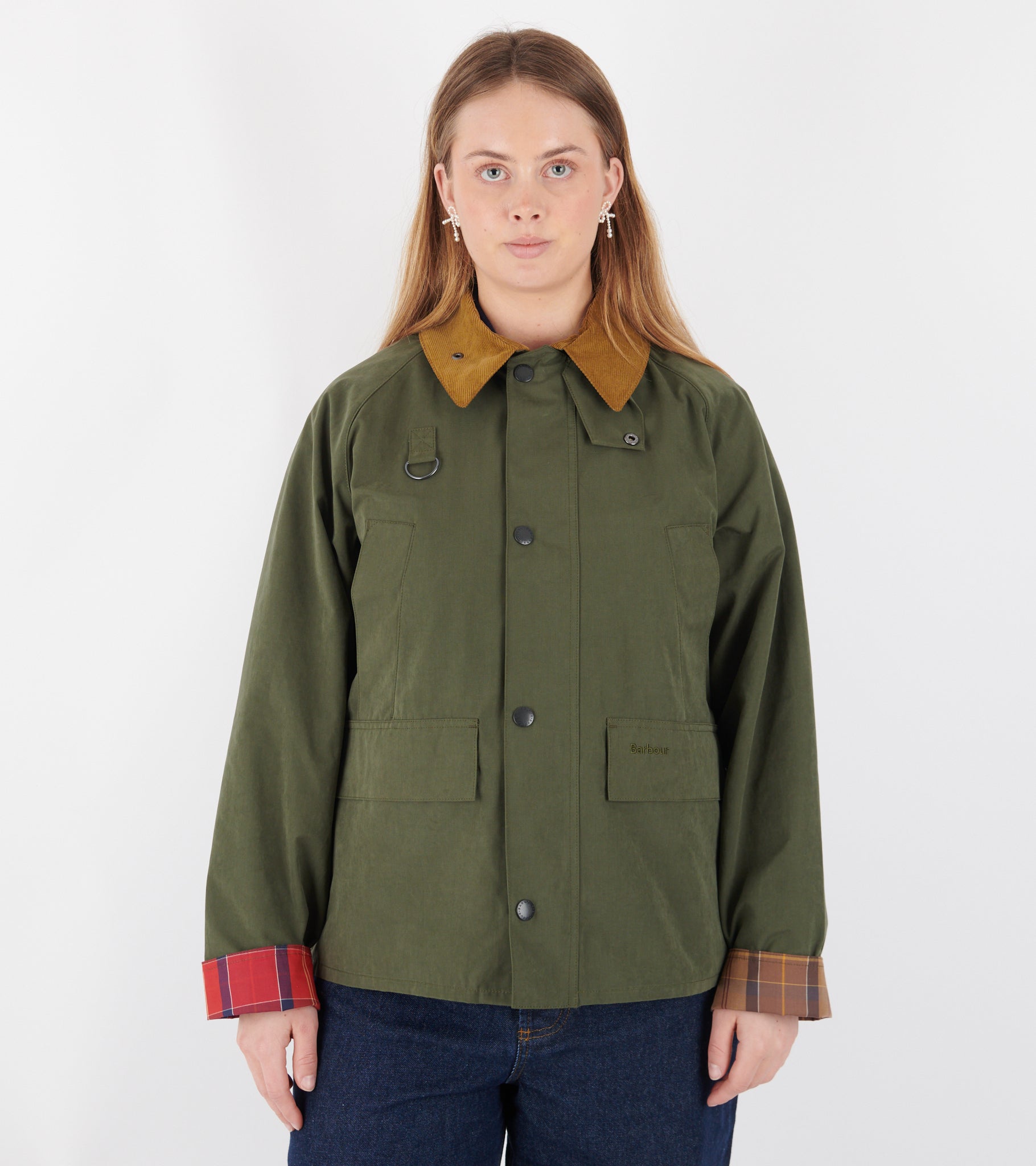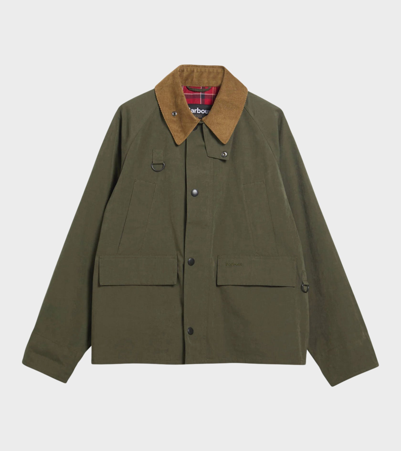 Solar Spey Casual Jacket in 'Sage' from Barbour. The jacket is unisex and features a brown cotton corduroy collar, a storm flap, a hidden two-way gold-coloured zip fastening, a snap button fastening and four pockets on the front. One pocket has a small embroidered logo. The jacket has a checkered lining that can be folded at the sleeves if desired.