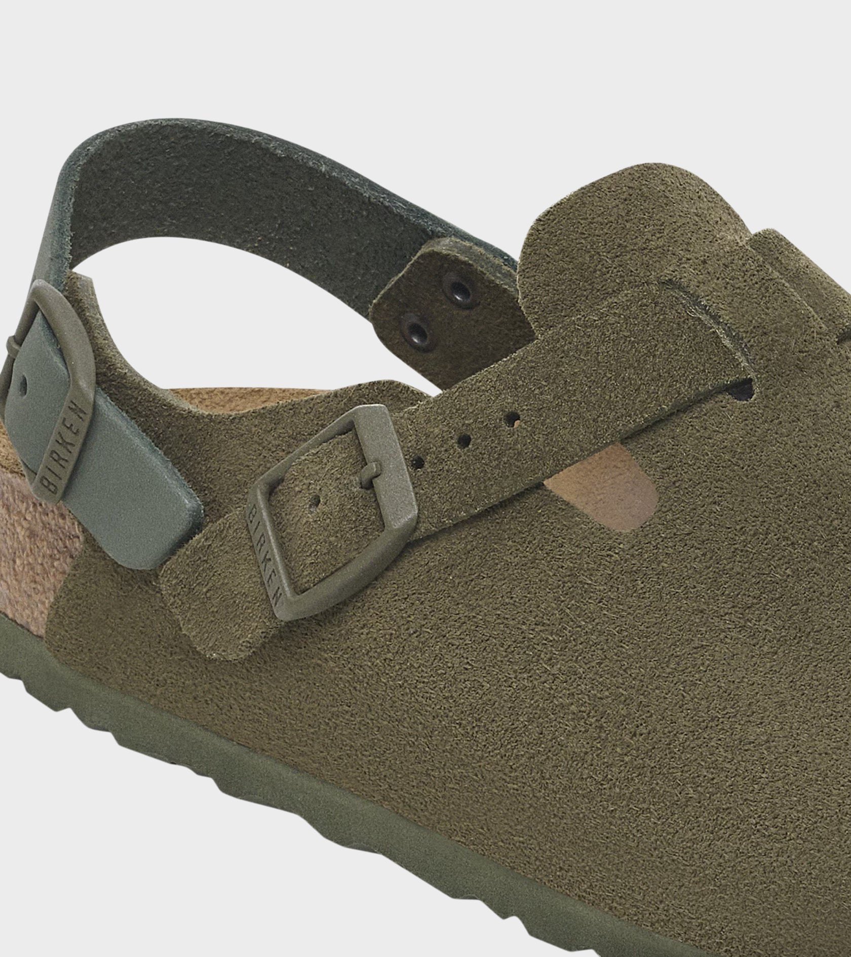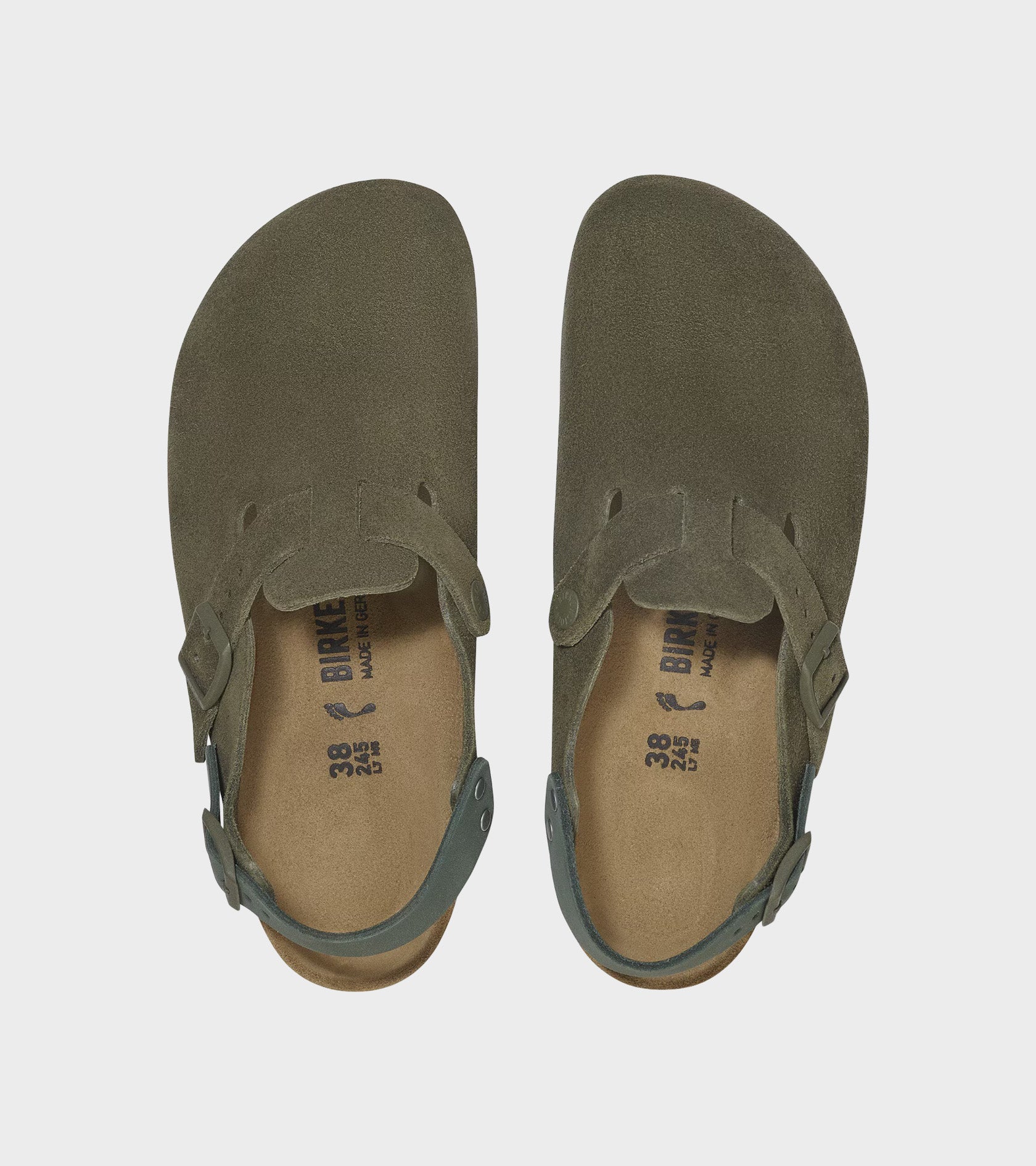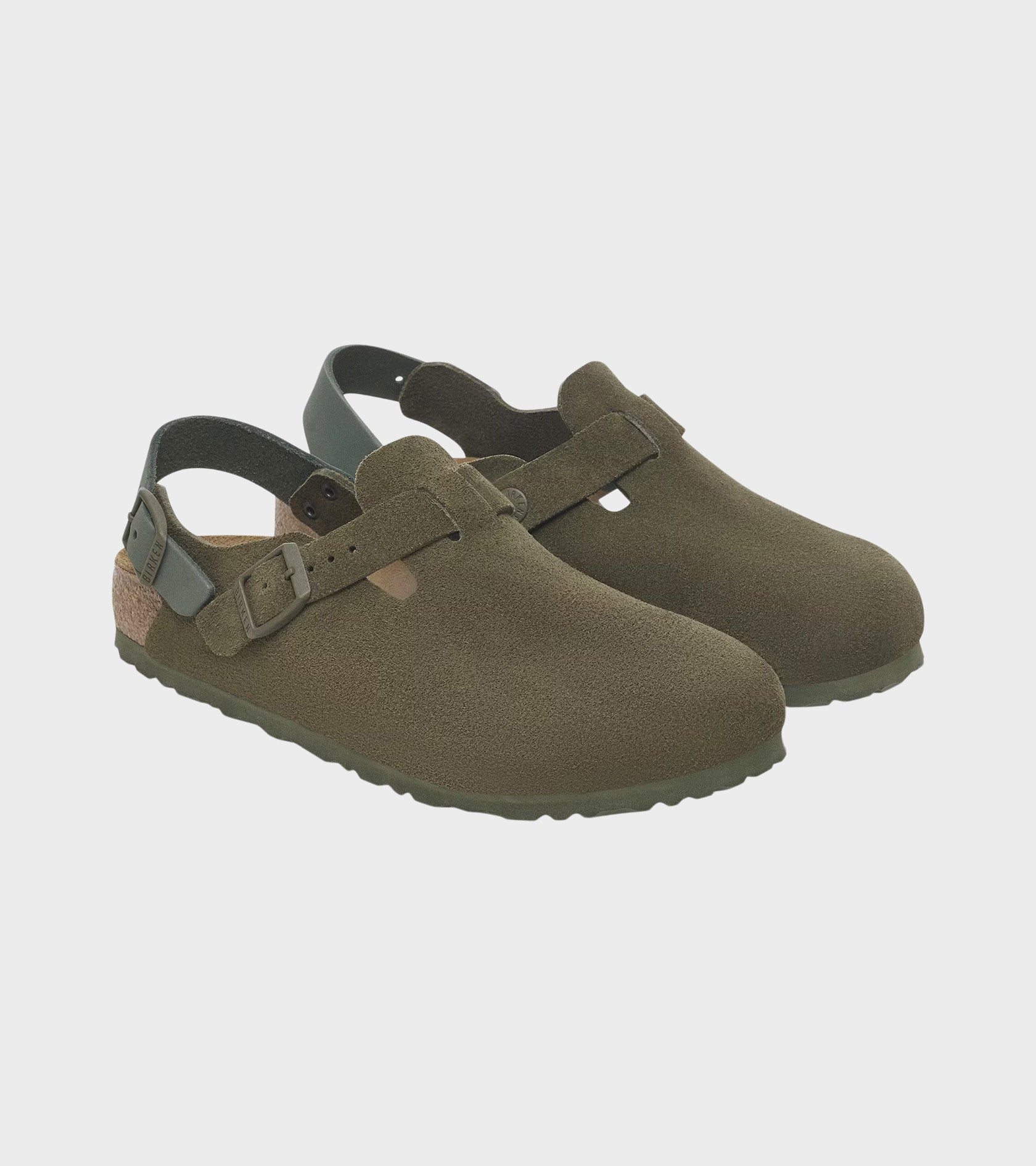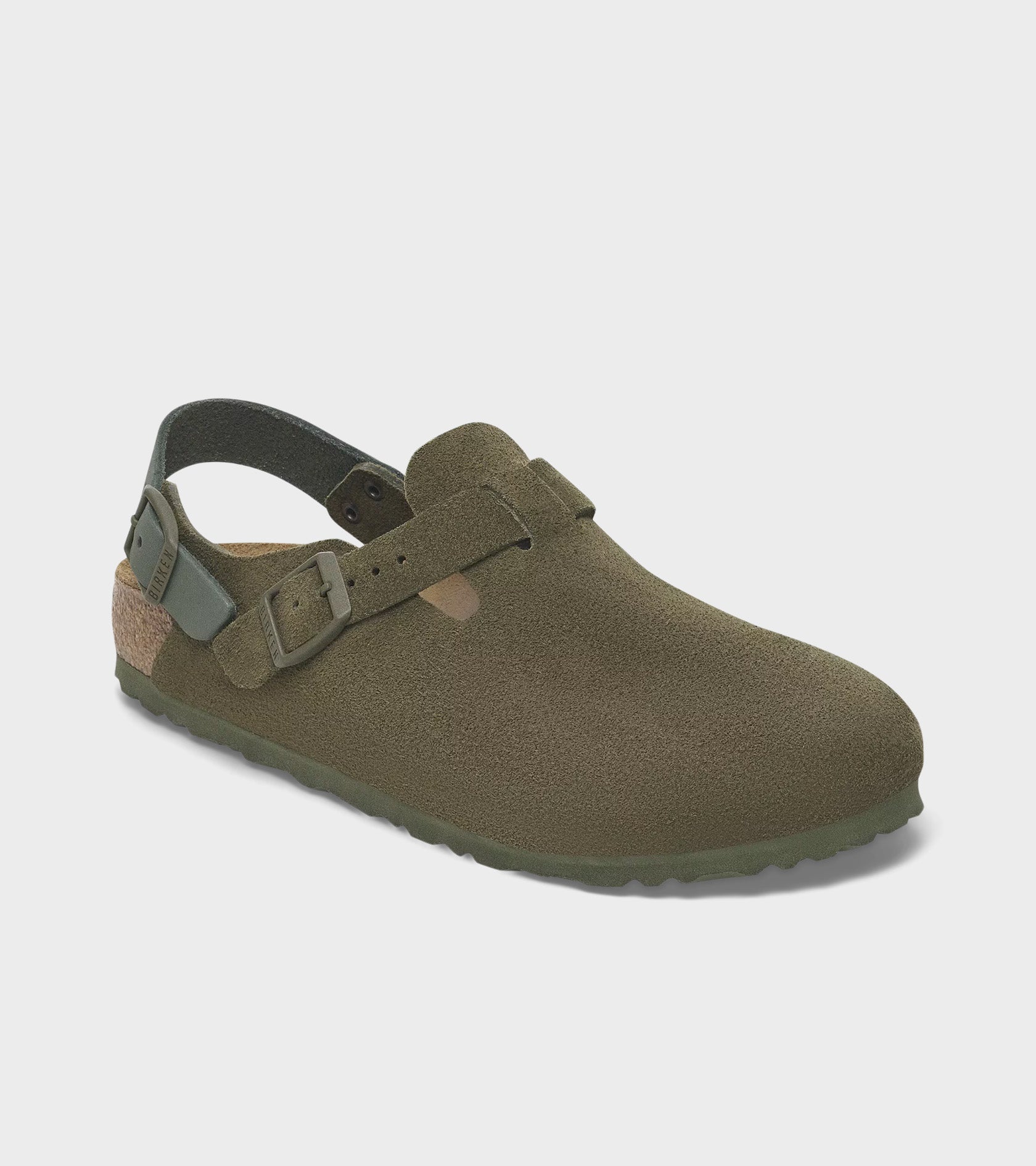 Tokio from Birkenstock in green suede - this model is based on the classic 'Boston' model, now with a heel strap. The upper is made of suede, the insole is made of cork and the outsole is made of EVA.