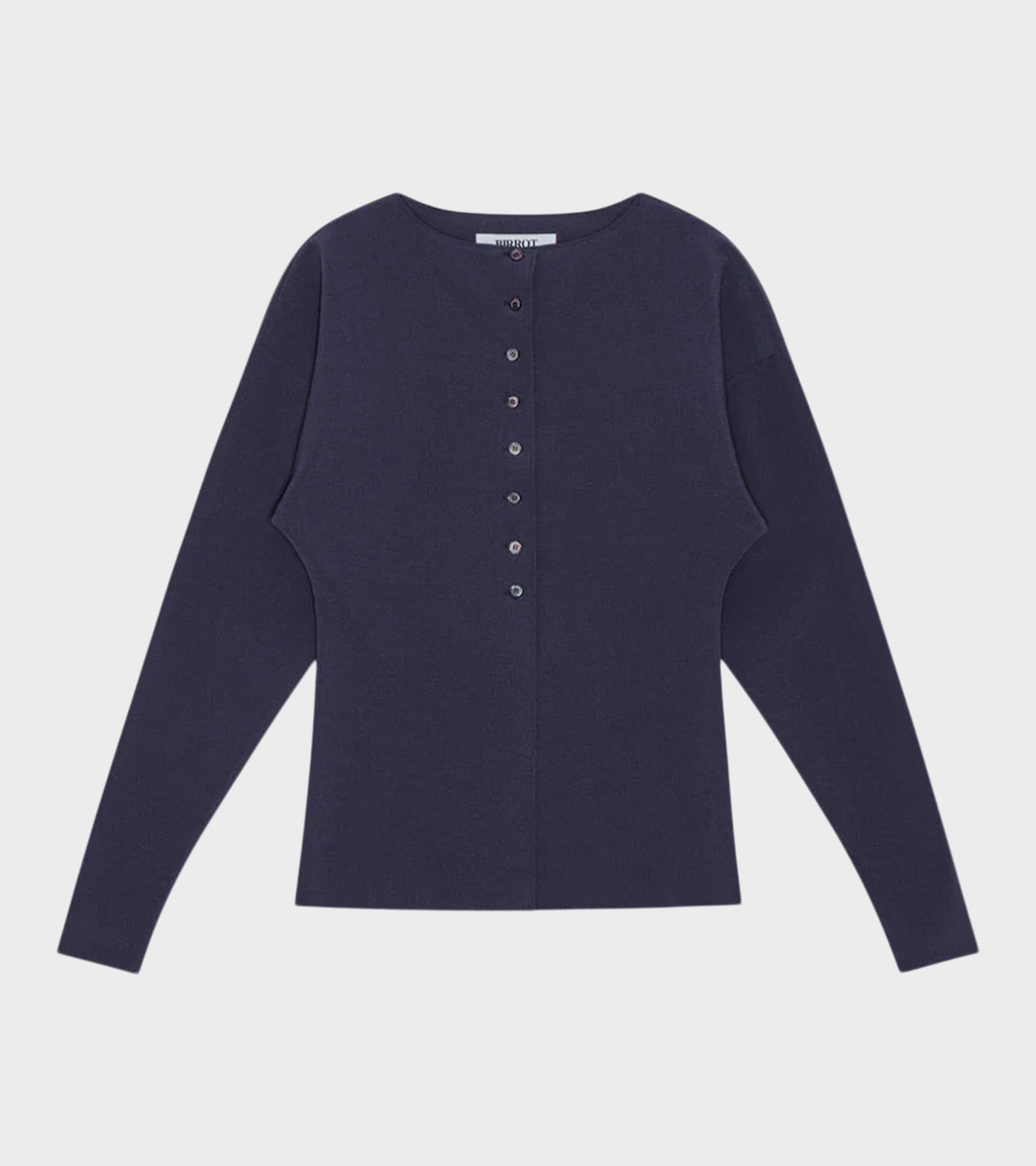 Blue cardigan from Birrot. This cardigan is slightly fitted and has a round 'boatneck' neckline, a button closure on the front and voluminous sleeves.