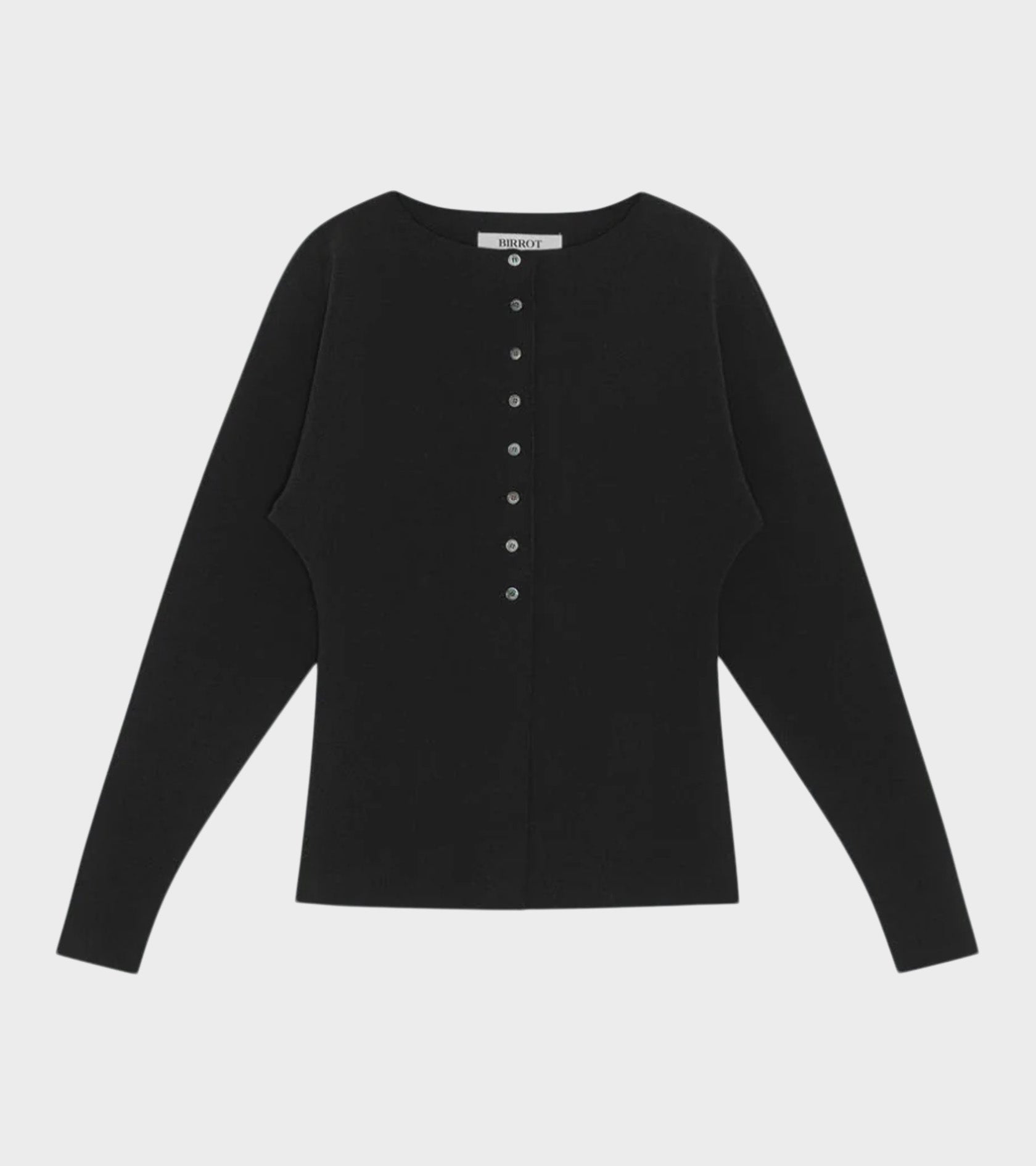 Black cardigan from Birrot. This cardigan is slightly fitted and has a round 'boatneck' neckline, a button closure on the front and voluminous sleeves.