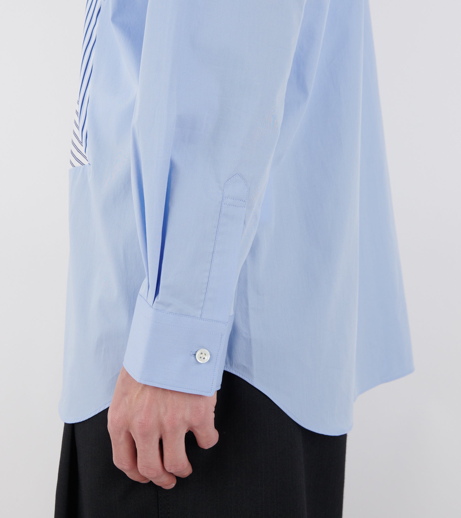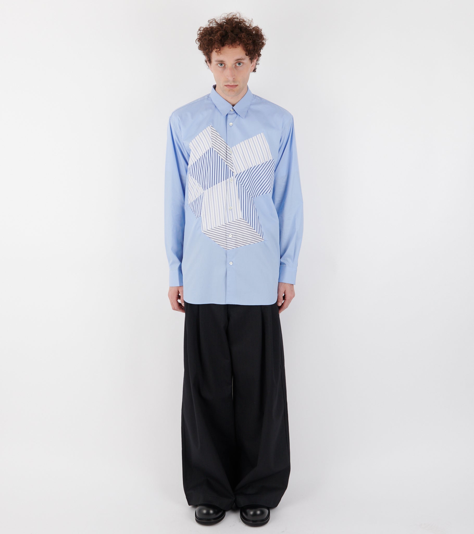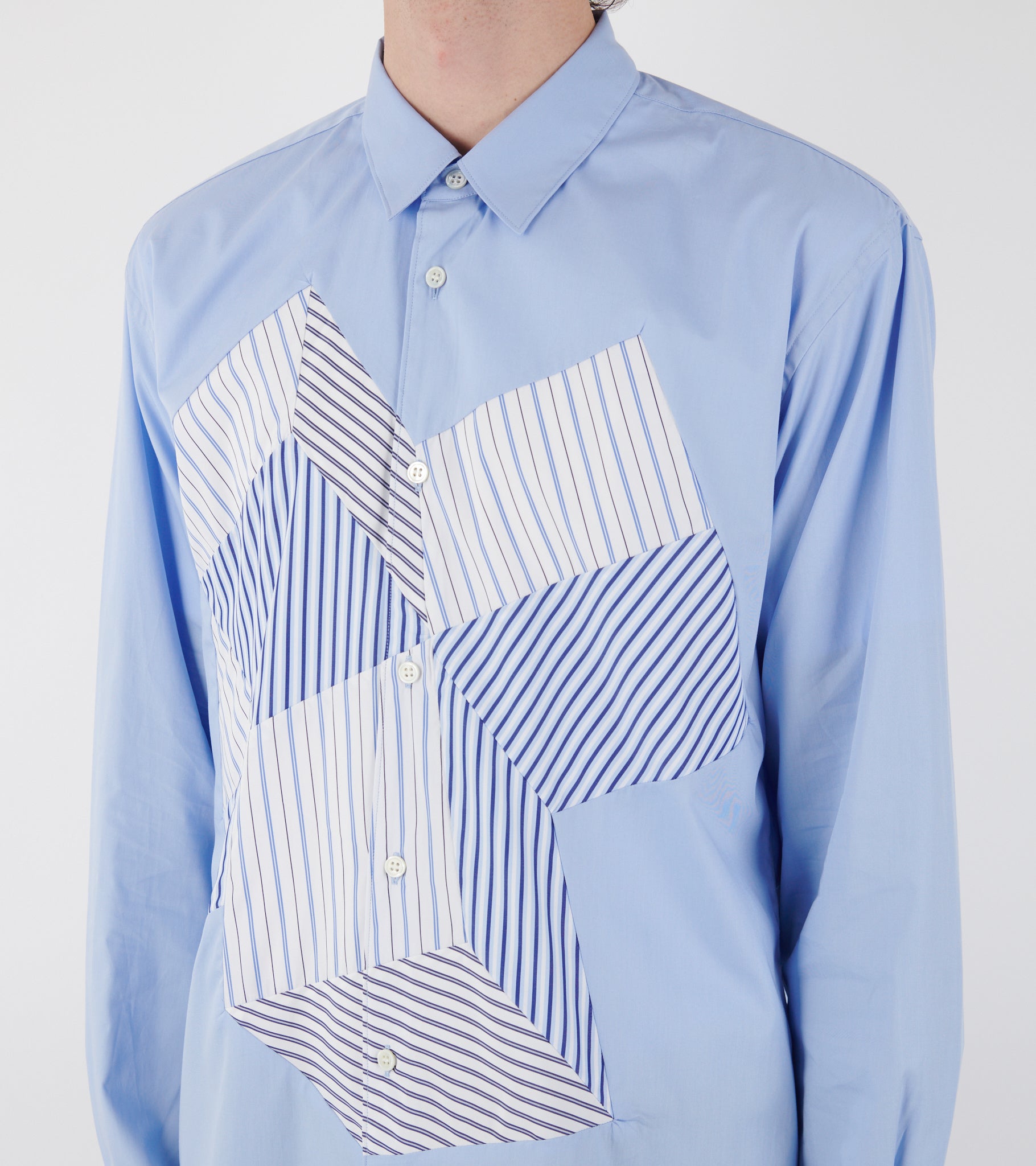 Light blue shirt with striped patchwork details on the front from Comme des Garcons Shirt.