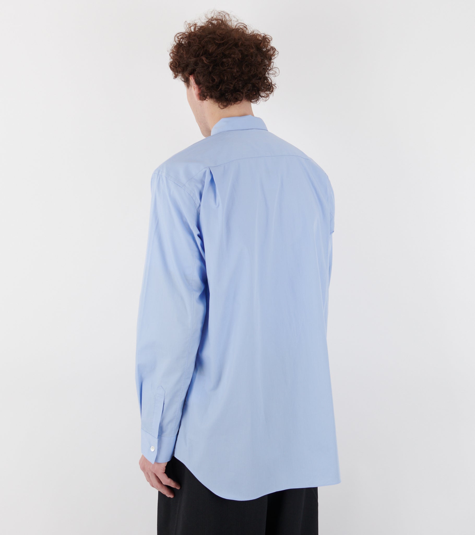 Light blue shirt with striped patchwork details on the front from Comme des Garcons Shirt. The shirt is made from cotton poplin.