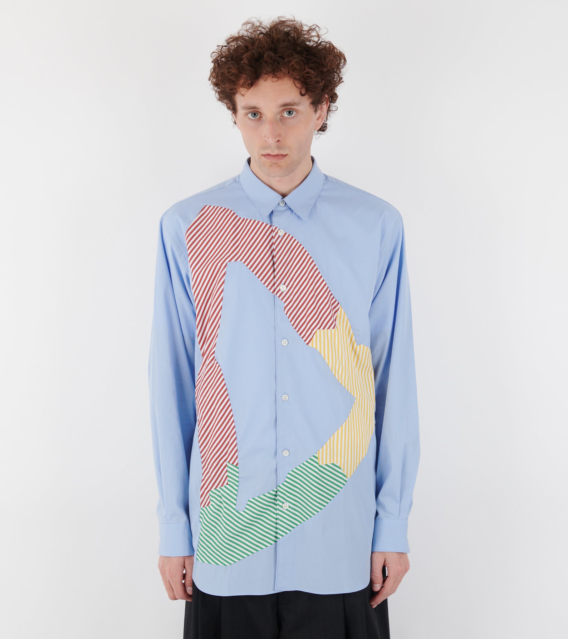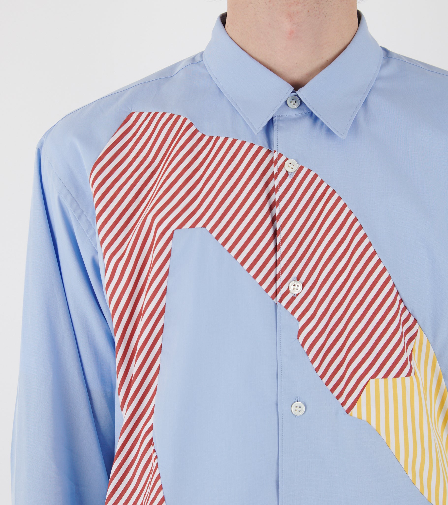 Light blue shirt with striped patchwork details on the front from Comme des Garcons Shirt.