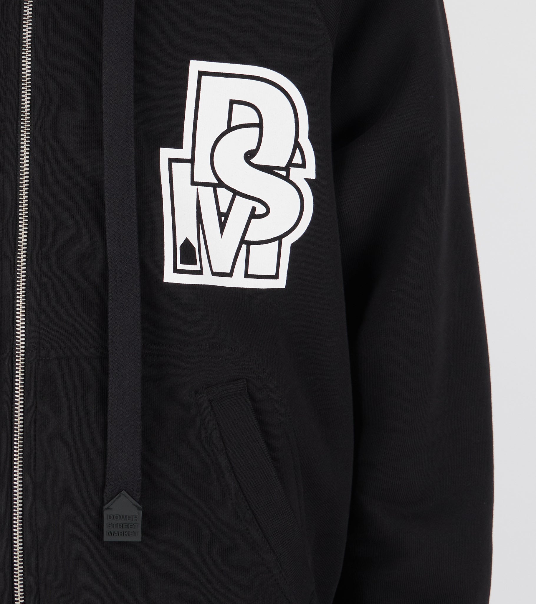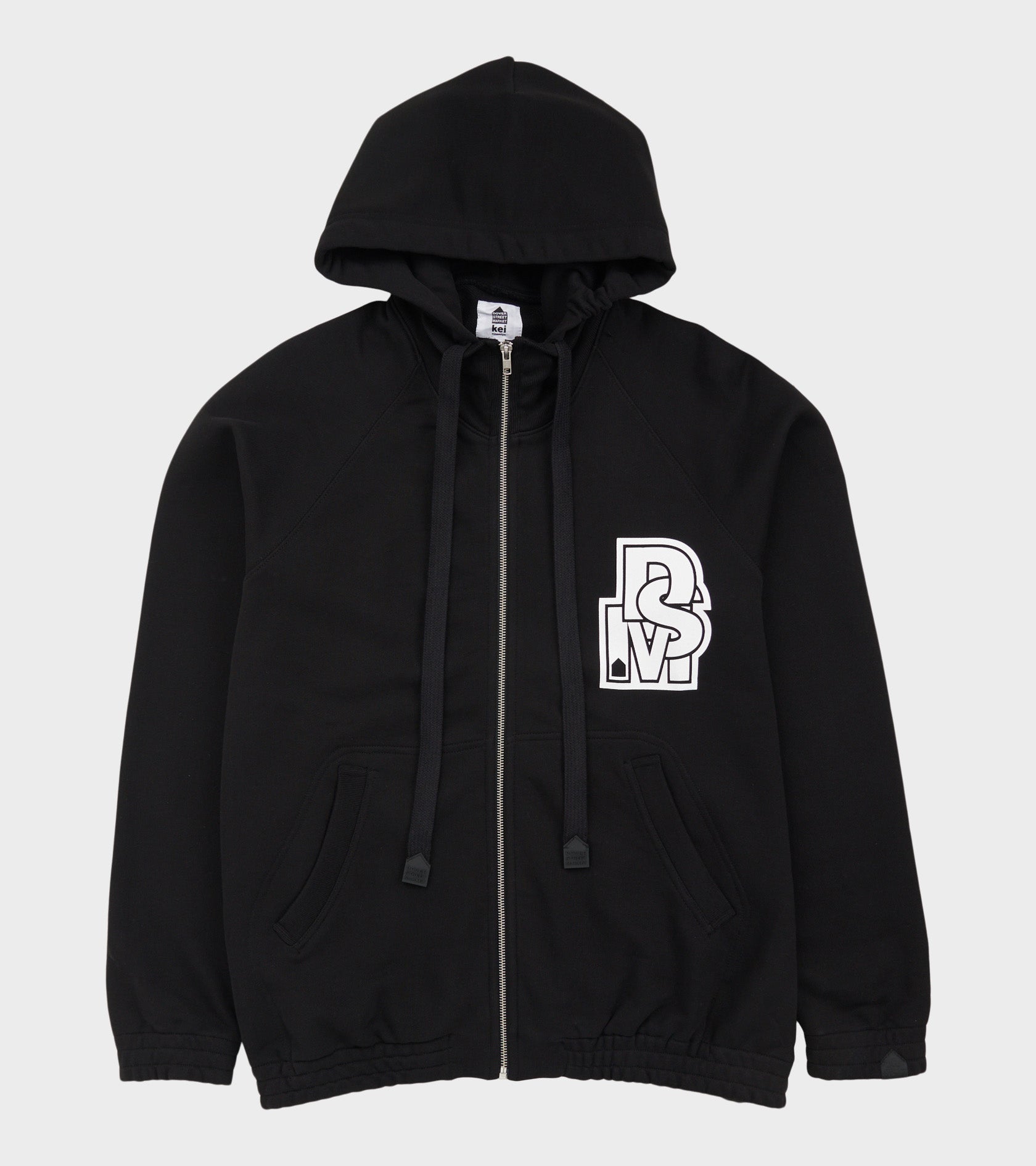 Black hoodie from Dover Street Market Kei Ninomiya. The hoodie has a classic hood with drawstrings, a zip closure and a slanted pocket on each side. The hoodie has a white logo on the left chest as well as on the back.