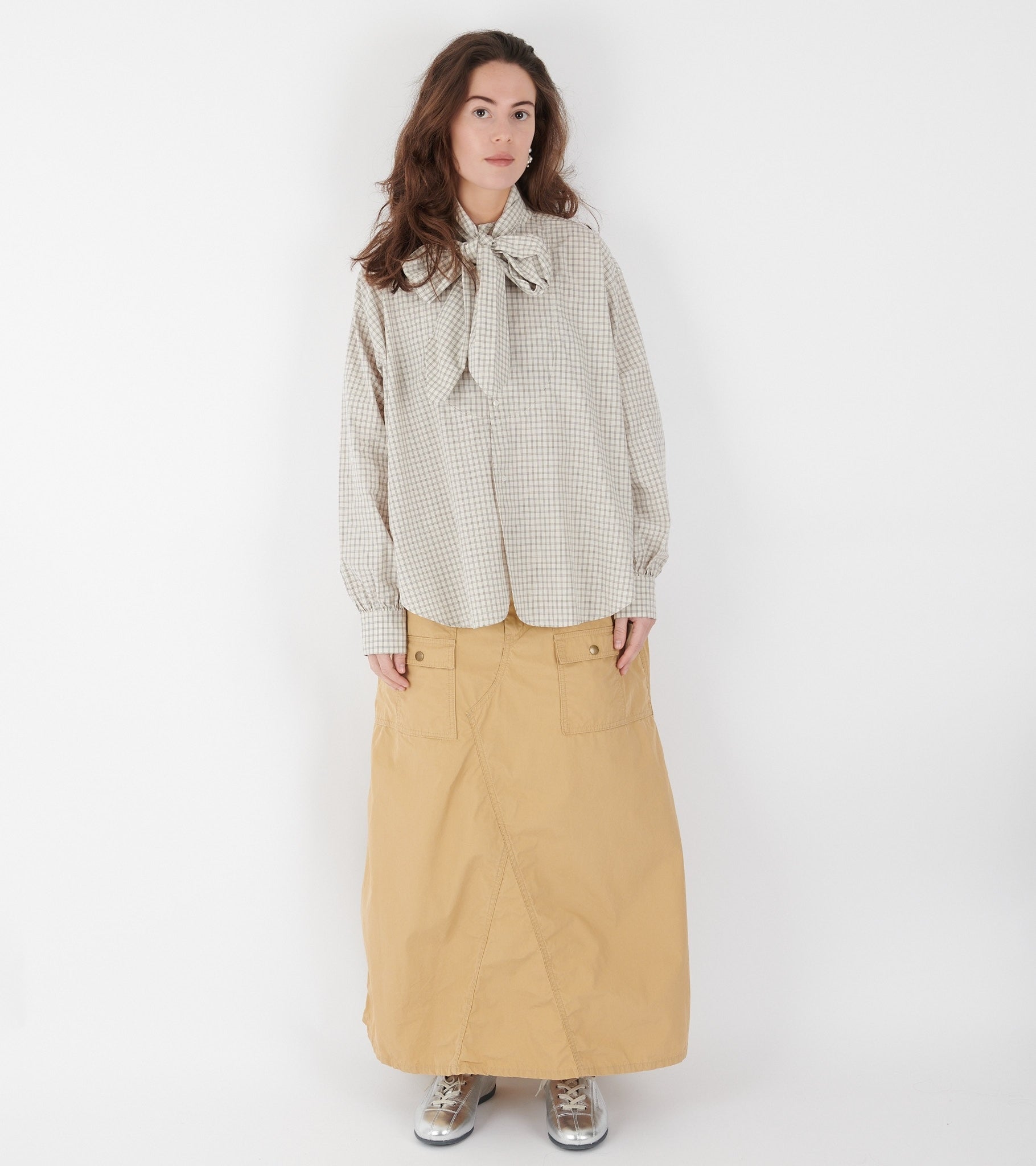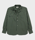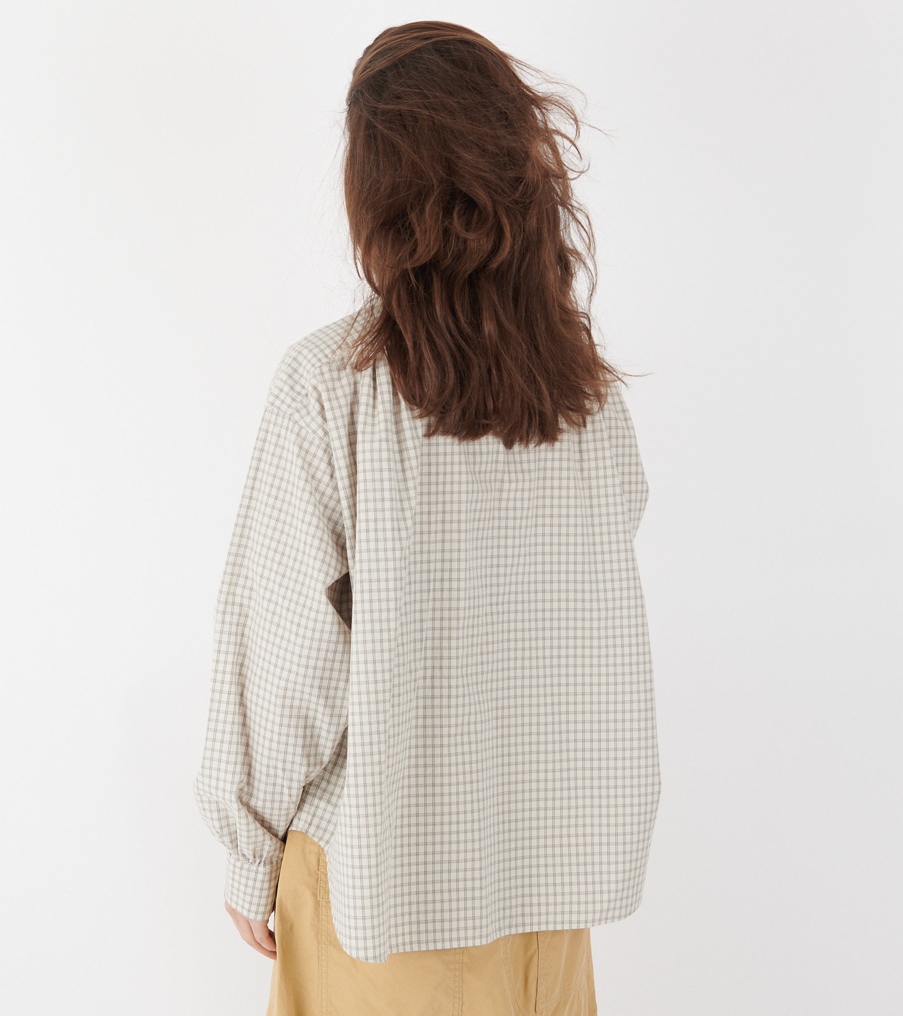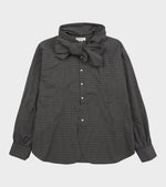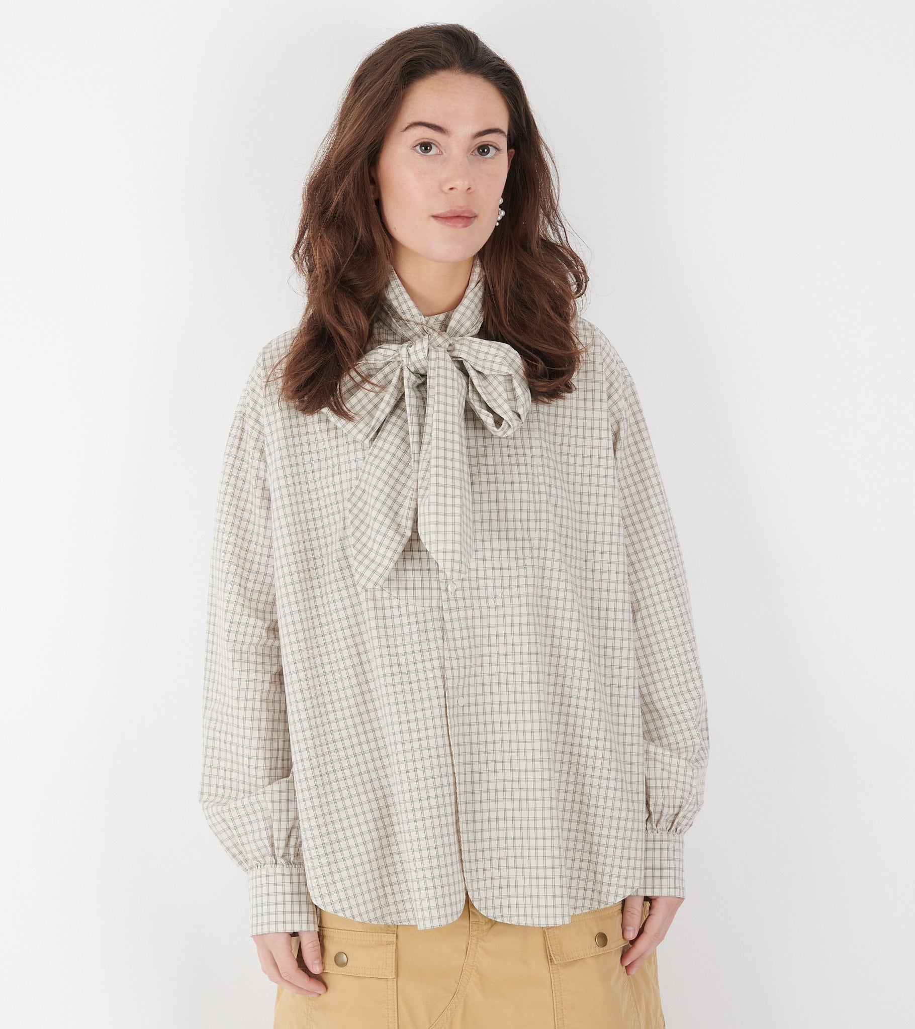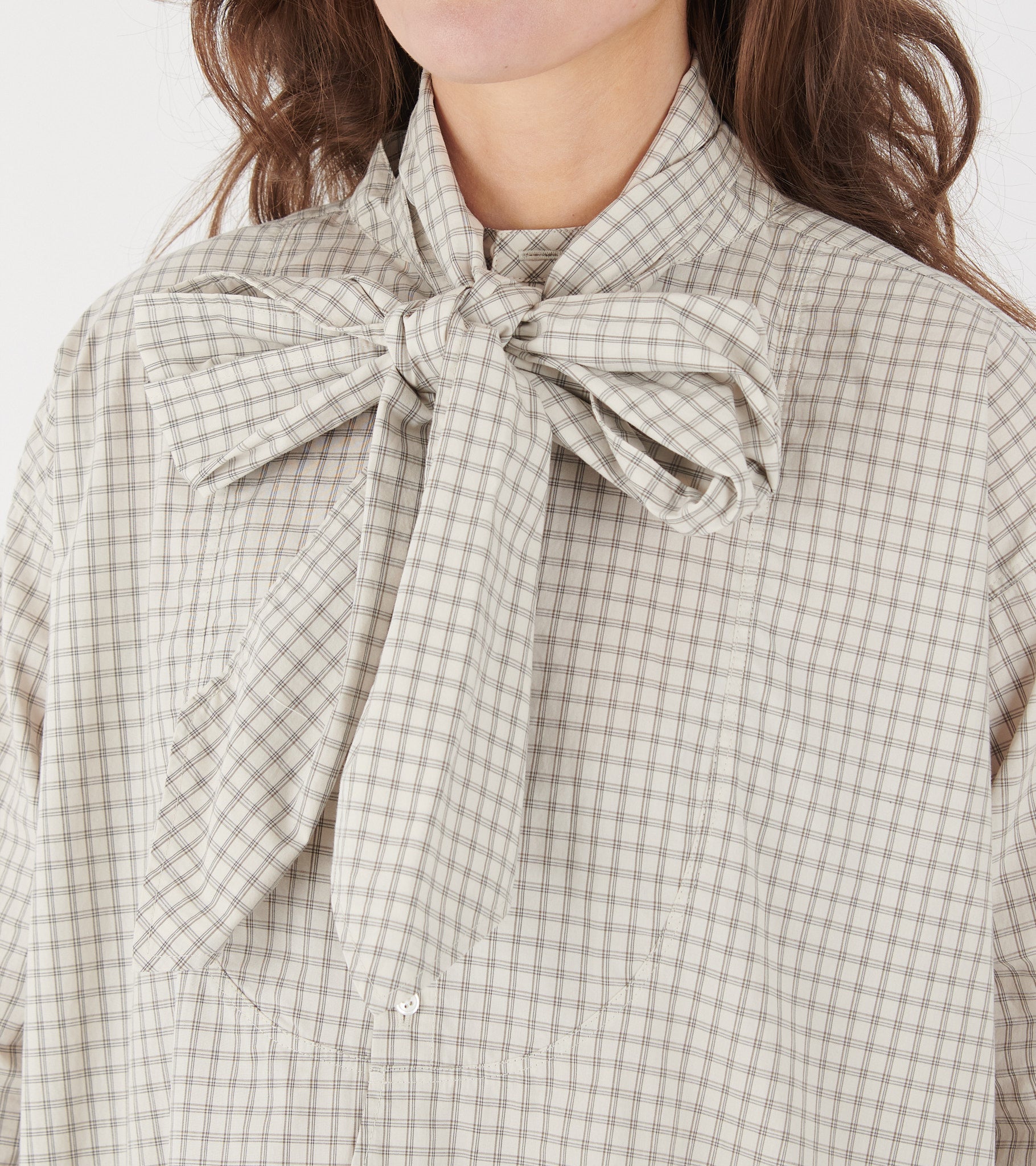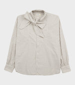 Checkered shirt in off-white with a removable tie from Beams Boy. The shirt has a round collar, a button closure and pleats at the sleeves and upper back.