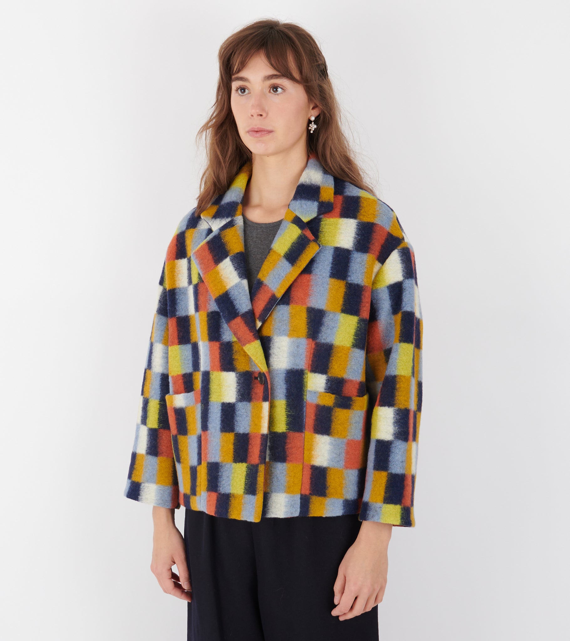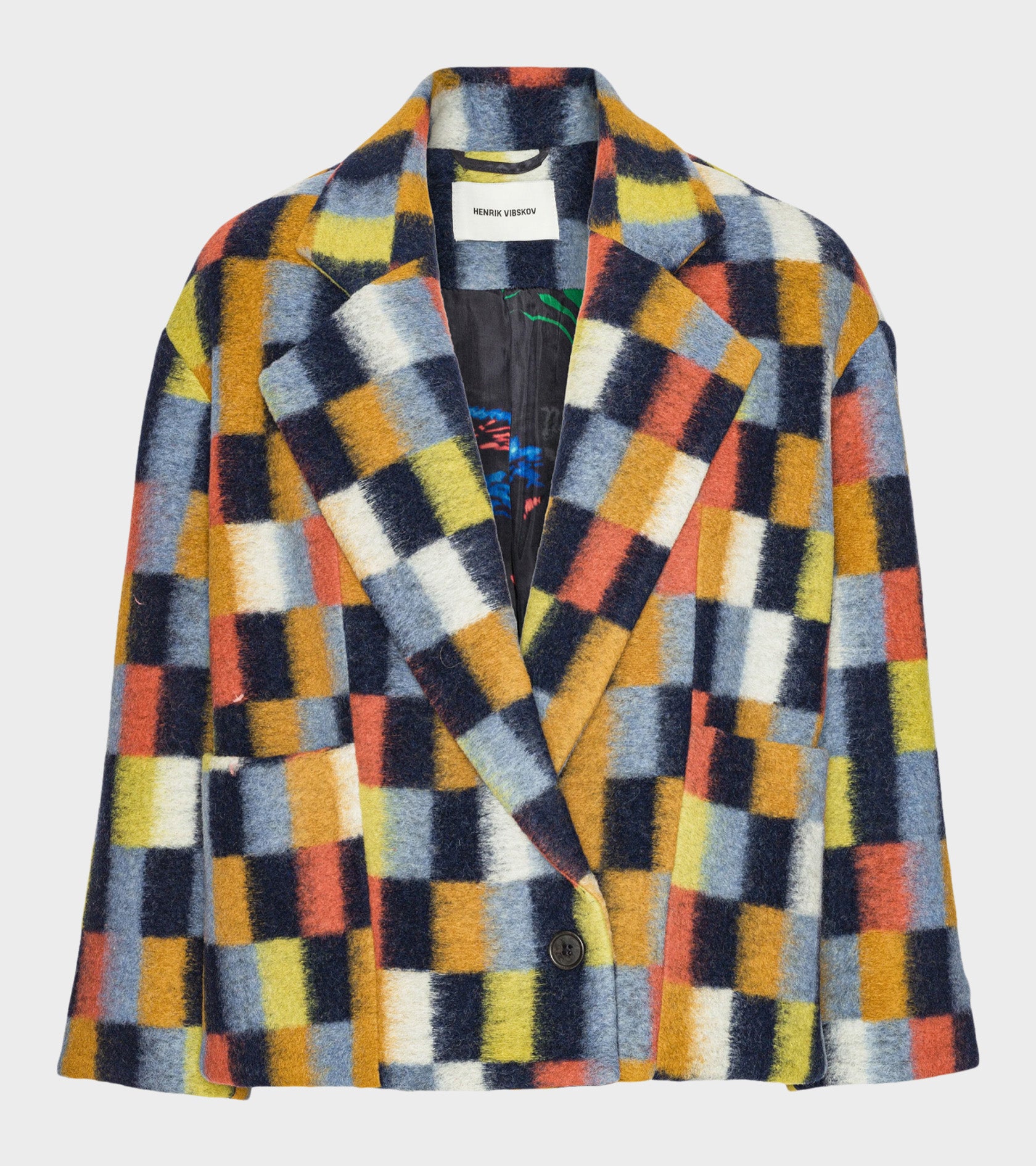 Multicolored wool blazer from Henrik Vibskov. The blazer has a block pattern, a classic lapel collar, a single-button closure and two pockets on the front.