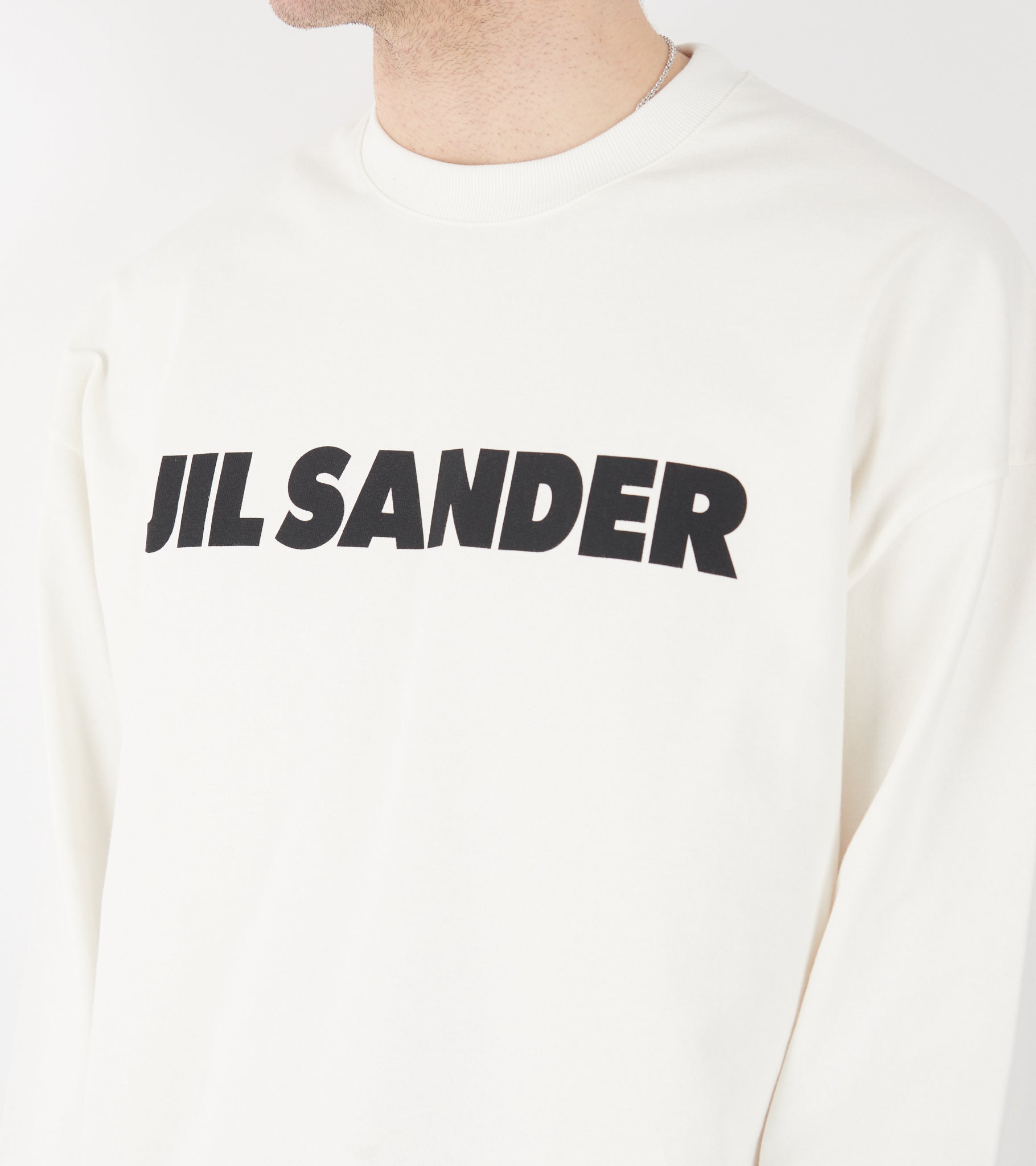 White long-sleeved t-shirt in a slightly stiff cotton quality from Jil Sander. The t-shirt has a round neck and a printed black logo on the front.