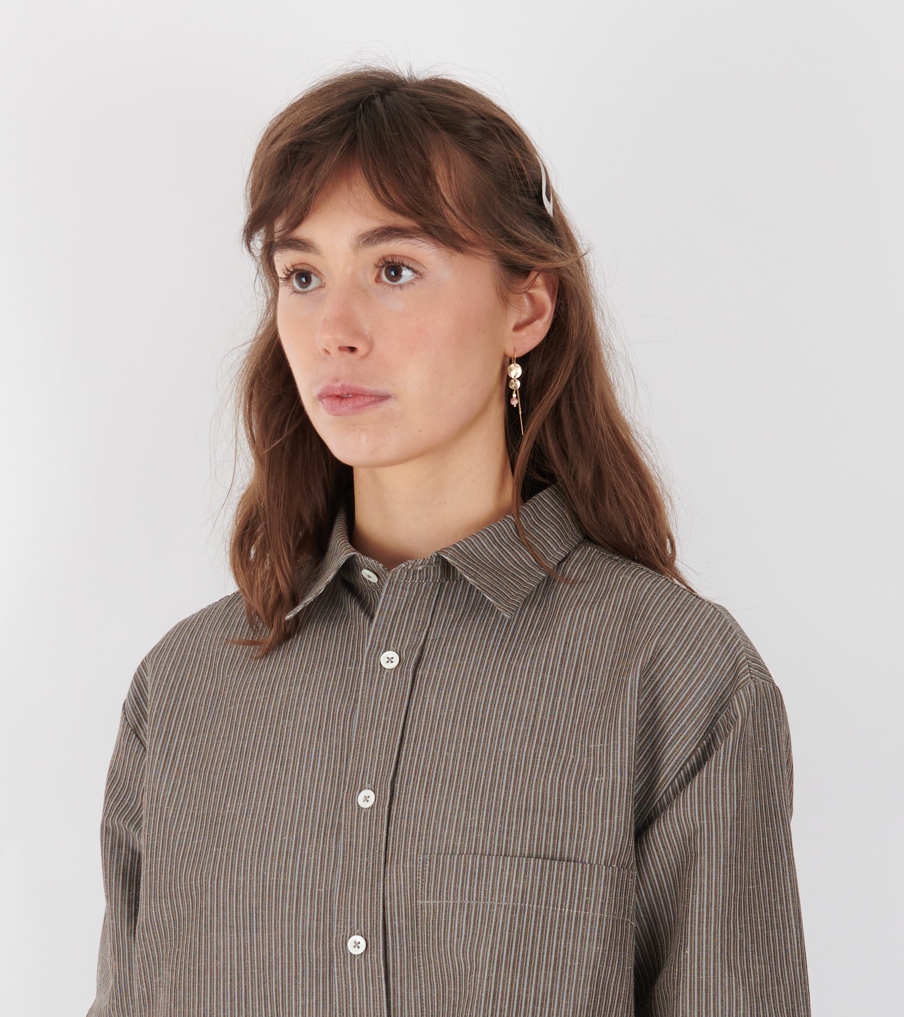 Gold-plated earring with two hammered pendants and a small light pink stone from Leleah.