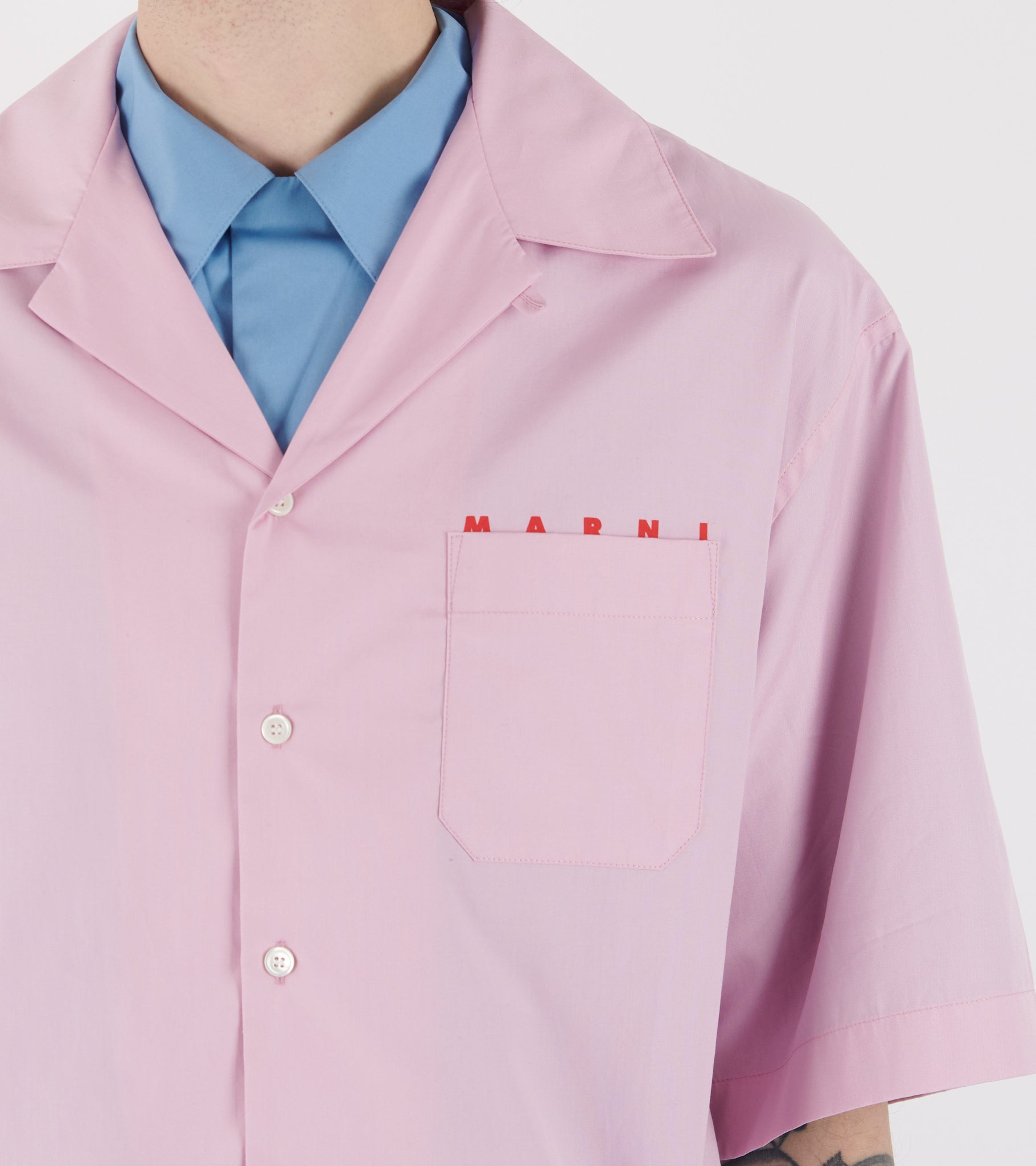 Short-sleeved shirt in organic cotton poplin from Marni. The shirt has a button closure, a chest pocket and an open collar, which can also be buttoned up to a classic collar. Above the chest pocket is a printed red logo.
