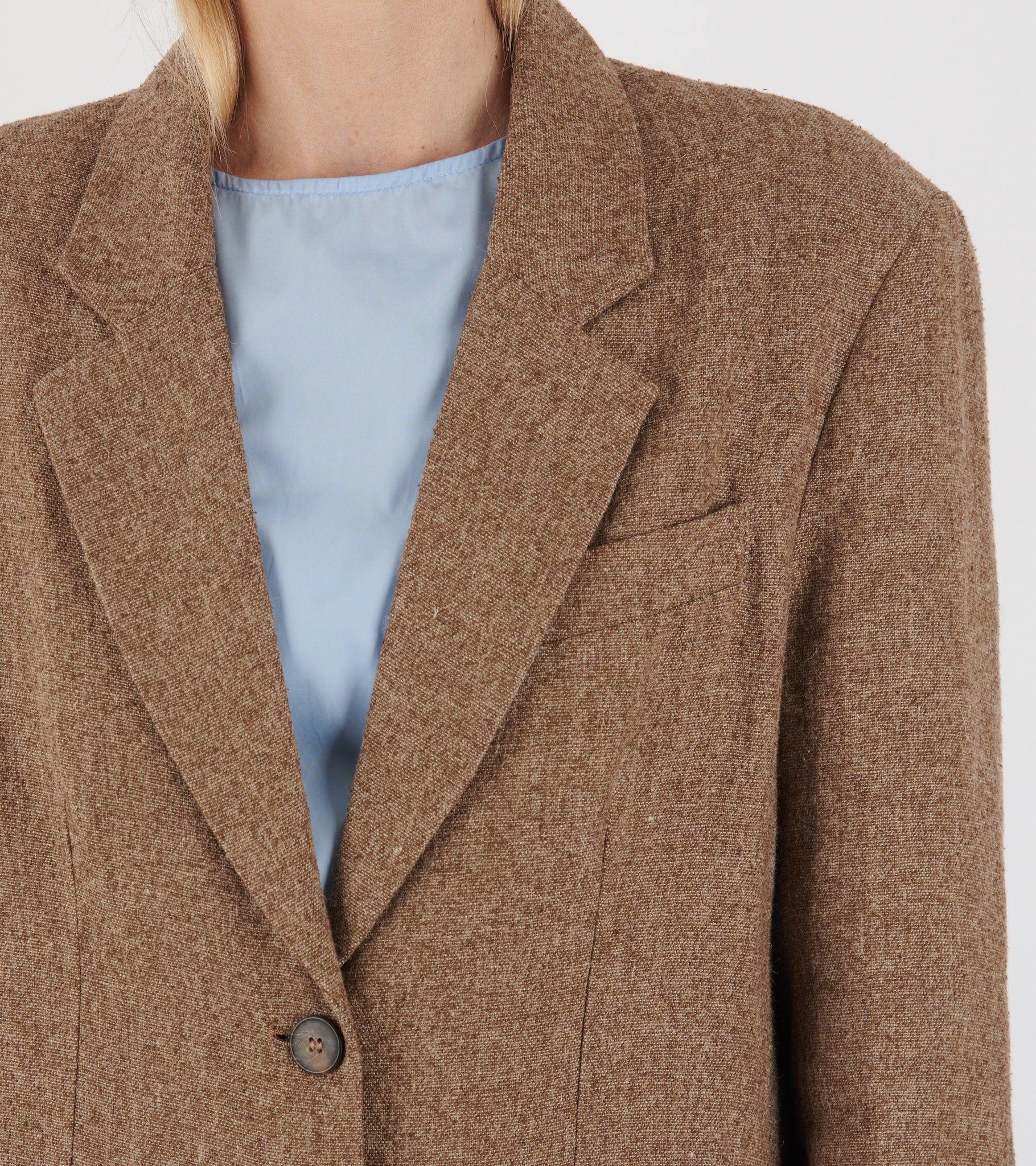 Alberte Blazer from Mati Mati. The blazer has a classic lapel collar, three pockets and a two-button closure on the front. It is made from a melange blend of linen and silk.