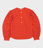 Blue blouse in a lightweight cotton 'crepe' quality from Moismont. The Mani Blouse has balloon sleeves, pleats at the sleeves, a round neck and a three-button placket. On the left side is an embroidered logo in red.