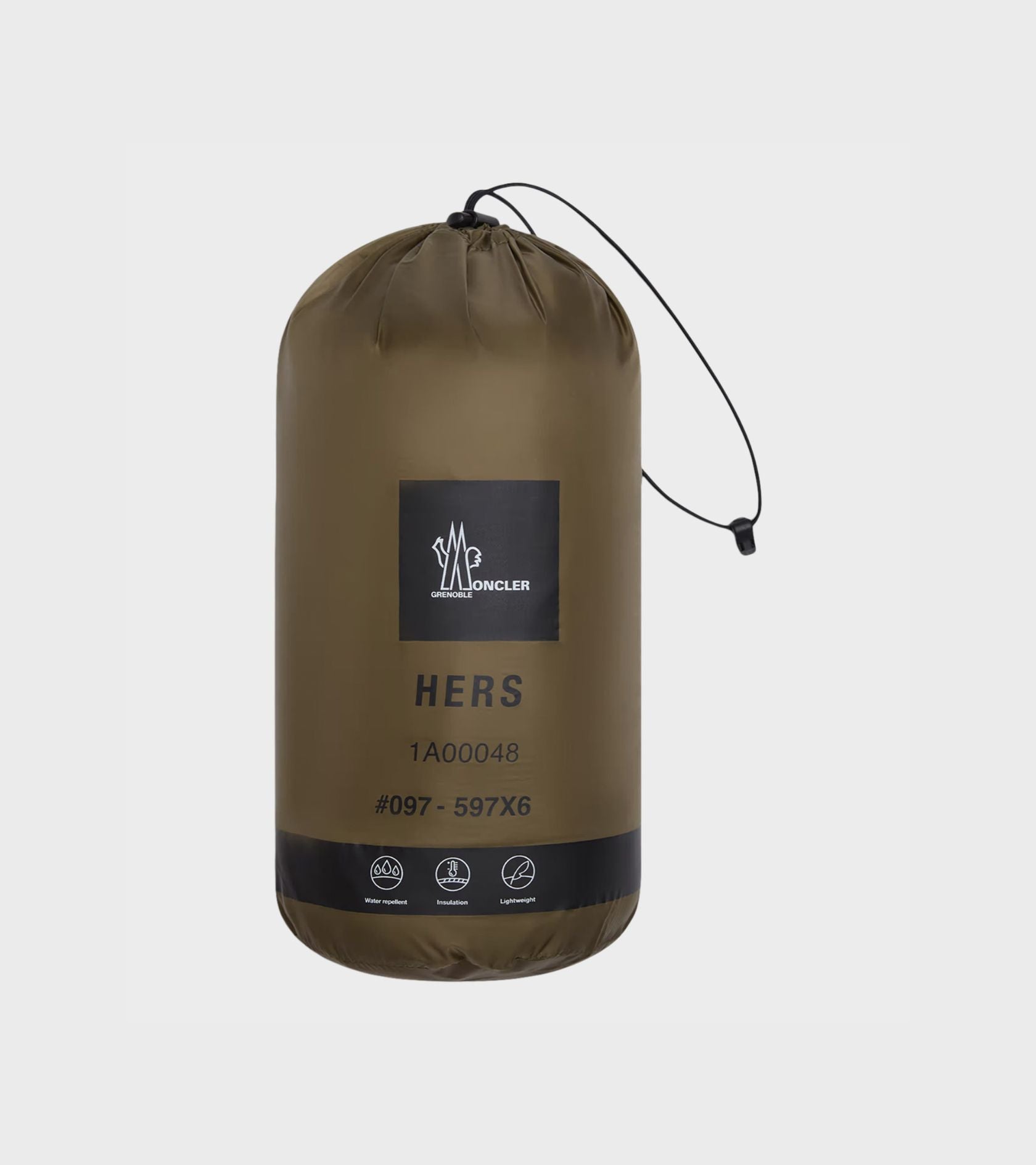 Olive green down jacket from Moncler Grenoble. Hers Packable Down Ski Jacket Olive Green is made in a micro ripstop nylon quality and is padded with soft down and feathers. The jacket has a high neck, a two-way zip closure, a slanted pocket on each side and two zippered pockets on the front. The jacket has thumb holes and an internal logo print down the zipper. On the left sleeve is an embroidered Moncler Grenoble logo. The jacket is packable and waterproof and is designed for skiing, snowboarding, trekking and hiking.