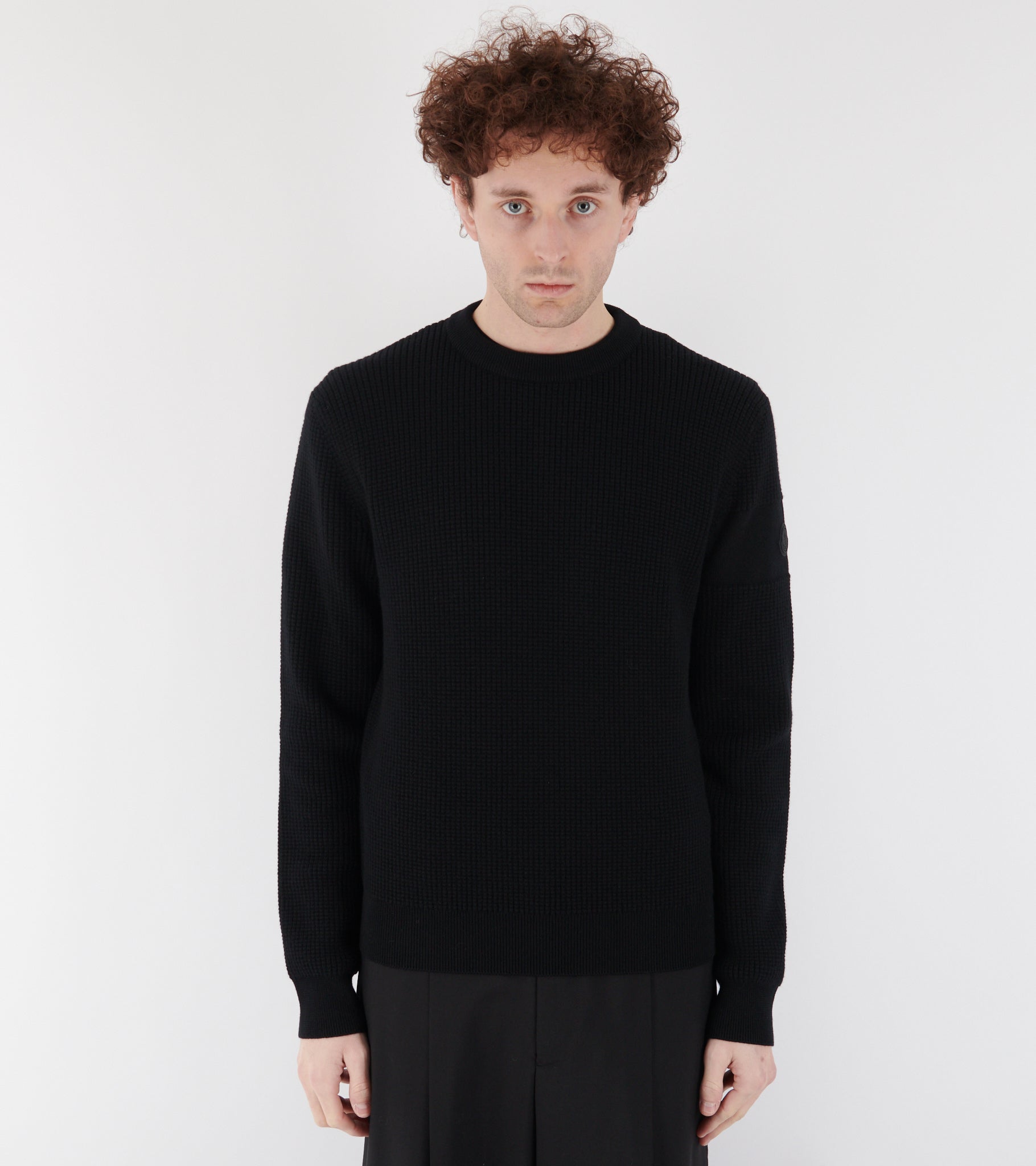 Black waffle knit in wool from Moncler. On the left sleeve is the iconic logo in black silicone.