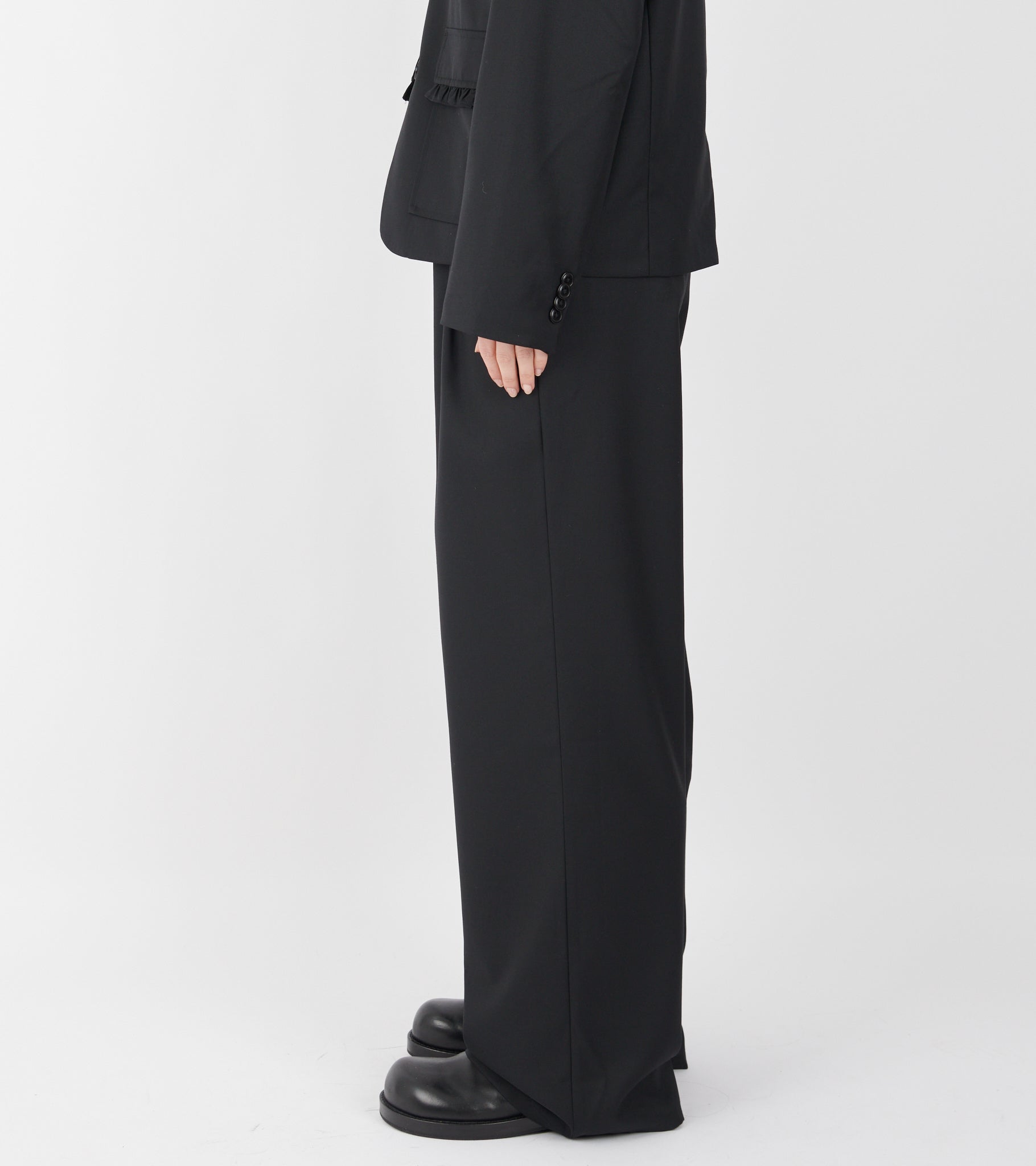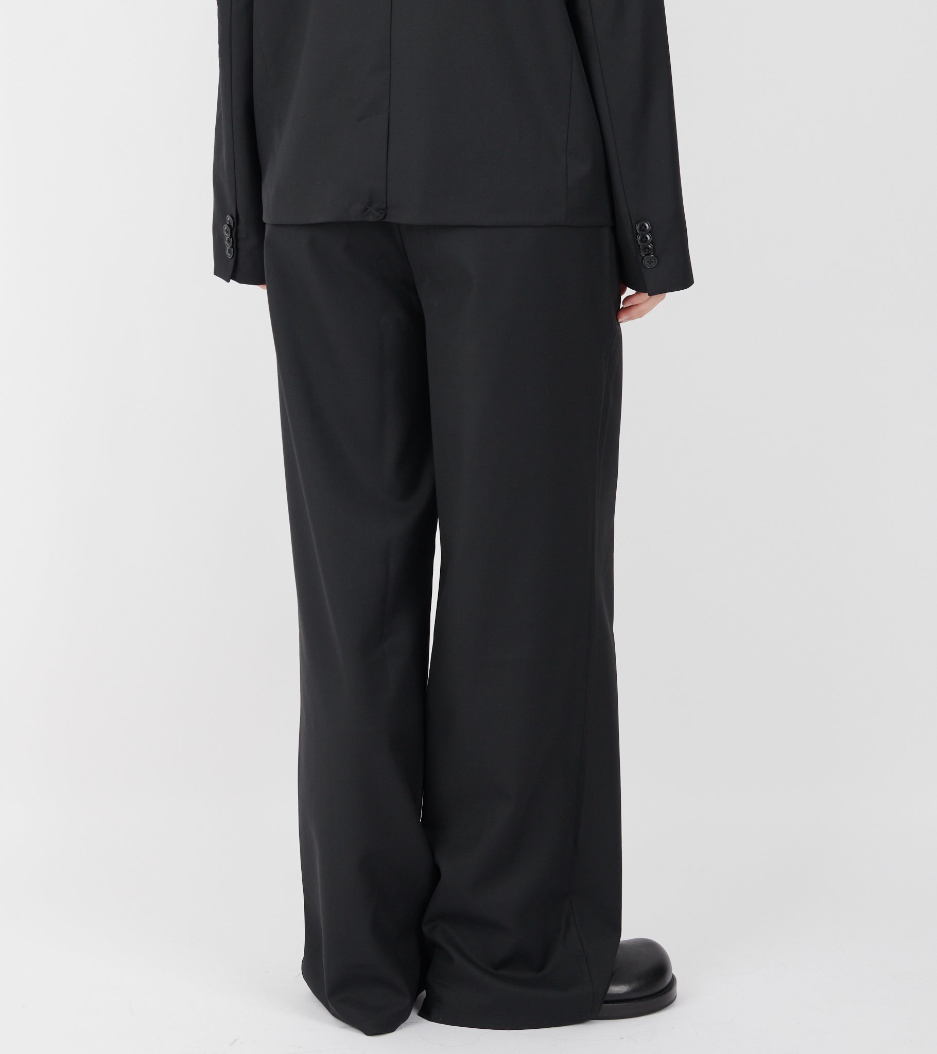 Black trousers in an organic wool blend from OperaSPORT. Nora Trousers have belt loops, pleats on the front, a slanted pocket on each side and two slit pockets on the back. The trousers have wide legs.
