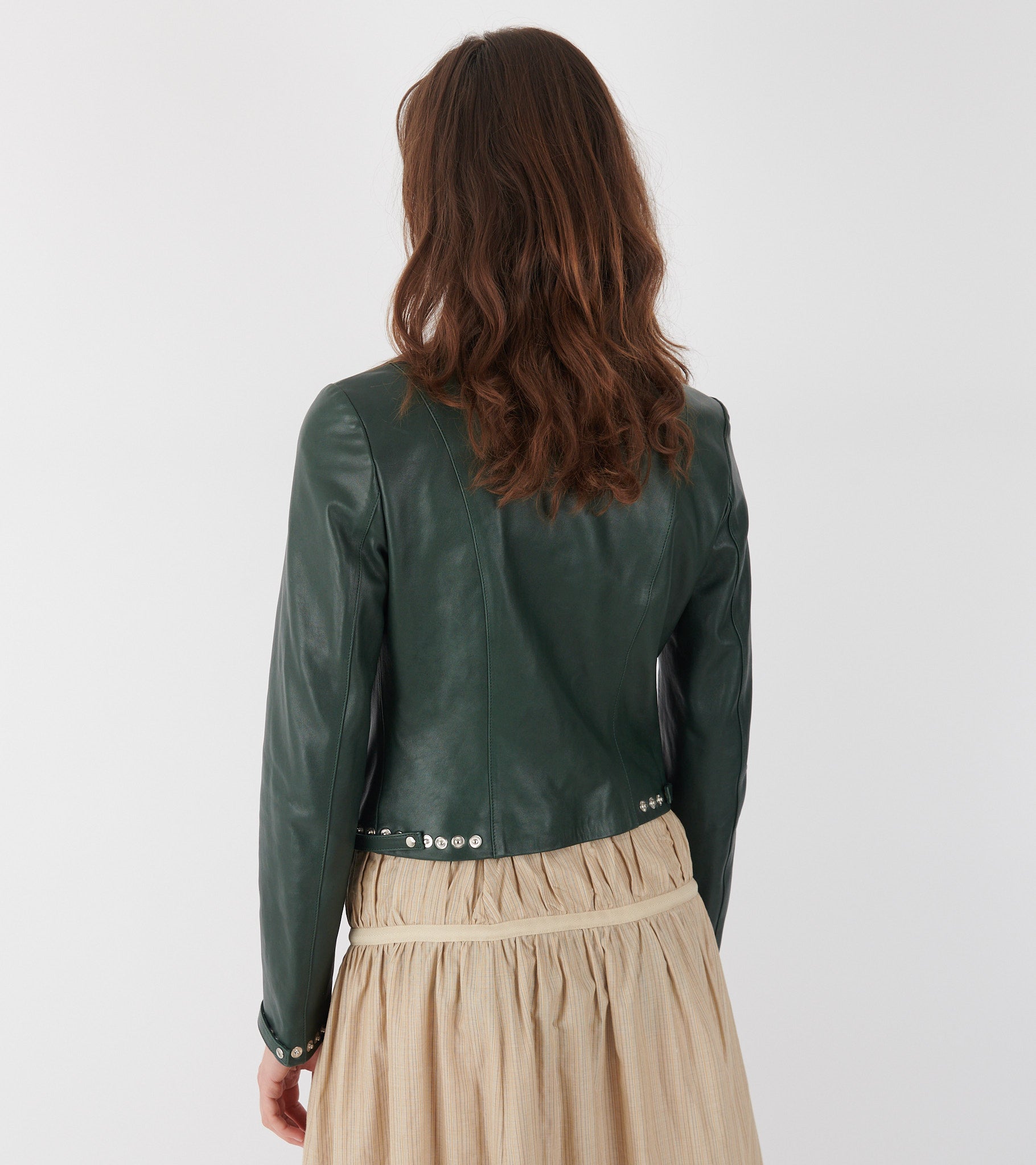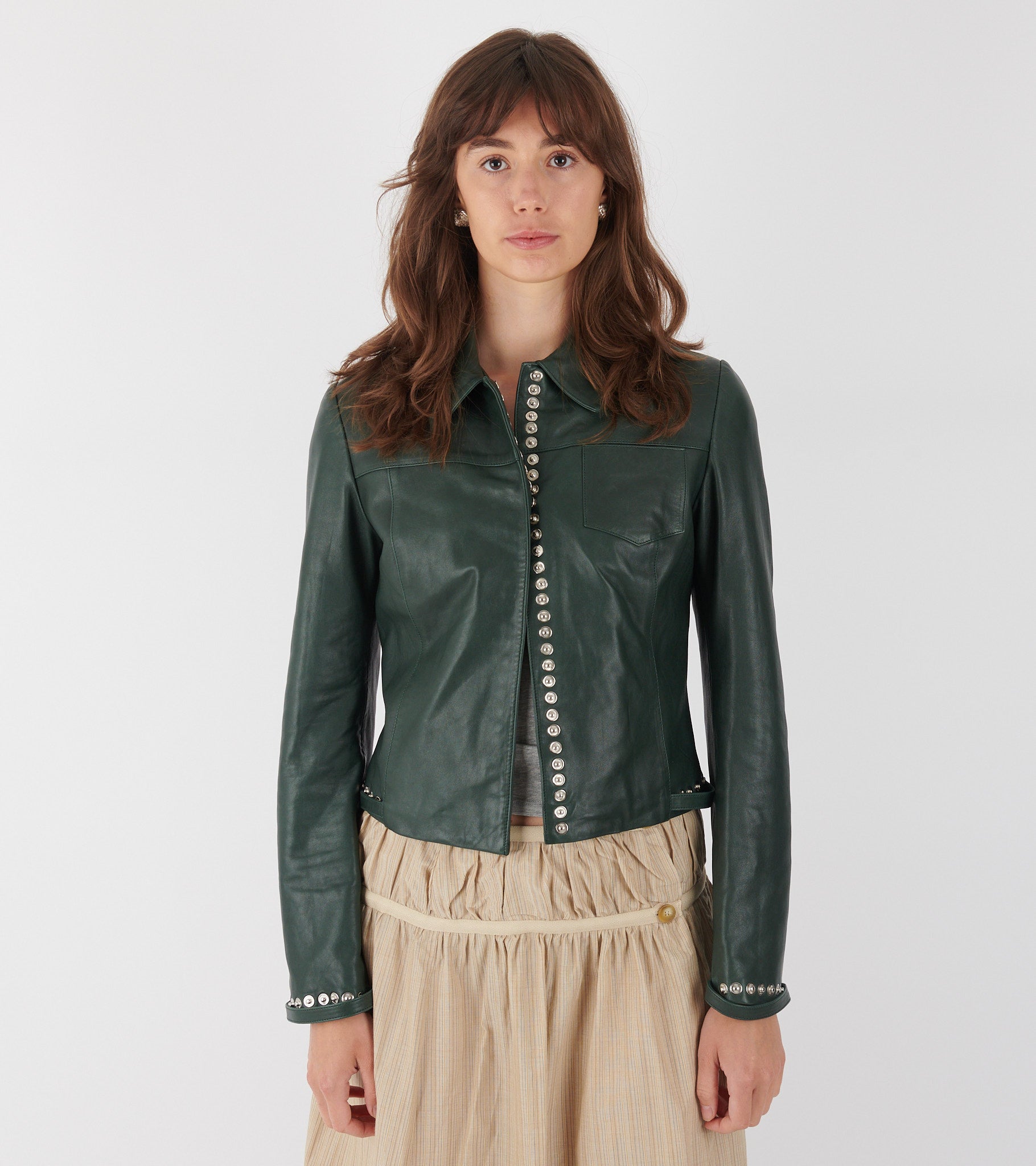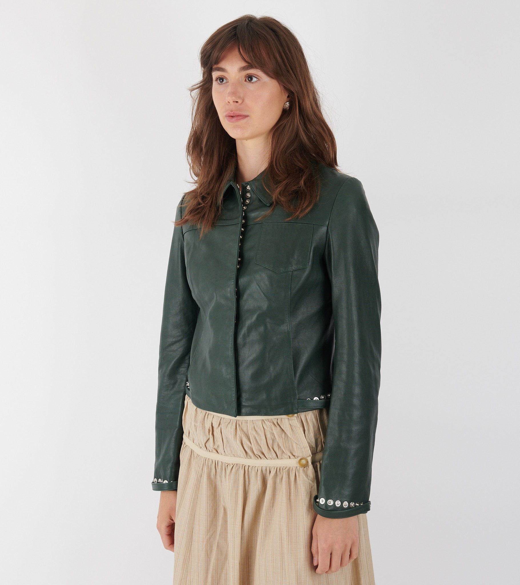 Dark green leather jacket with snap buttons from Paloma Wool.