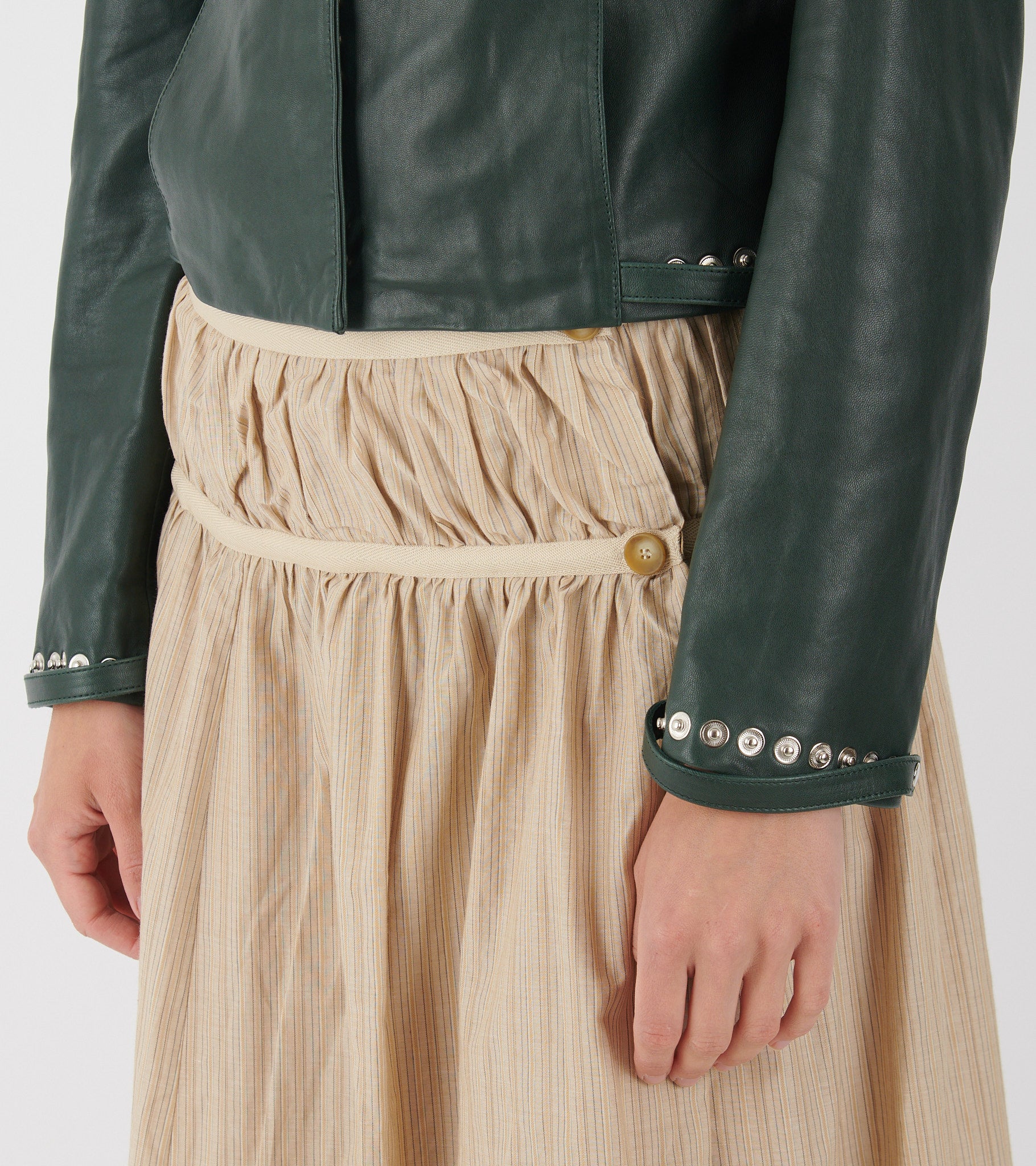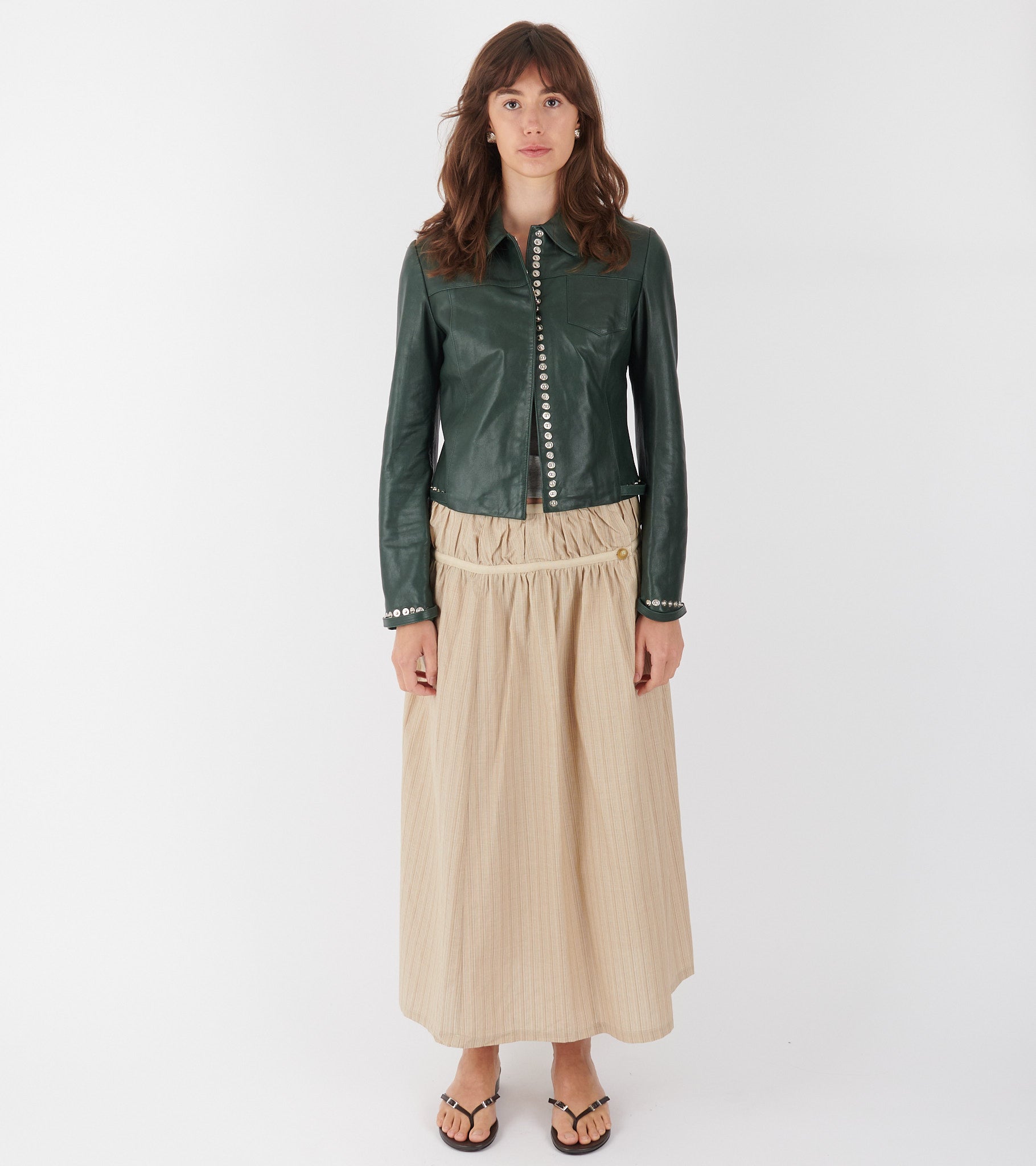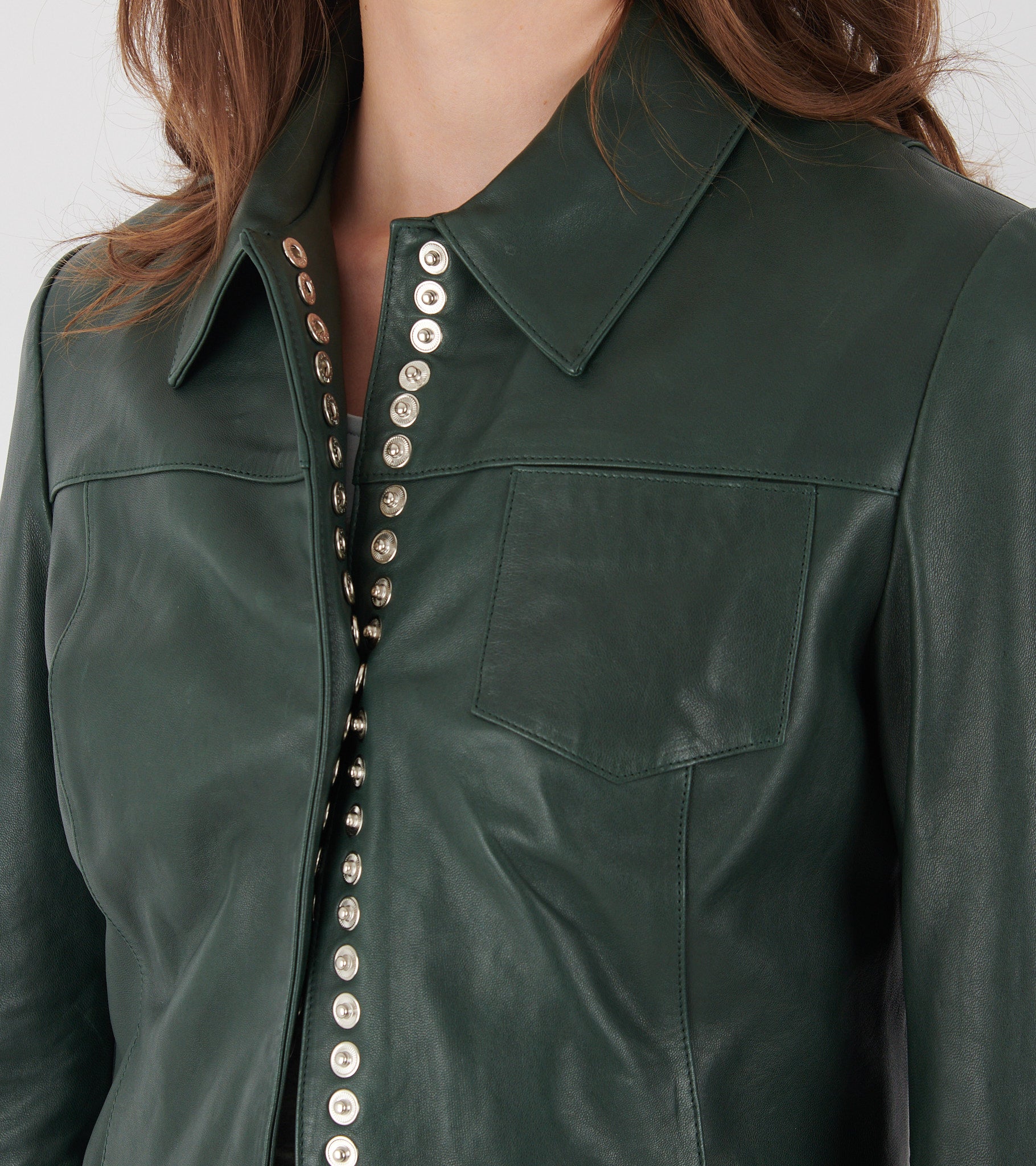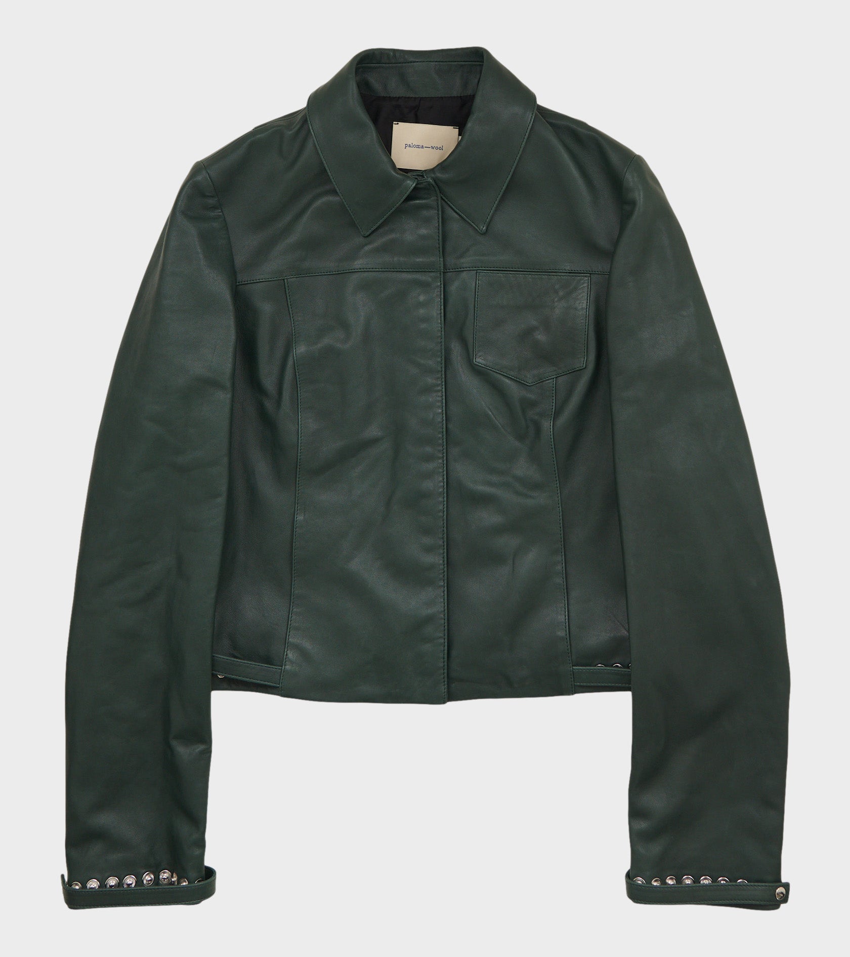 Dark green leather jacket with snap buttons from Paloma Wool.