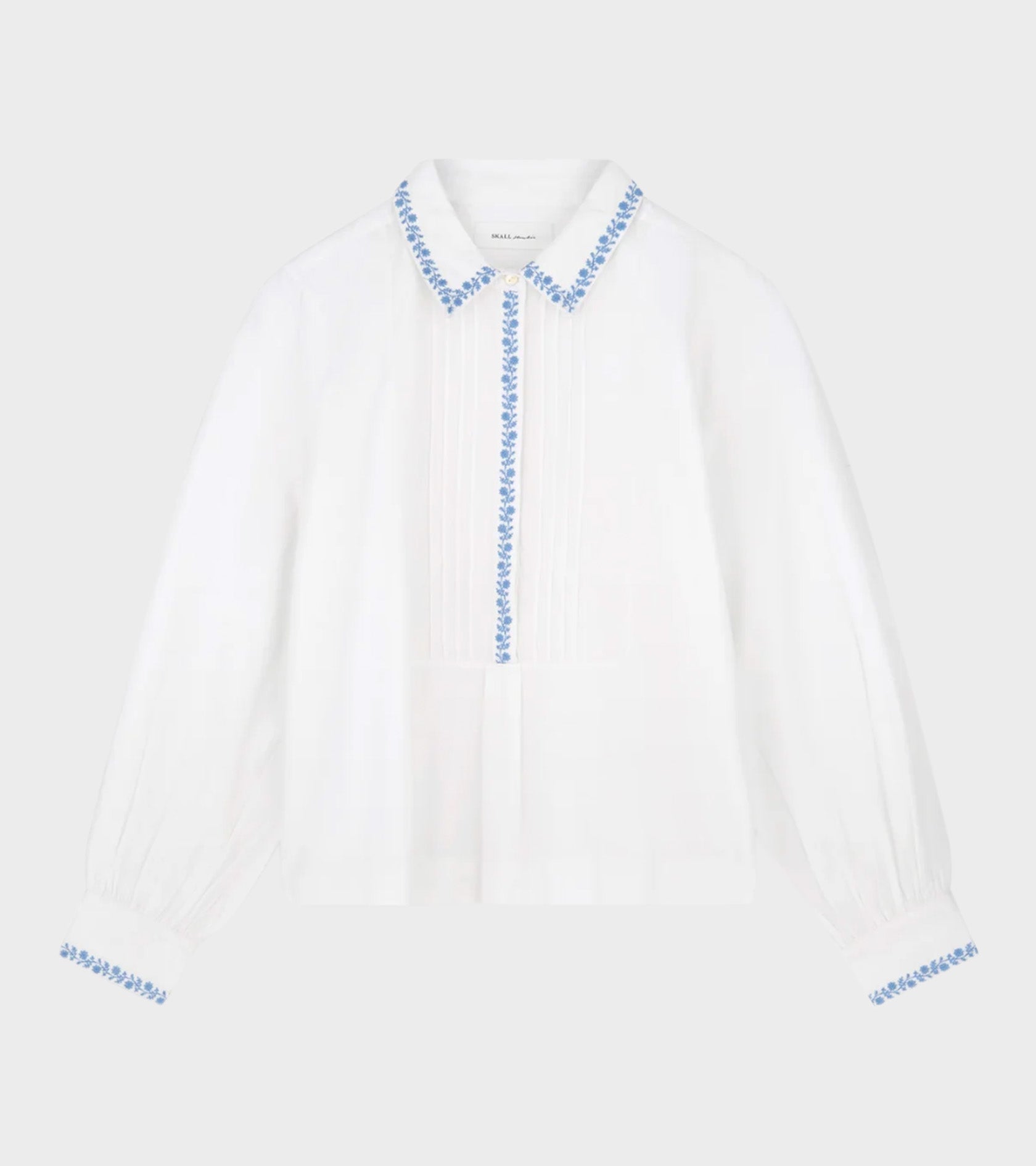 White shirt with light blue embroidered details from Skall Studio.