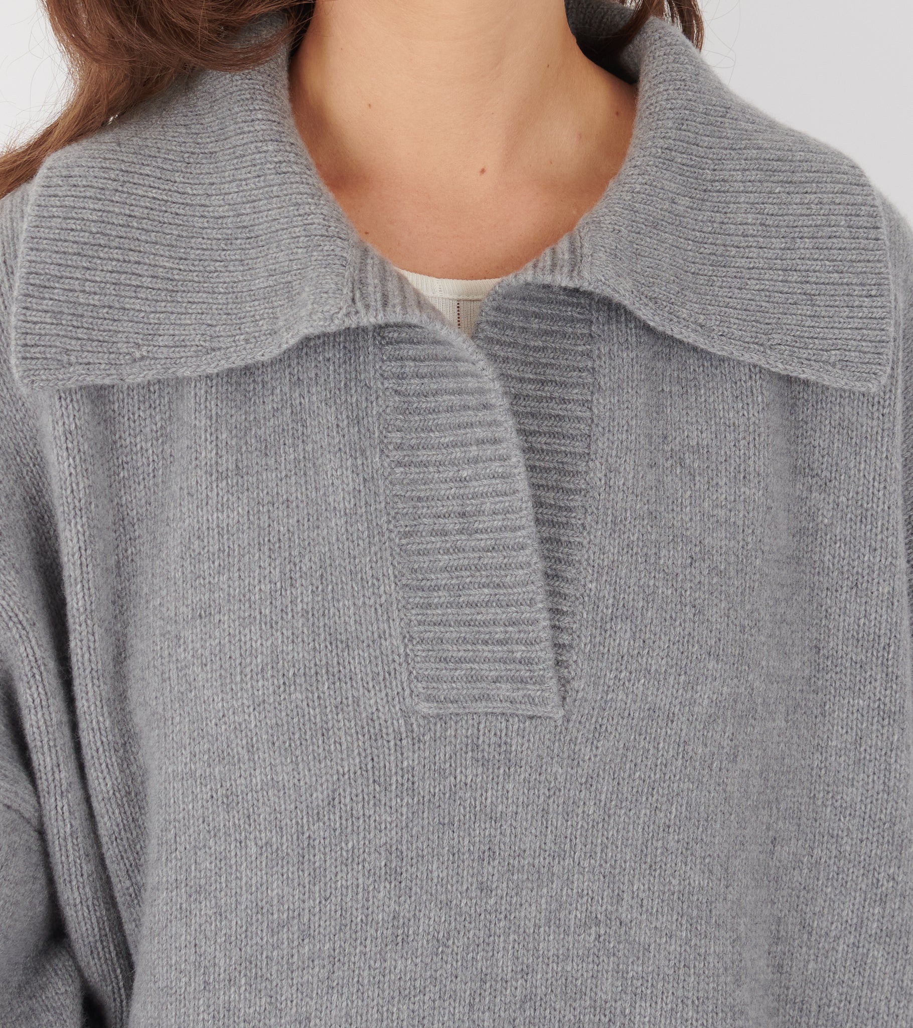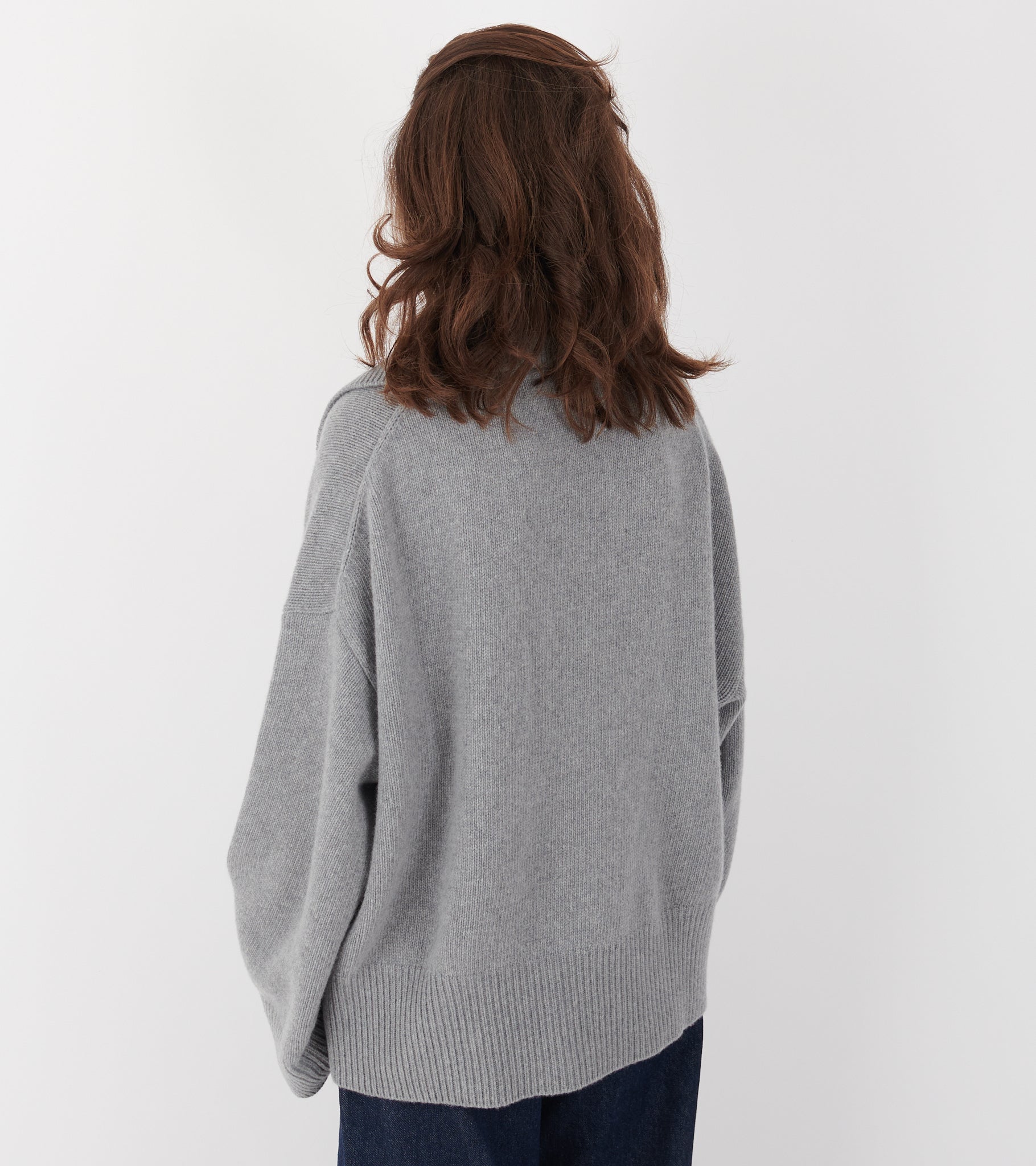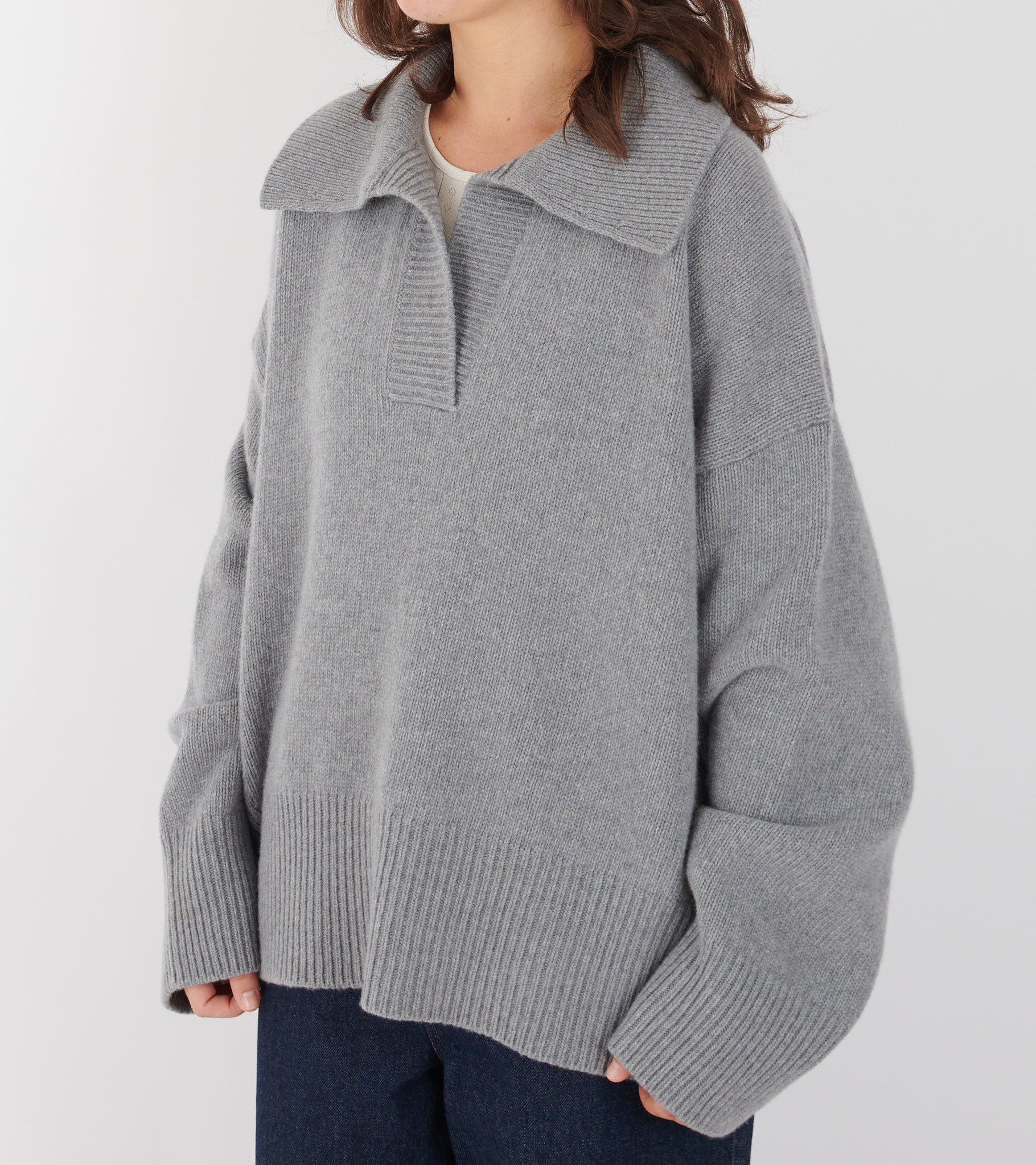 Grey knit in merino wool from Skall Studio. Dean V-neck Jumper has a crossed v-neck, a wide collar, dropped shoulders, wide sleeves and rib knitted edges.