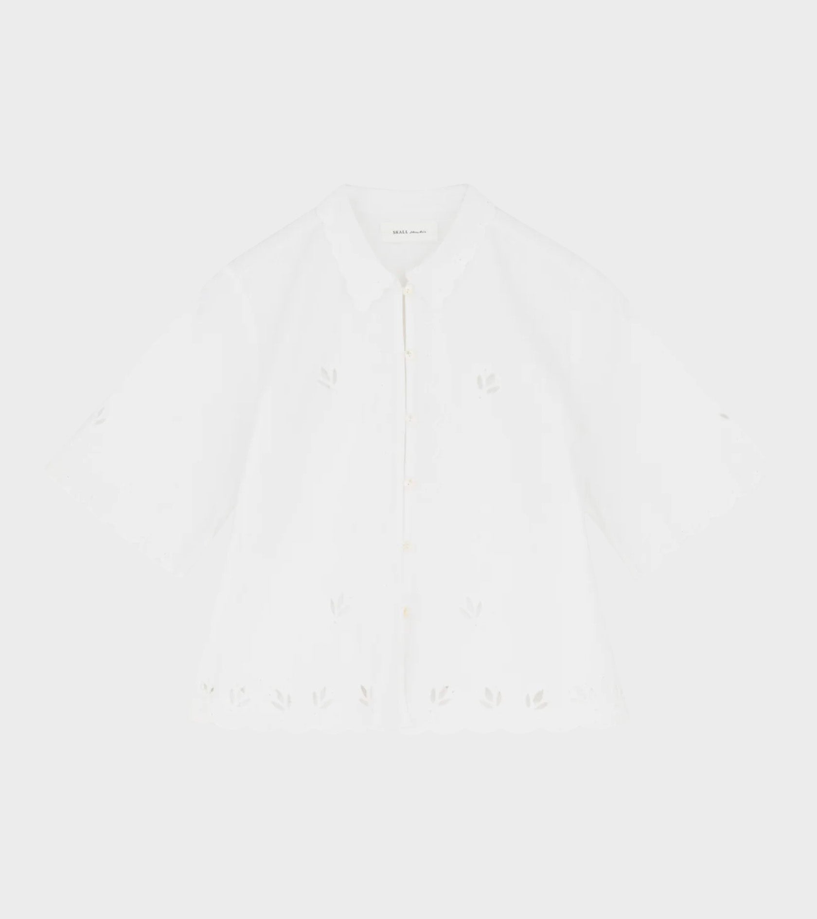 White short-sleeved shirt with embroidery details and cutouts from Skall Studio. Fleurie Shirt has a classic collar, half-length sleeves and a button closure all the way down the front.