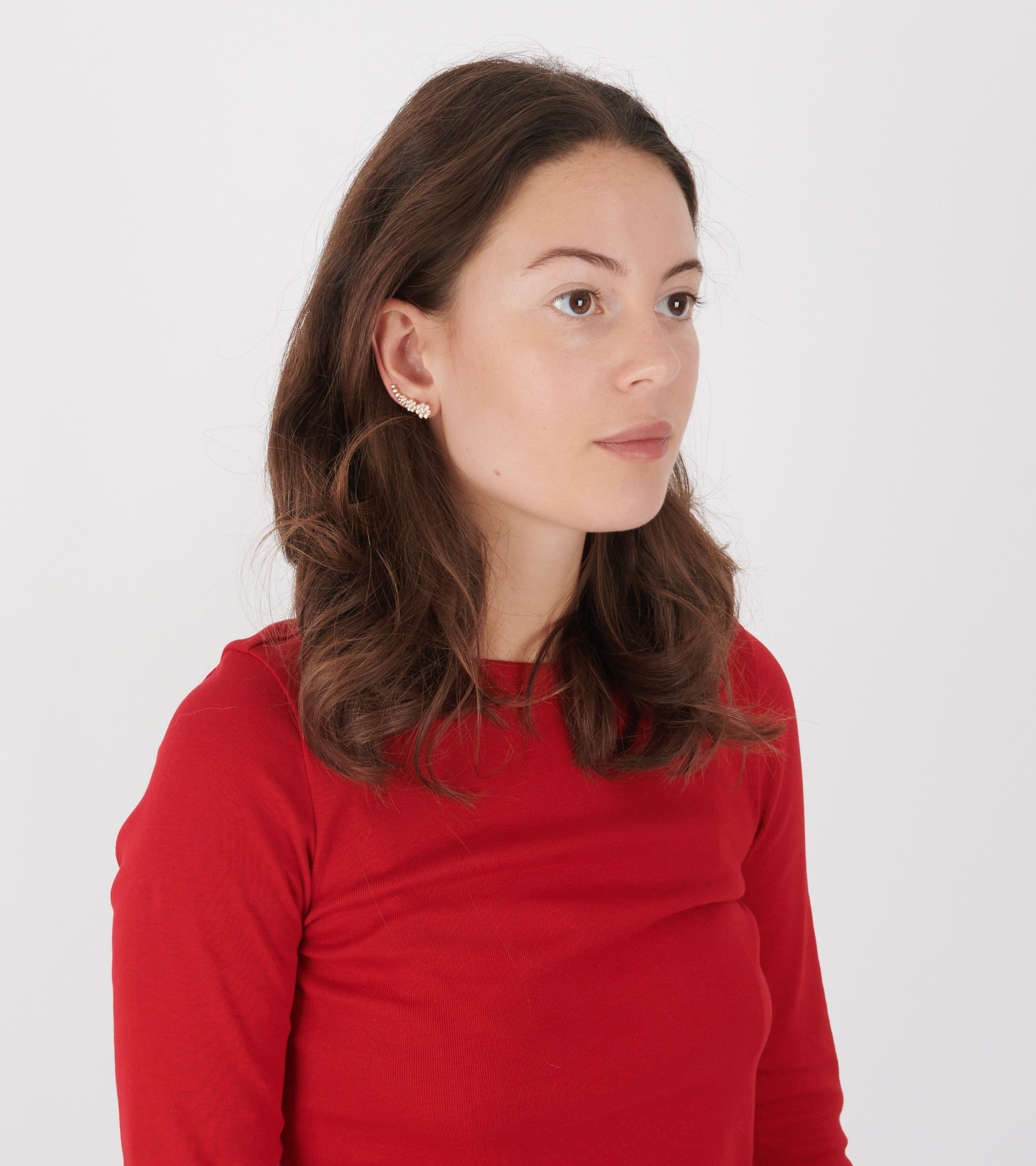 Long earring with flowers from Sophie Bille Brahe. This earring is for the right ear. It is made of 18 carat certified recycled gold and is detailed with 0.57 carats of Top Wesselton VVS diamonds.
