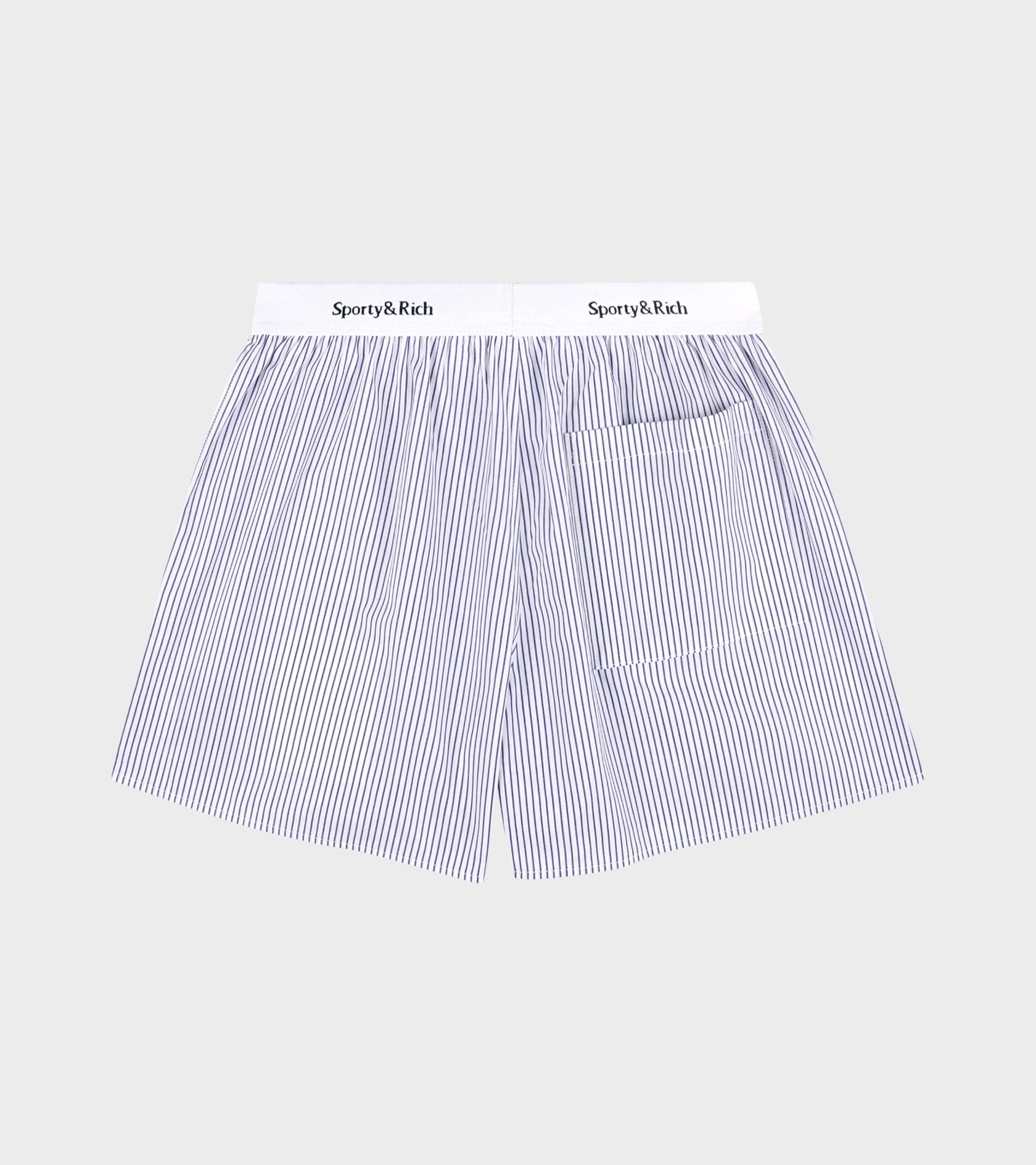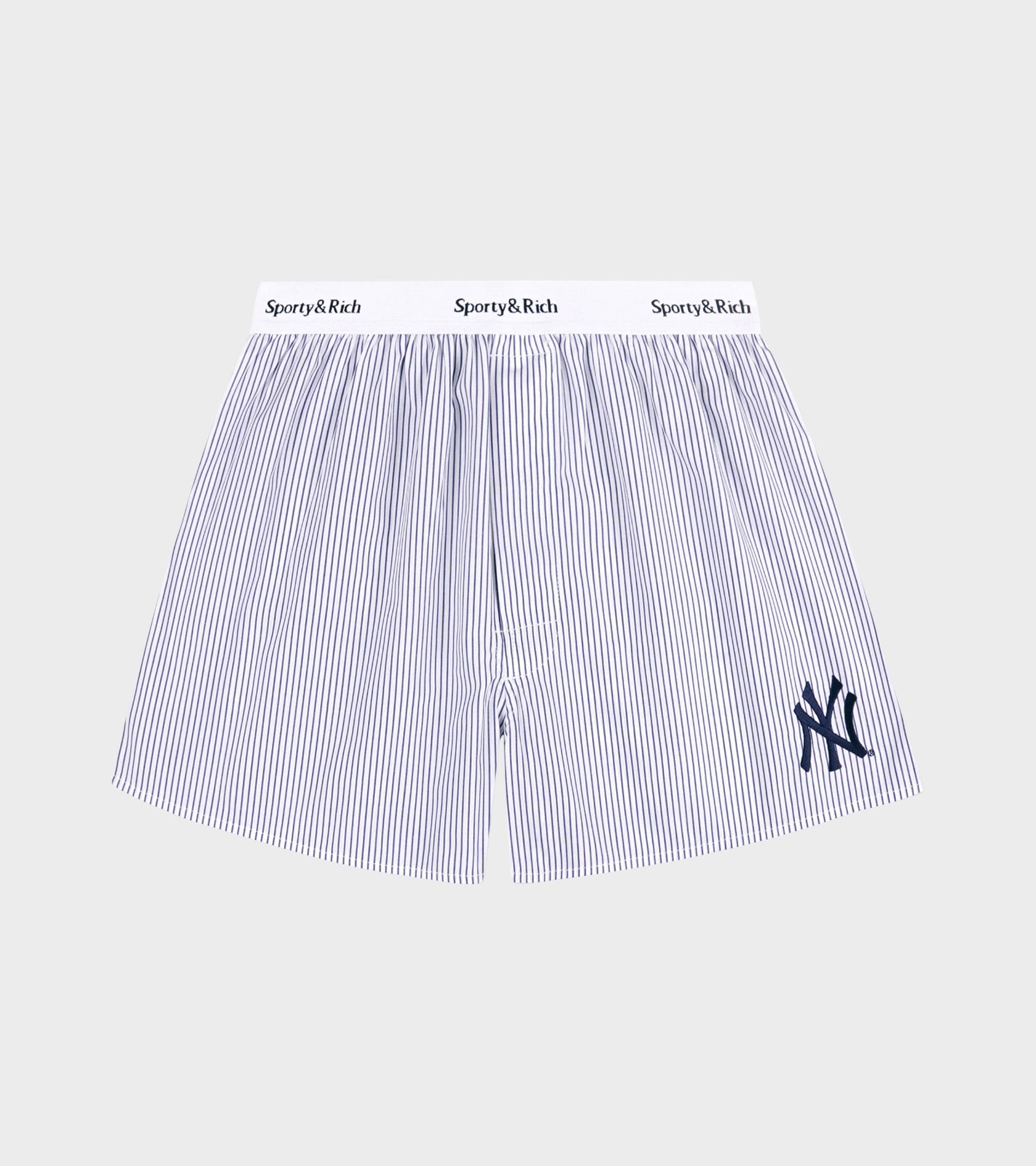 White boxers with navy stripes in cotton poplin from Sporty & Rich in collaboration with the New York Yankees.