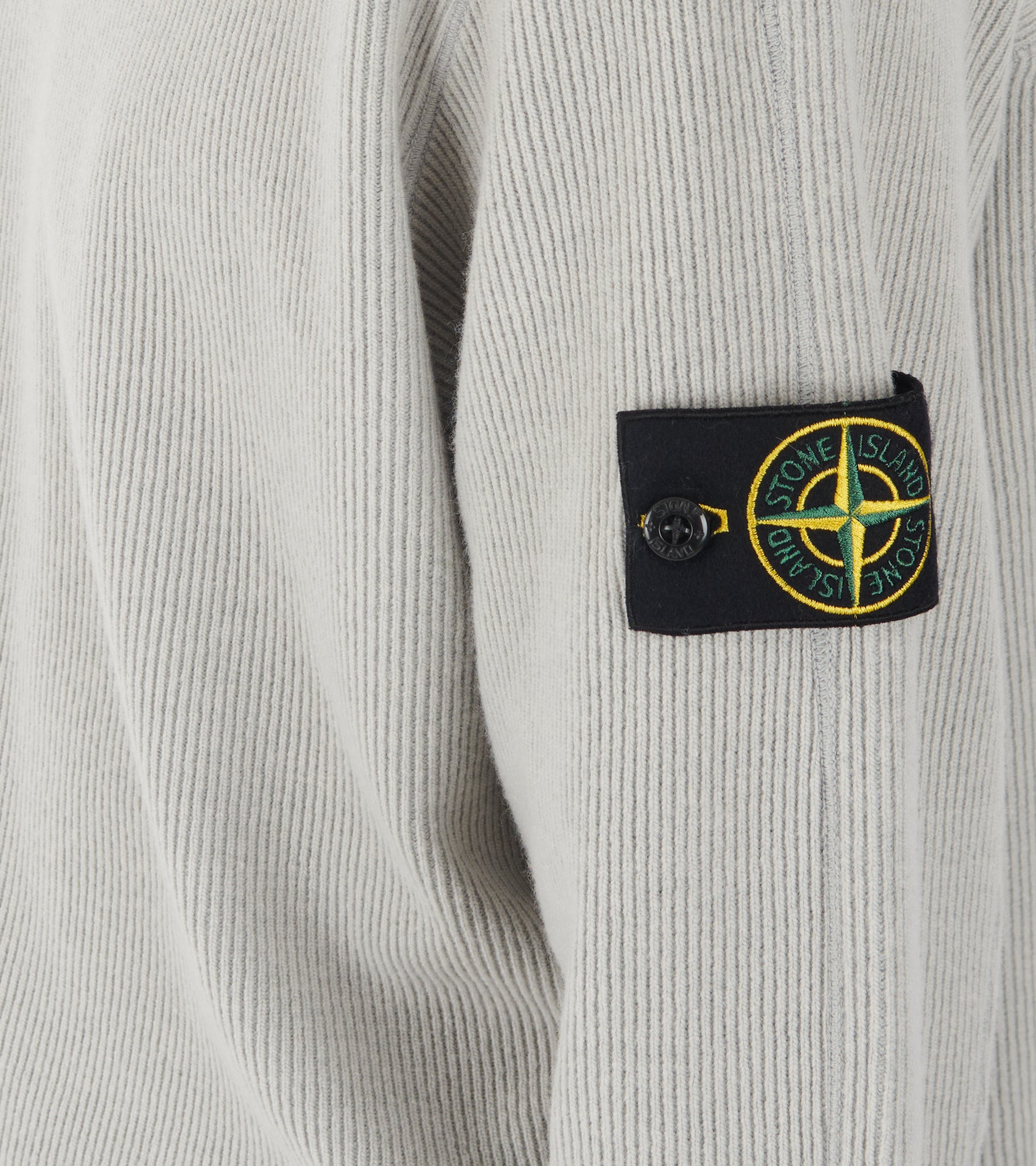 Light grey rib knit from Stone Island. On the left sleeve is the iconic Stone Patch.
