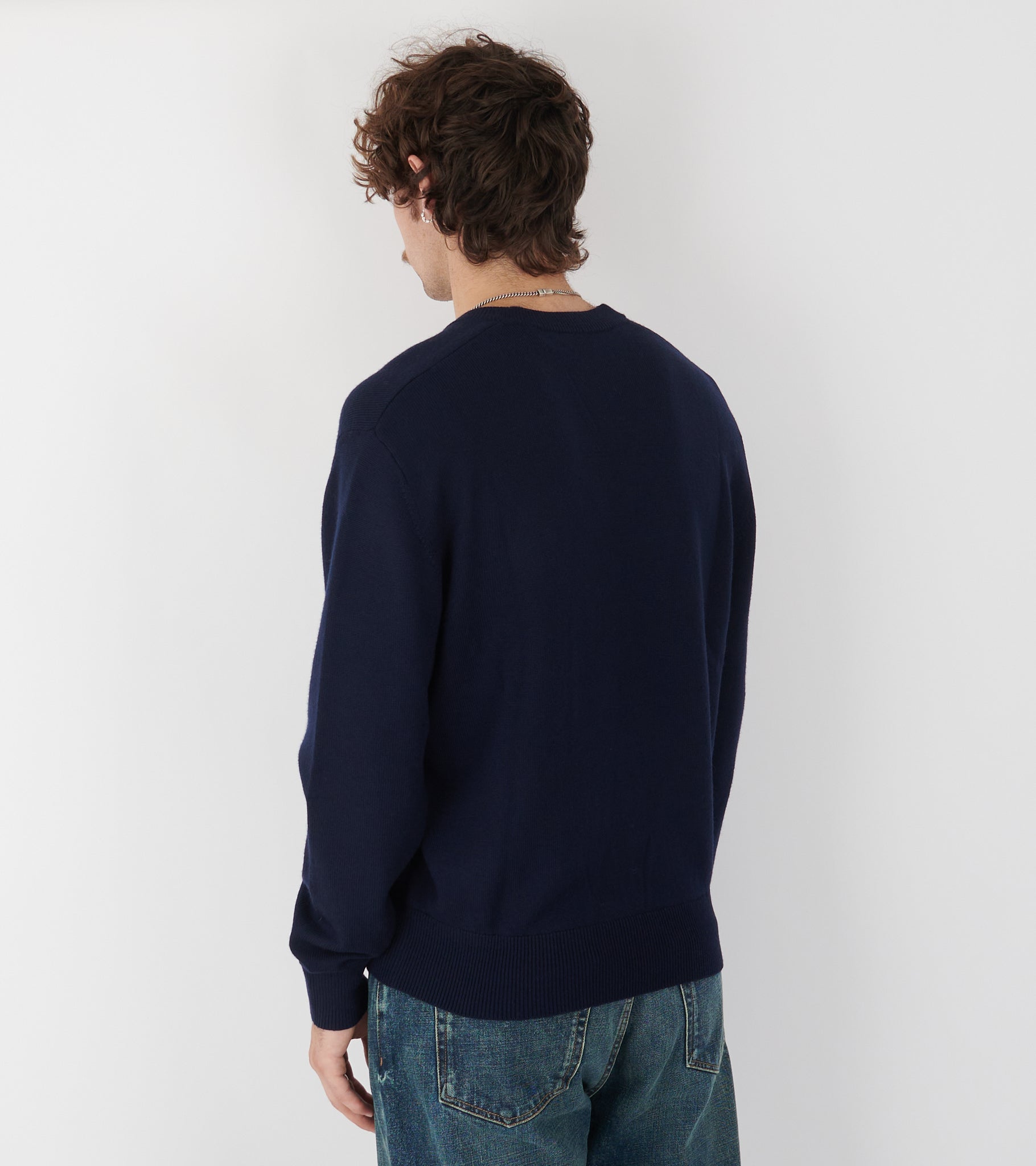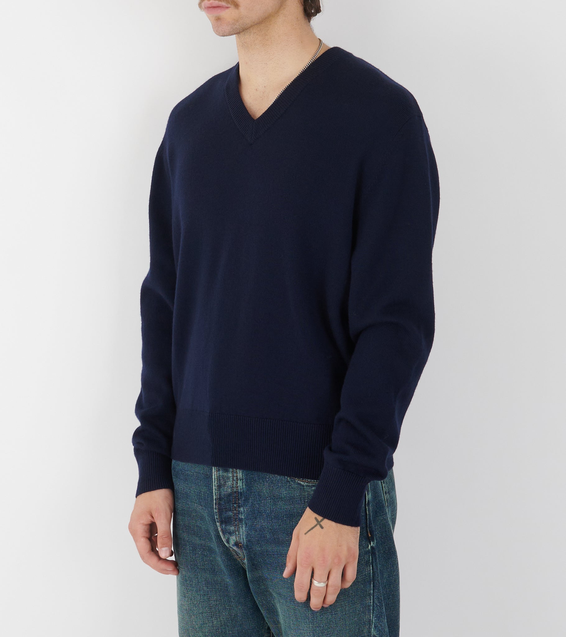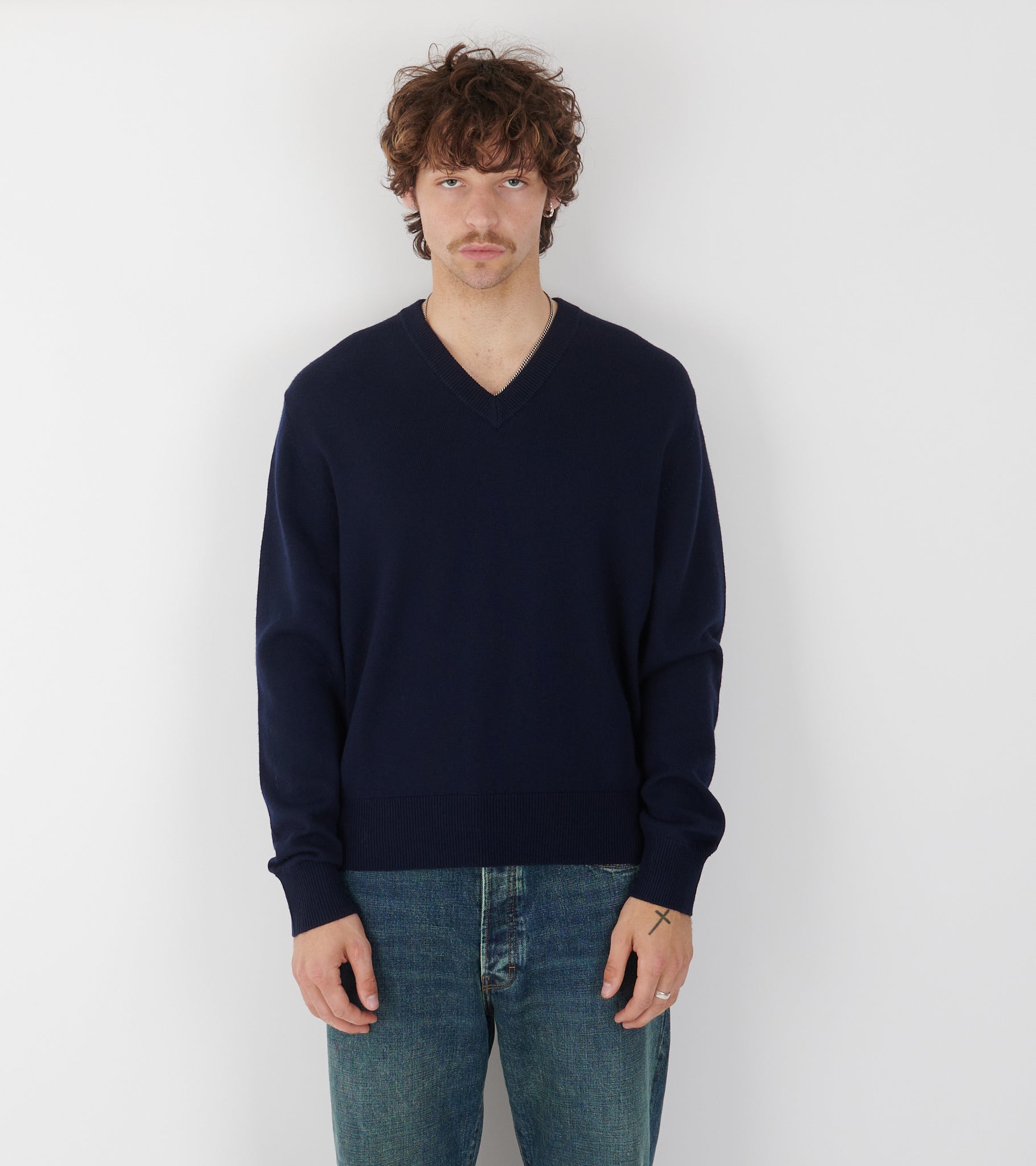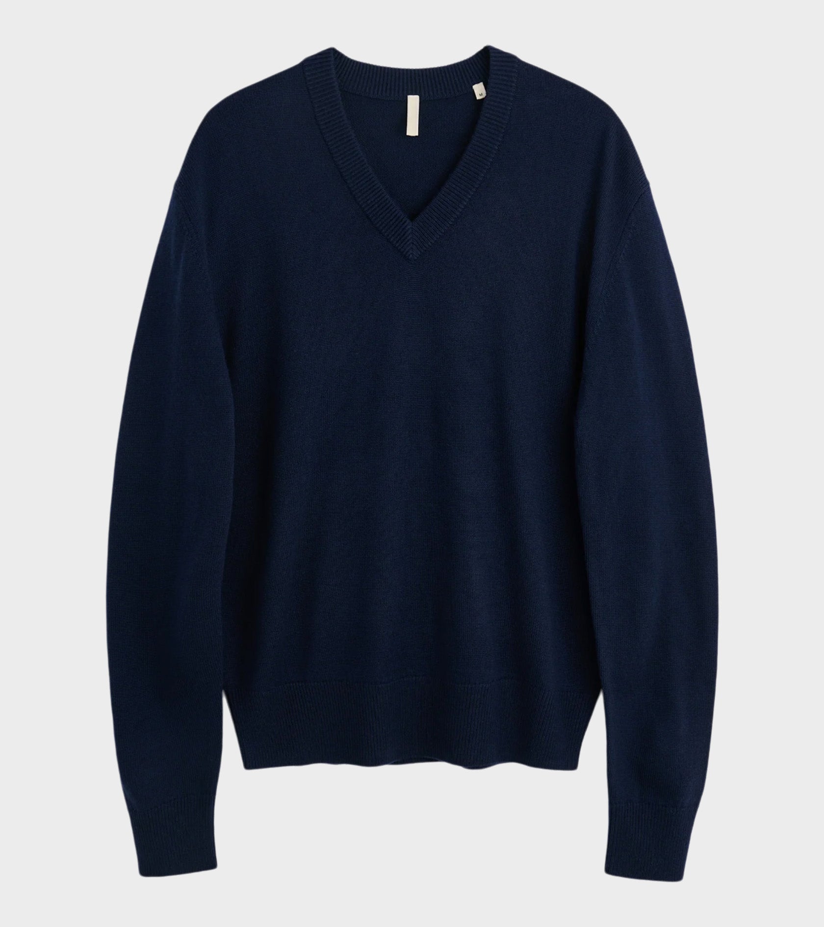 Navy knit with v-neck from Sunflower. Moon Merino V Neck is made of 100% merino wool and has rib knitted edges.