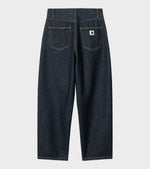 Dark blue jeans from Carhartt WIP. Brandon Pants Blue Rinsed Denim are made of 100% cotton denim. The pants have belt loops, a slant pocket on each side and two back pockets. On the back of one back pocket is the iconic logo. The fit is relaxed with straight legs.