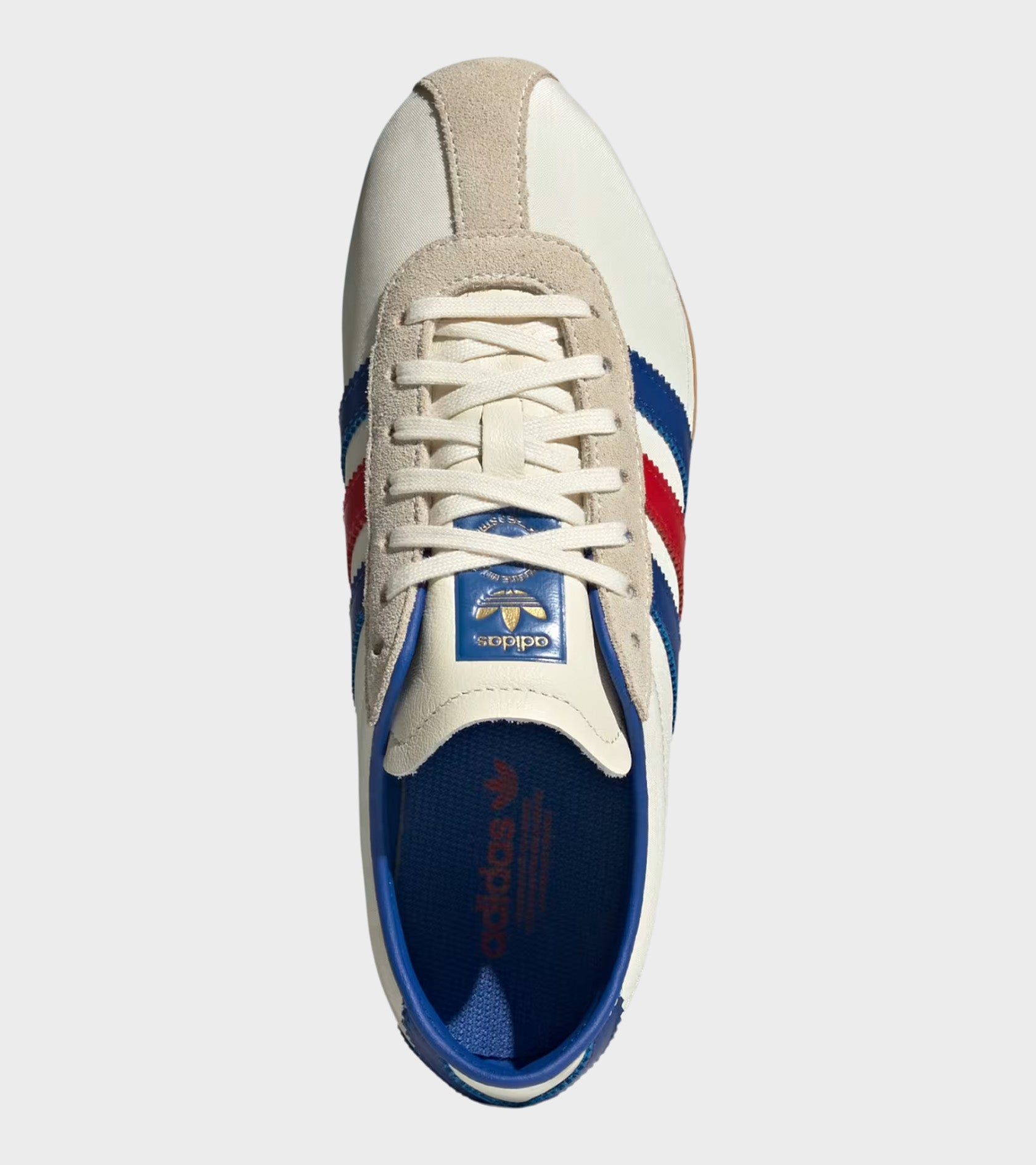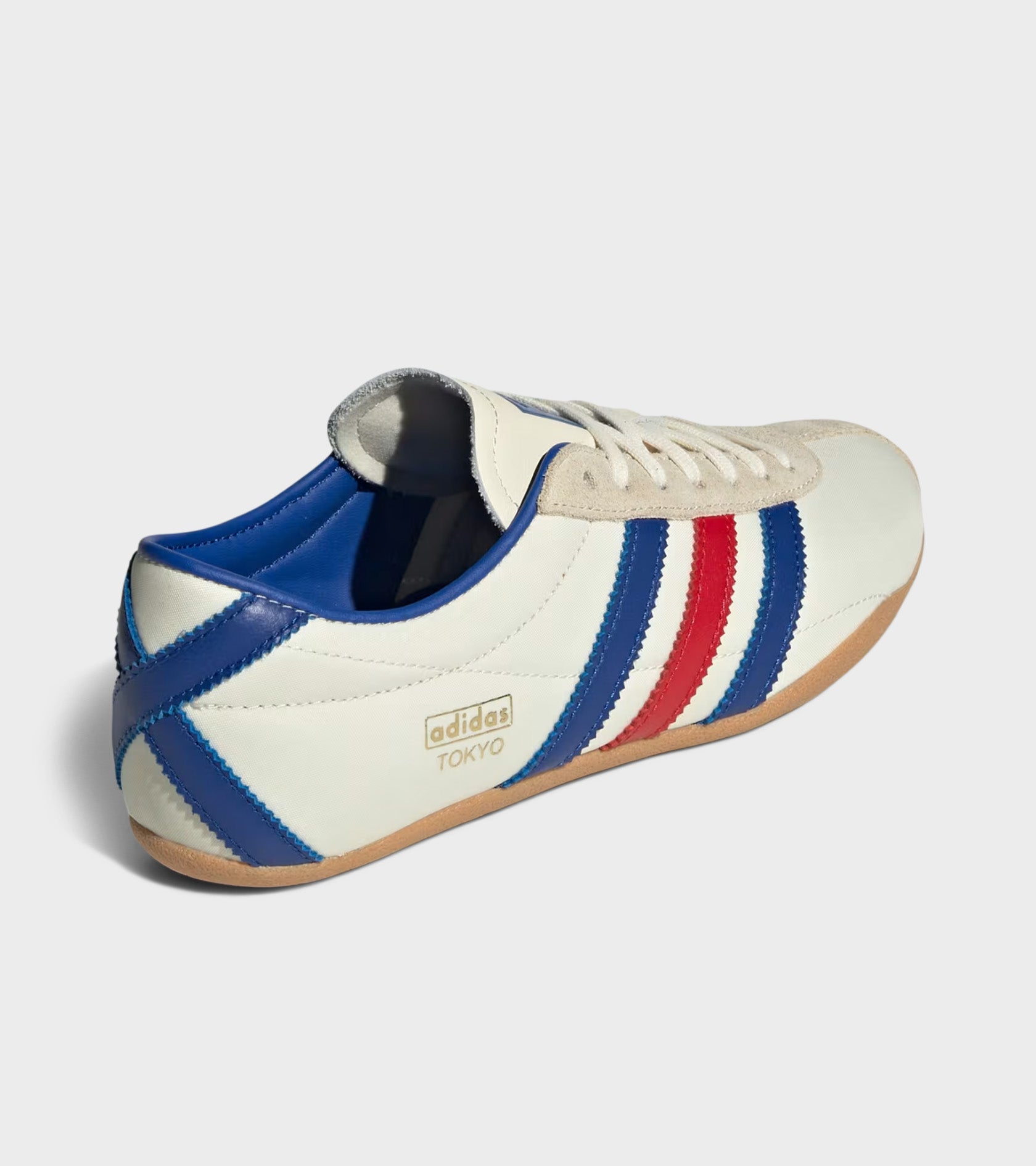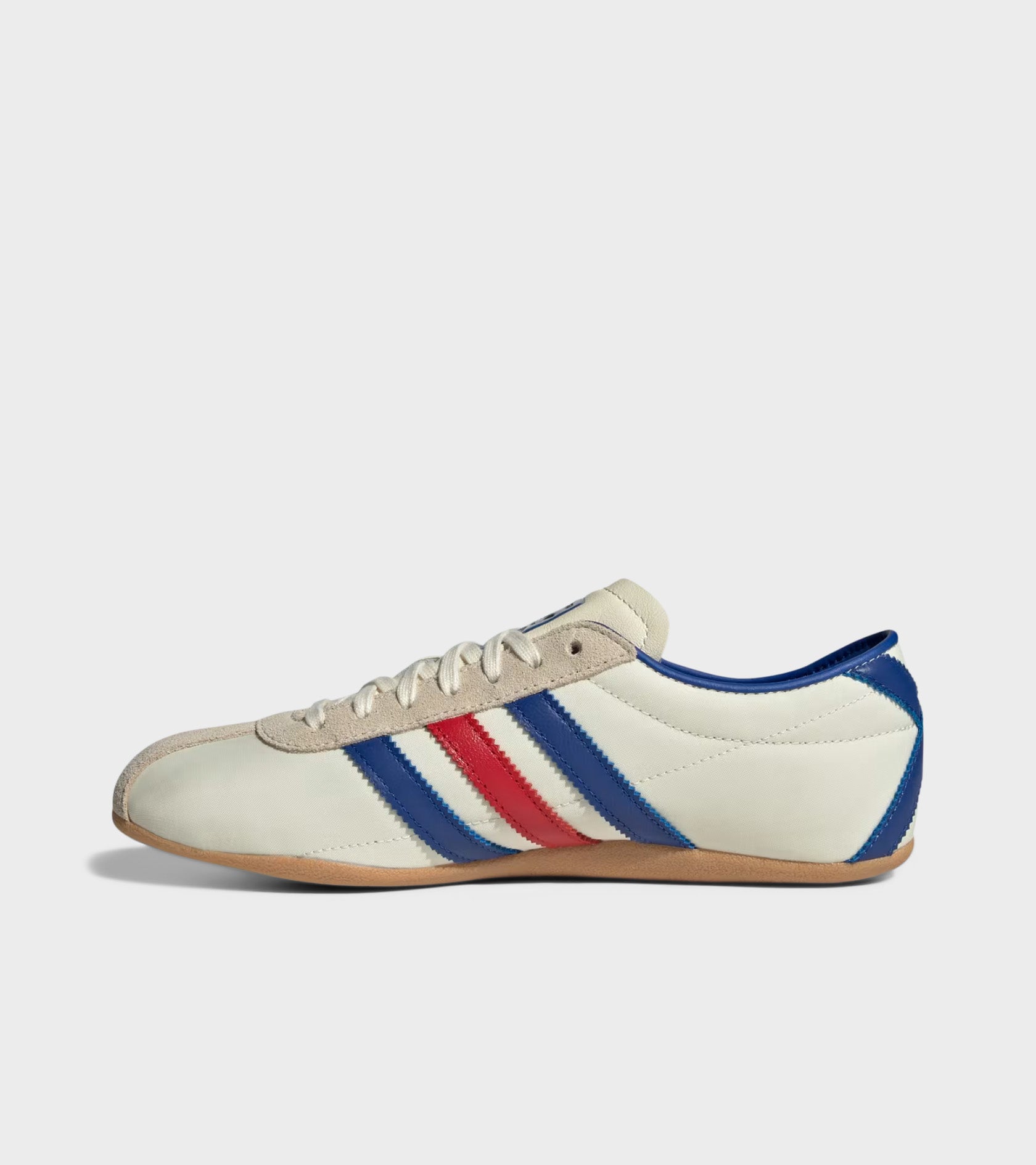 Tokyo W from Adidas in an off-white shade with cobalt blue and red details. The shoe has an upper in nylon mesh, suede overlays and leather details. On the side are the iconic stripes and a printed logo in gold. The sole is in undyed rubber.