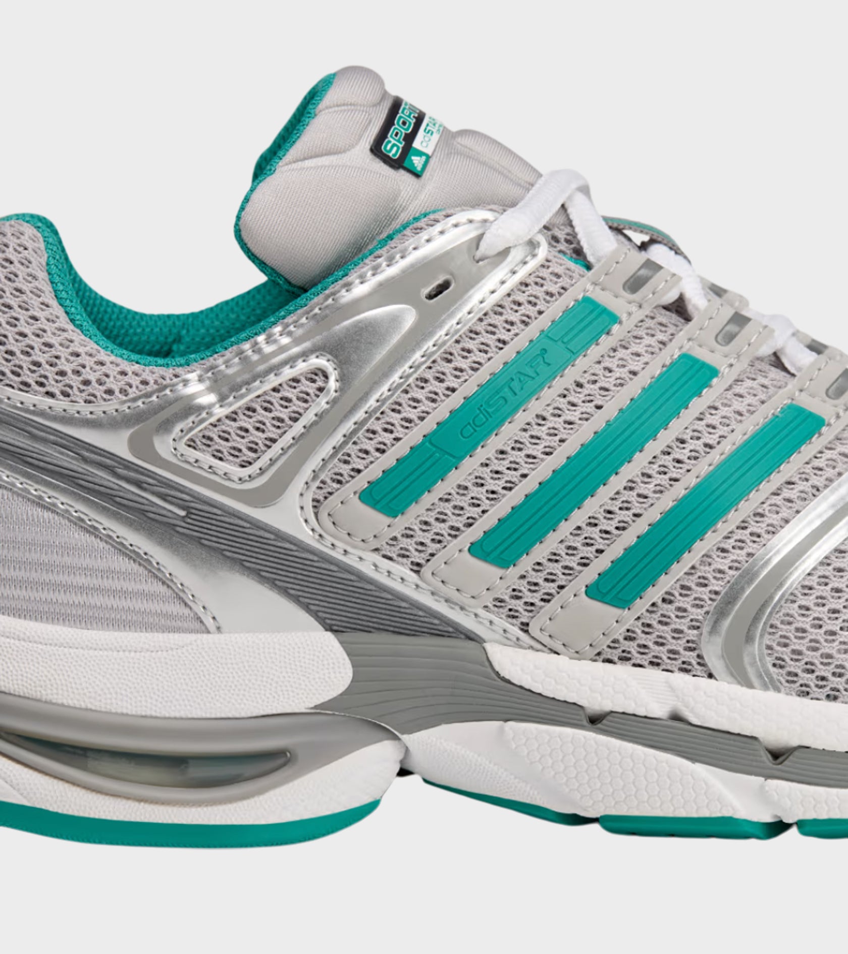 Adistar Control 5 from Adidas in collaboration with Sporty & Rich. These sneakers have a grey mesh upper with details in silver and teal. On the side are the iconic stripes.
