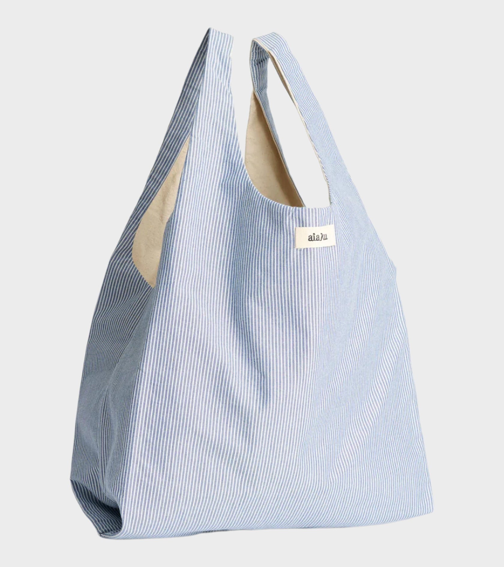 Striped bag in organic cotton canvas from Aiayu. On the front is a small logo.