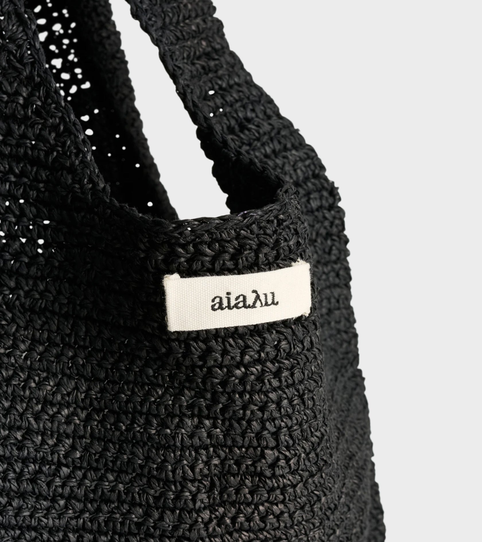 Black bag in paper raffia from Aiayu. On the front is a small logo.