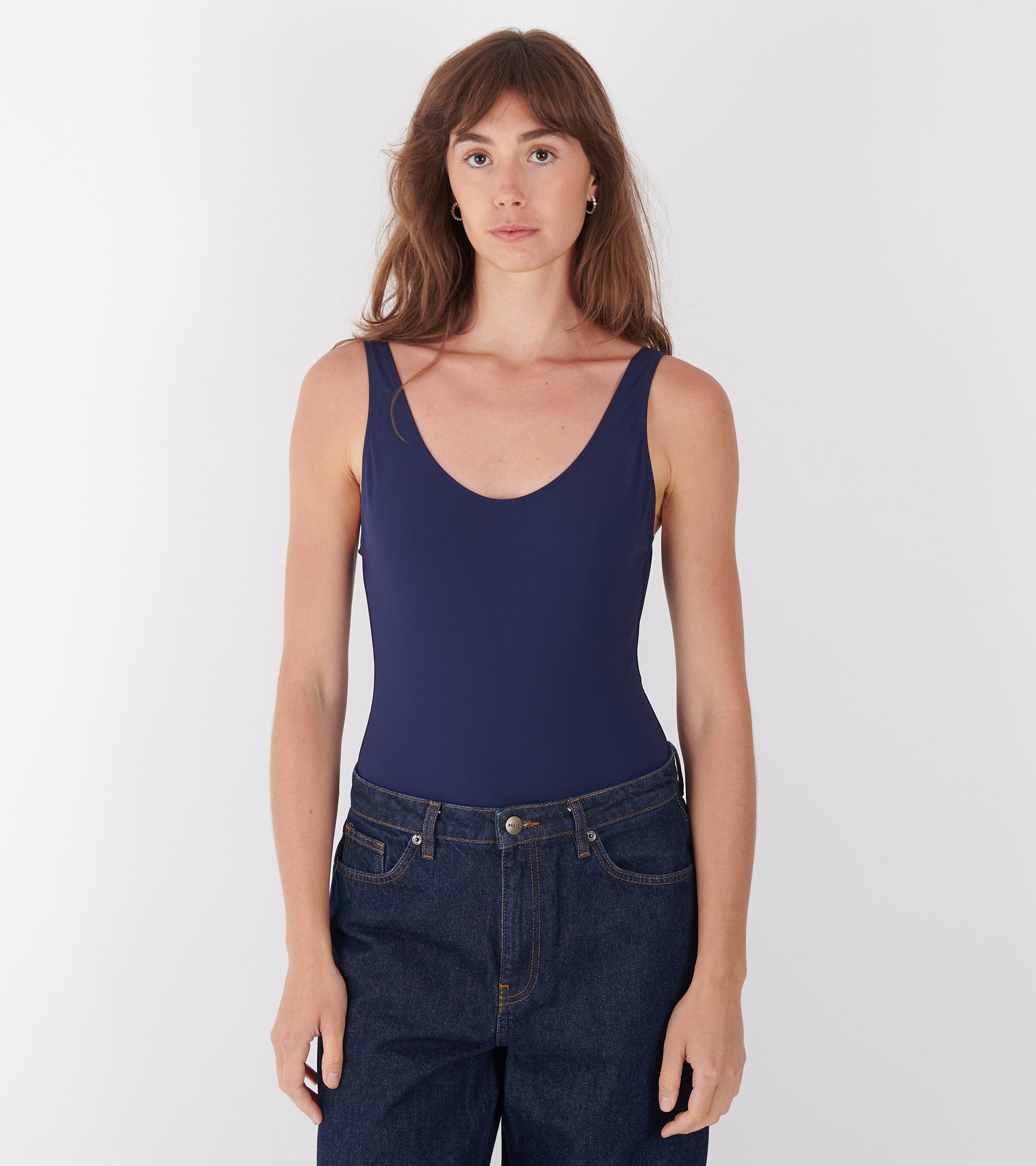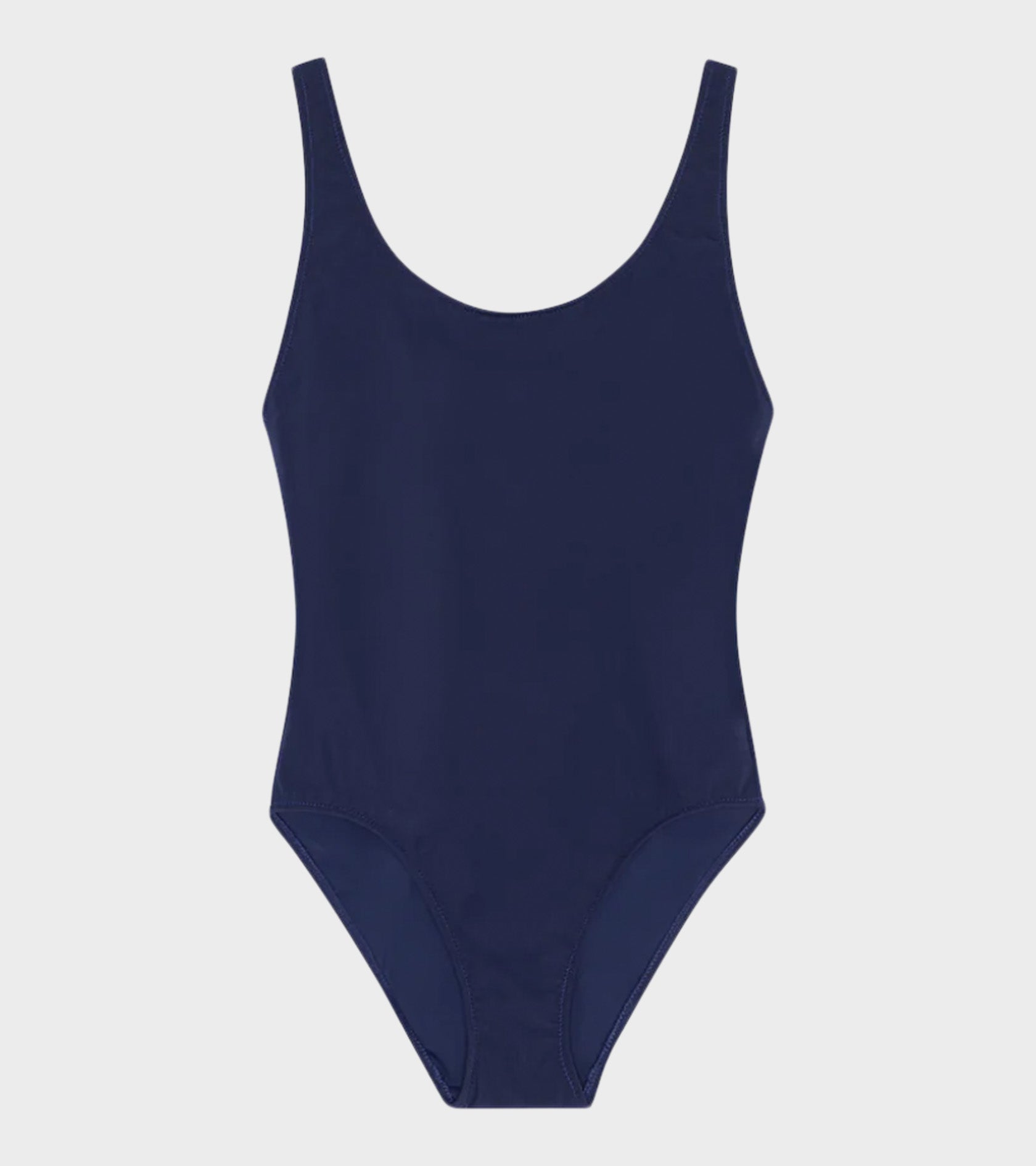 Navy swimsuit from Alipo. The swimsuit has a deep round neckline at the back.
