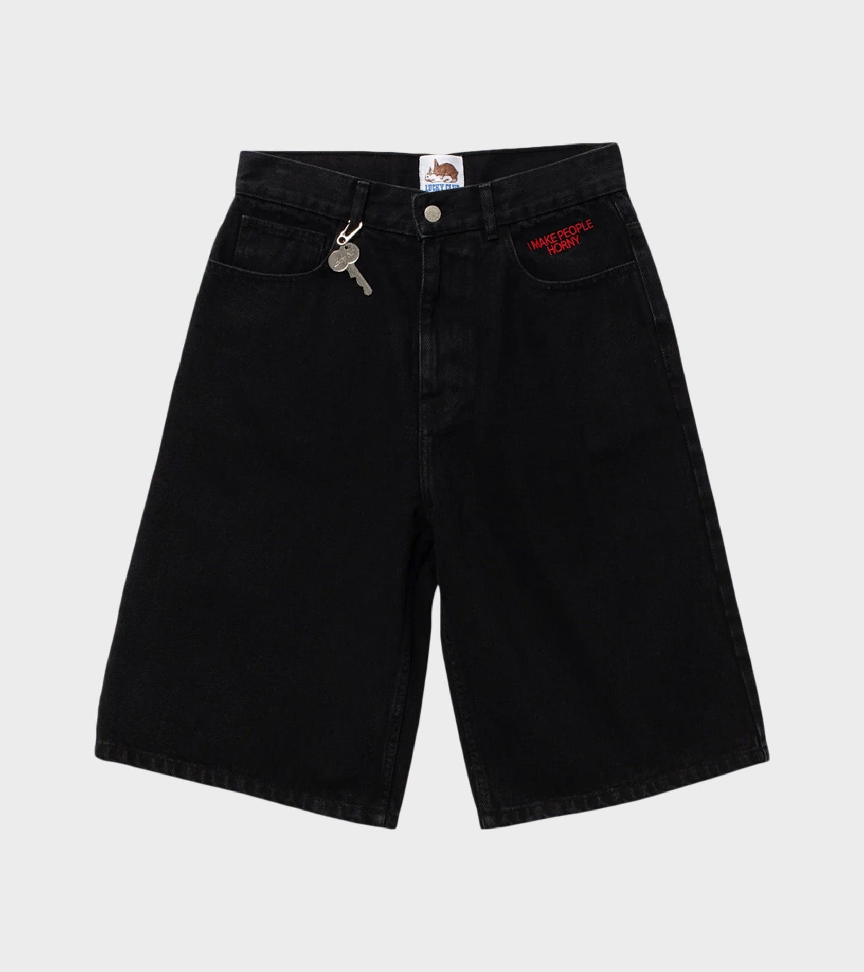 Black shorts in organic cotton denim from Carne Bollente. Heart On, Hard On Shorts have belt loops, a classic 5-pocket design and white embroidered hearts on the back pockets. At the top is the text 'I make people horny' embroidered in red. A removable key is included.